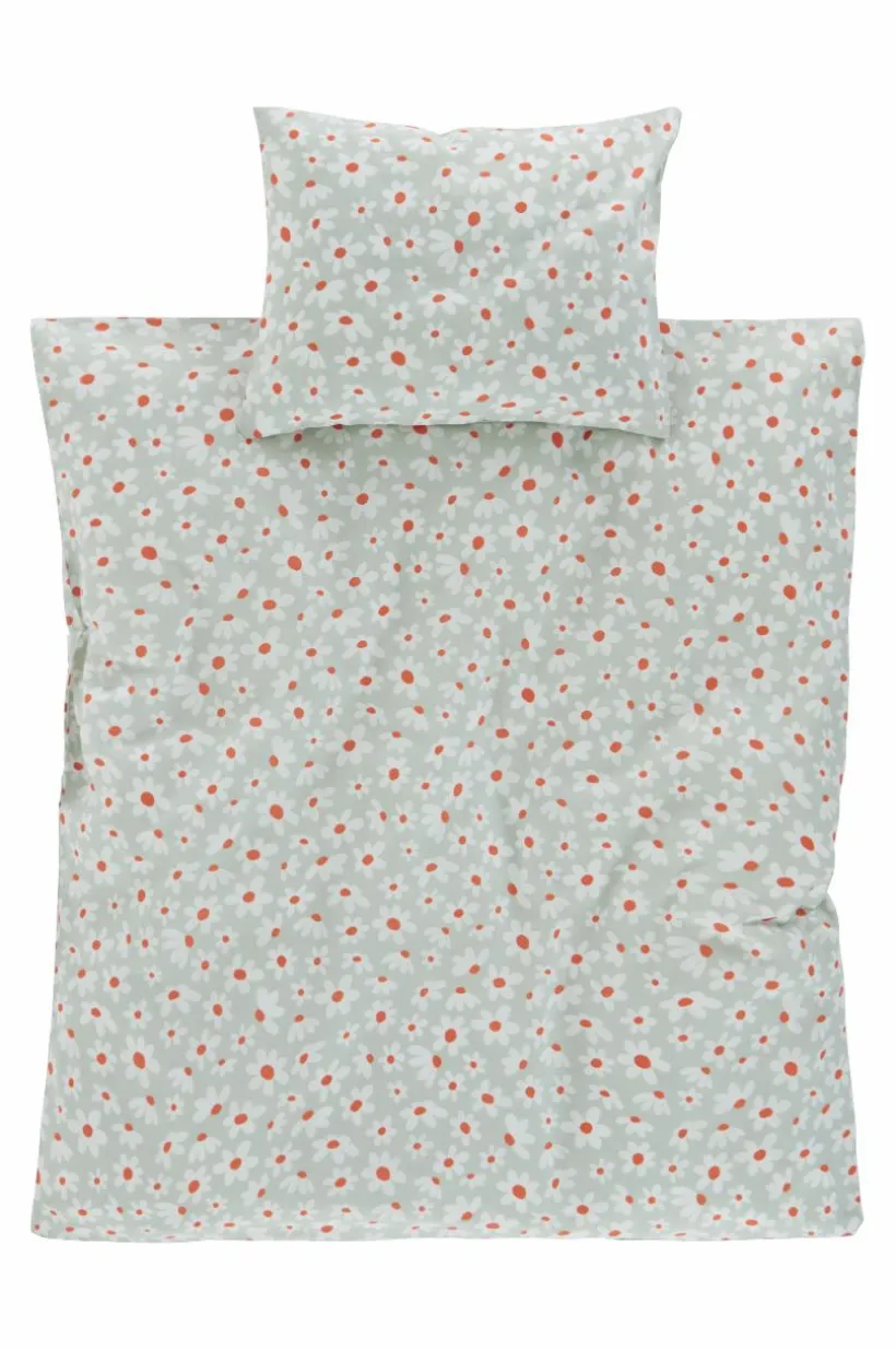 Småblommigt påslakanset med ett påslakan och ett örngott i ekologisk bomull. Setet passar till barnvagn och vagga. Tyget är behagligt med mjukt tryck, bomull är svalt och skönt mot huden. Fantasiblommorna påminner om vita små tusenstjärnor på en varm och mysig bottenfärg. Trådtäthet på 144 tc. (Trådtätheten talar om antalet trådar, thread counts, per kvadrattum i ett tyg. Ju högre trådtäthet desto högre kvalité.)