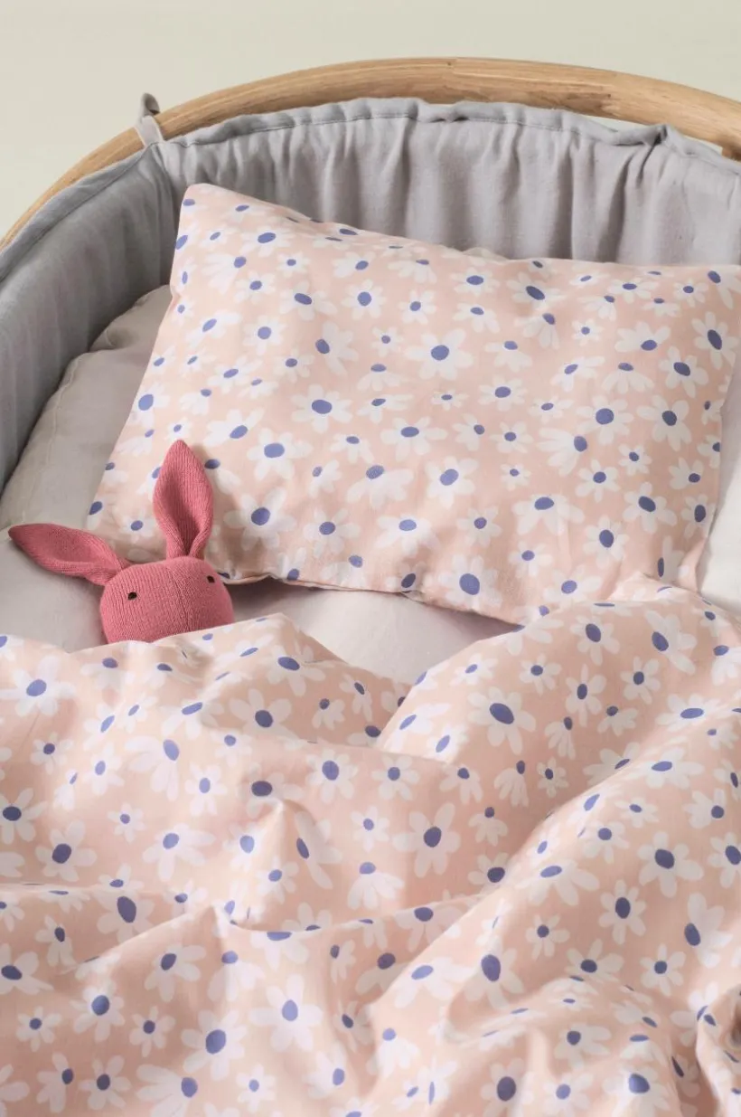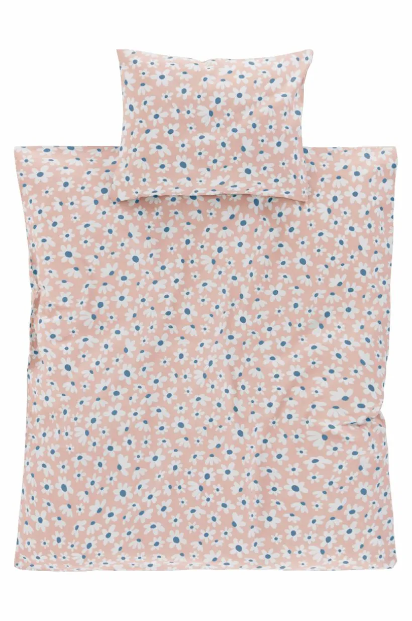 Småblommigt påslakanset med ett påslakan och ett örngott i ekologisk bomull. Setet passar till barnvagn och vagga. Tyget är behagligt med mjukt tryck, bomull är svalt och skönt mot huden. Fantasiblommorna påminner om vita små tusenstjärnor på en varm och mysig bottenfärg. Trådtäthet på 144 tc. (Trådtätheten talar om antalet trådar, thread counts, per kvadrattum i ett tyg. Ju högre trådtäthet desto högre kvalité.)