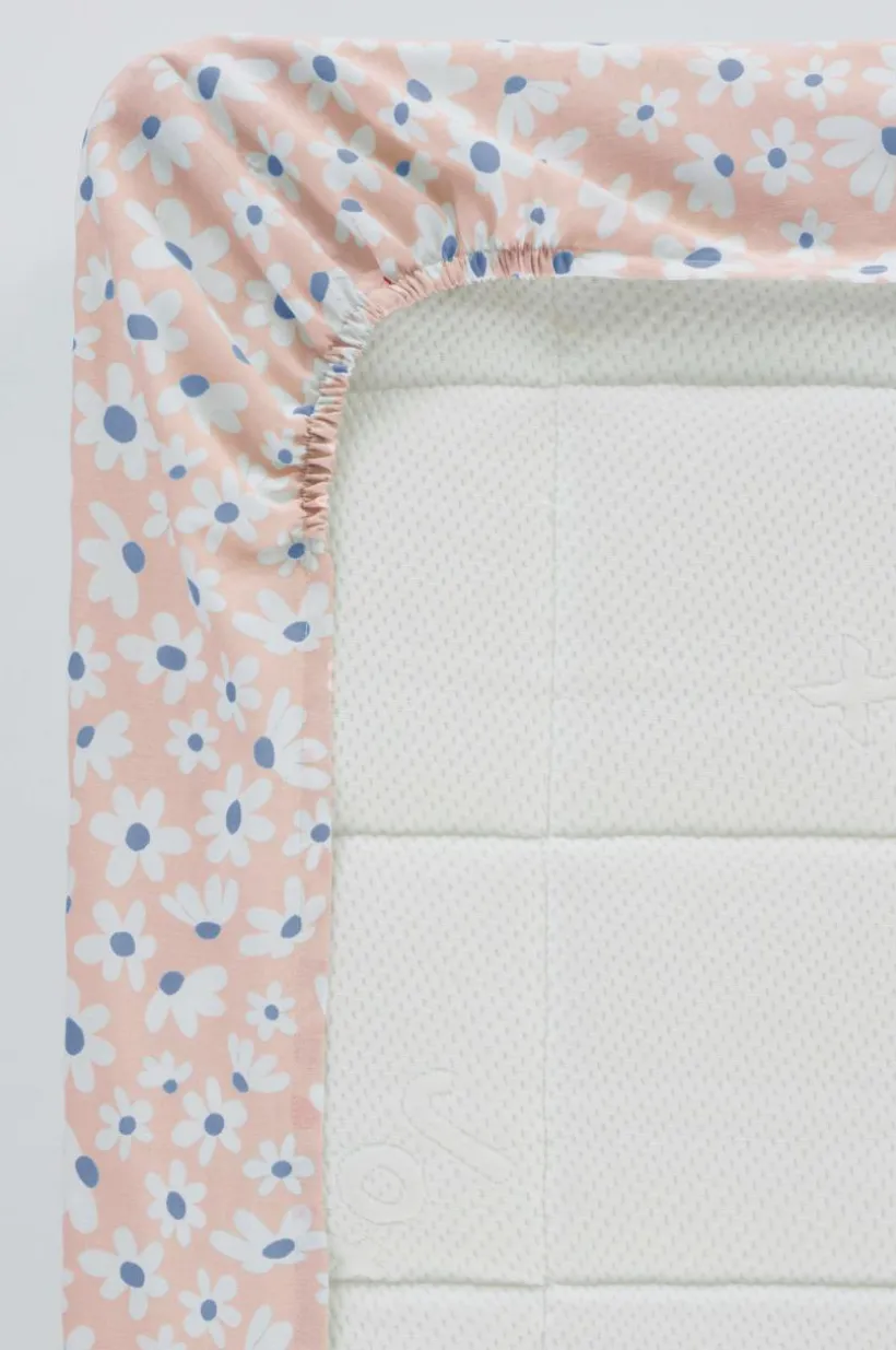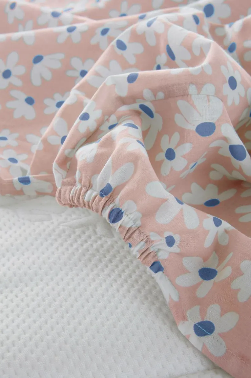 Småblommigt dra-på-lakan i ekologisk bomull. Resår i hörnen gör att det blir enkelt att bädda och lakanet sitter på plats. Tyget har ett behagligt tryck, bomull är svalt och skönt mot huden. Fantasiblommorna påminner om vita små tusenstjärnor på en varm bottenfärg. Trådtäthet på 144 tc. (Trådtätheten talar om antalet trådar, thread counts, per kvadrattum i ett tyg. Ju högre trådtäthet desto högre kvalité.)