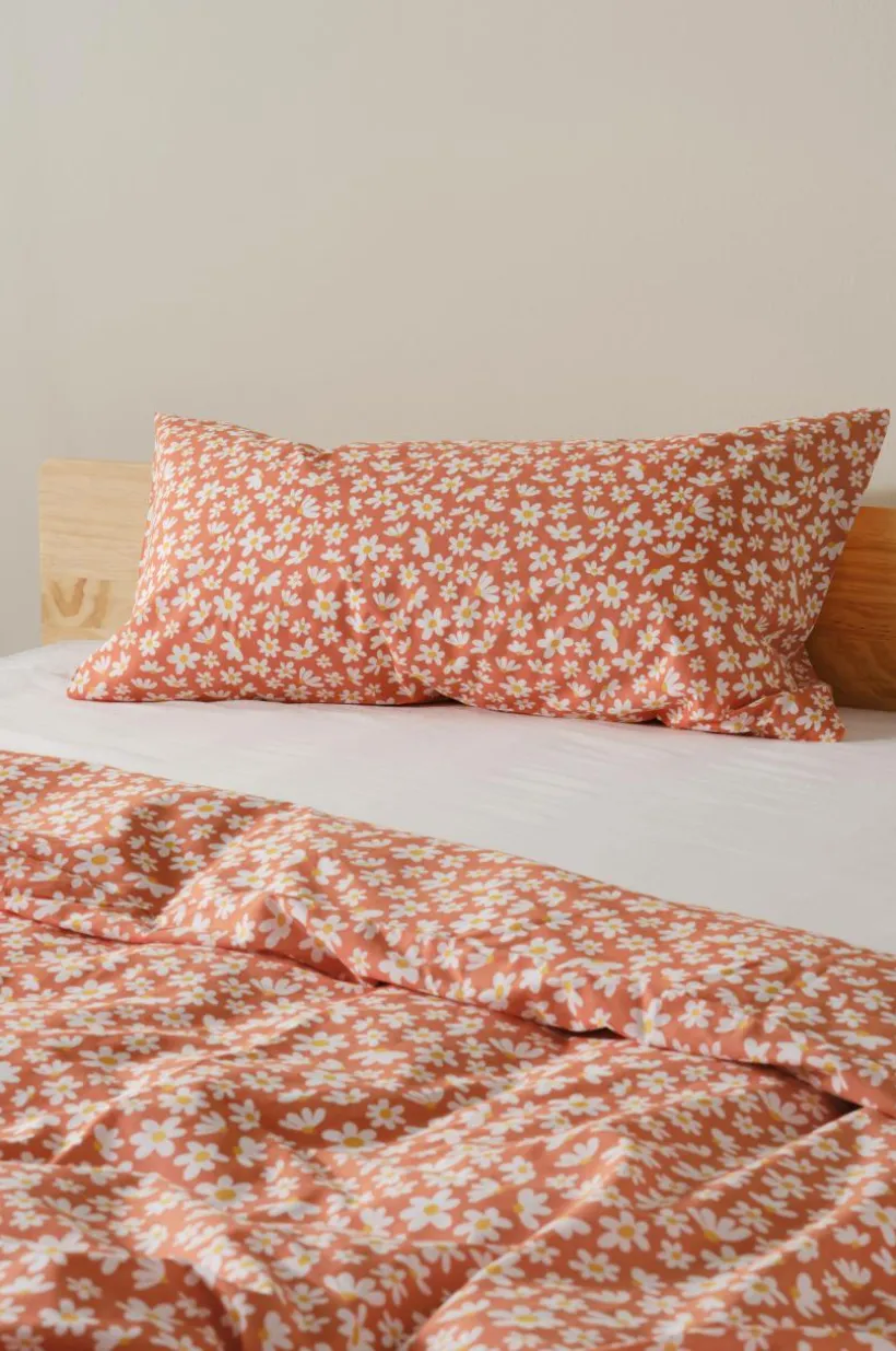Småblommigt örngott i ekologisk bomull. Tyget är behagligt med mjukt tryck, bomull är svalt och skönt mot huden. Fantasiblommorna påminner om vita små tusenstjärnor på en varm och mysig bottenfärg. Trådtäthet på 144 tc. (Trådtätheten talar om antalet trådar, thread counts, per kvadrattum i ett tyg. Ju högre trådtäthet desto högre kvalité.)