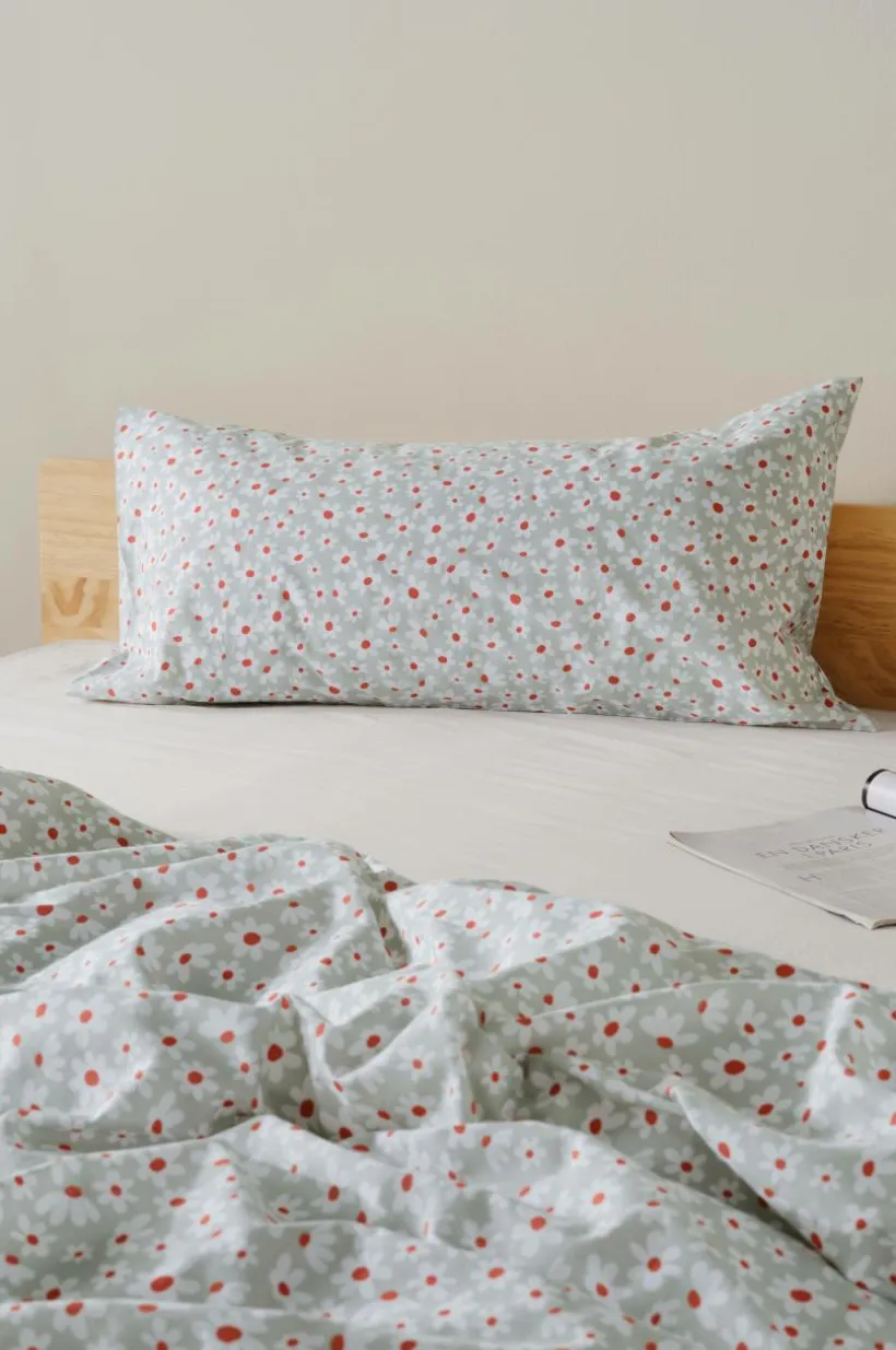 Småblommigt örngott i ekologisk bomull. Tyget är behagligt med mjukt tryck, bomull är svalt och skönt mot huden. Fantasiblommorna påminner om vita små tusenstjärnor på en varm och mysig bottenfärg. Trådtäthet på 144 tc. (Trådtätheten talar om antalet trådar, thread counts, per kvadrattum i ett tyg. Ju högre trådtäthet desto högre kvalité.)