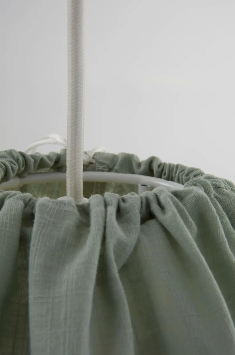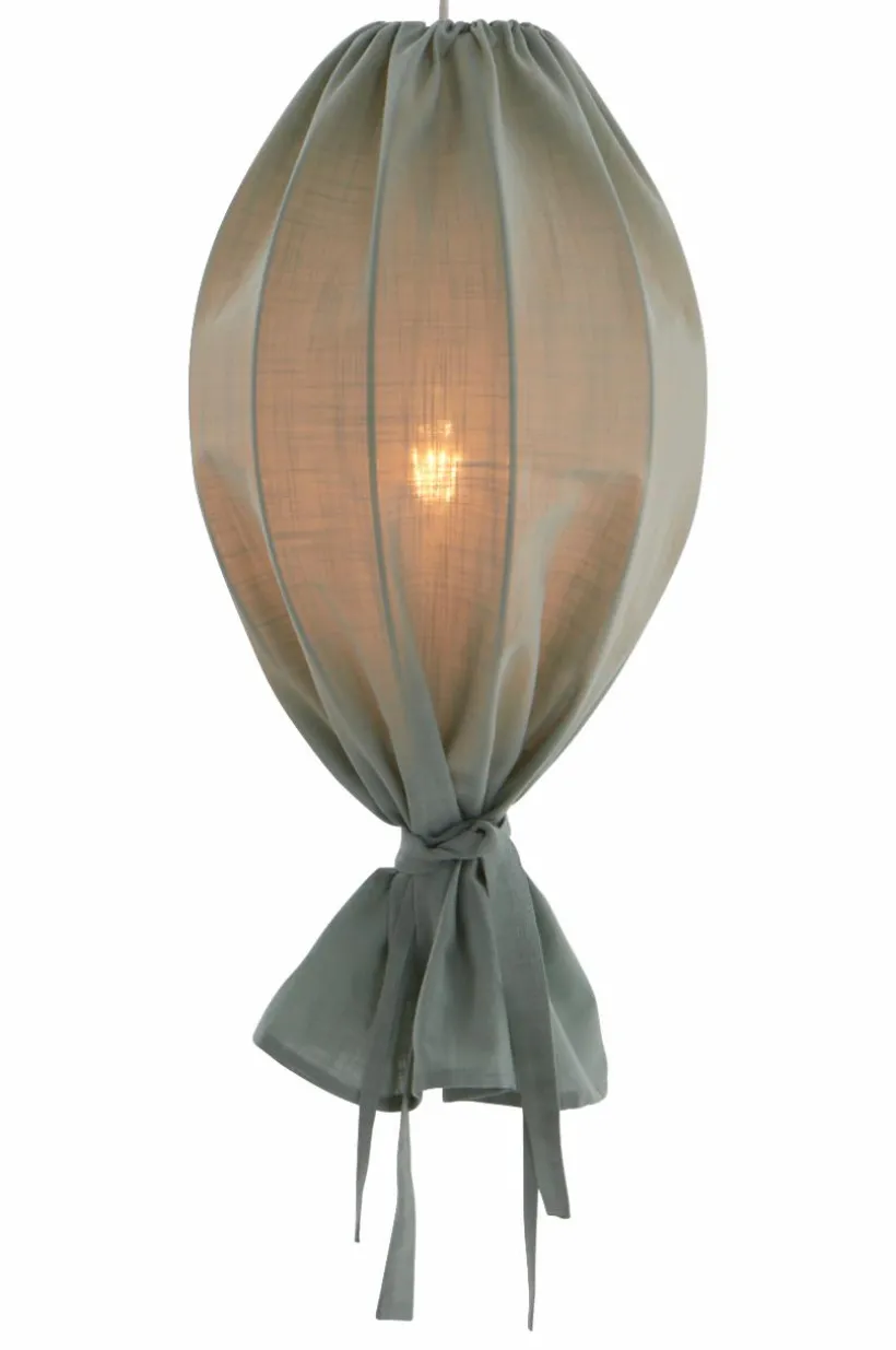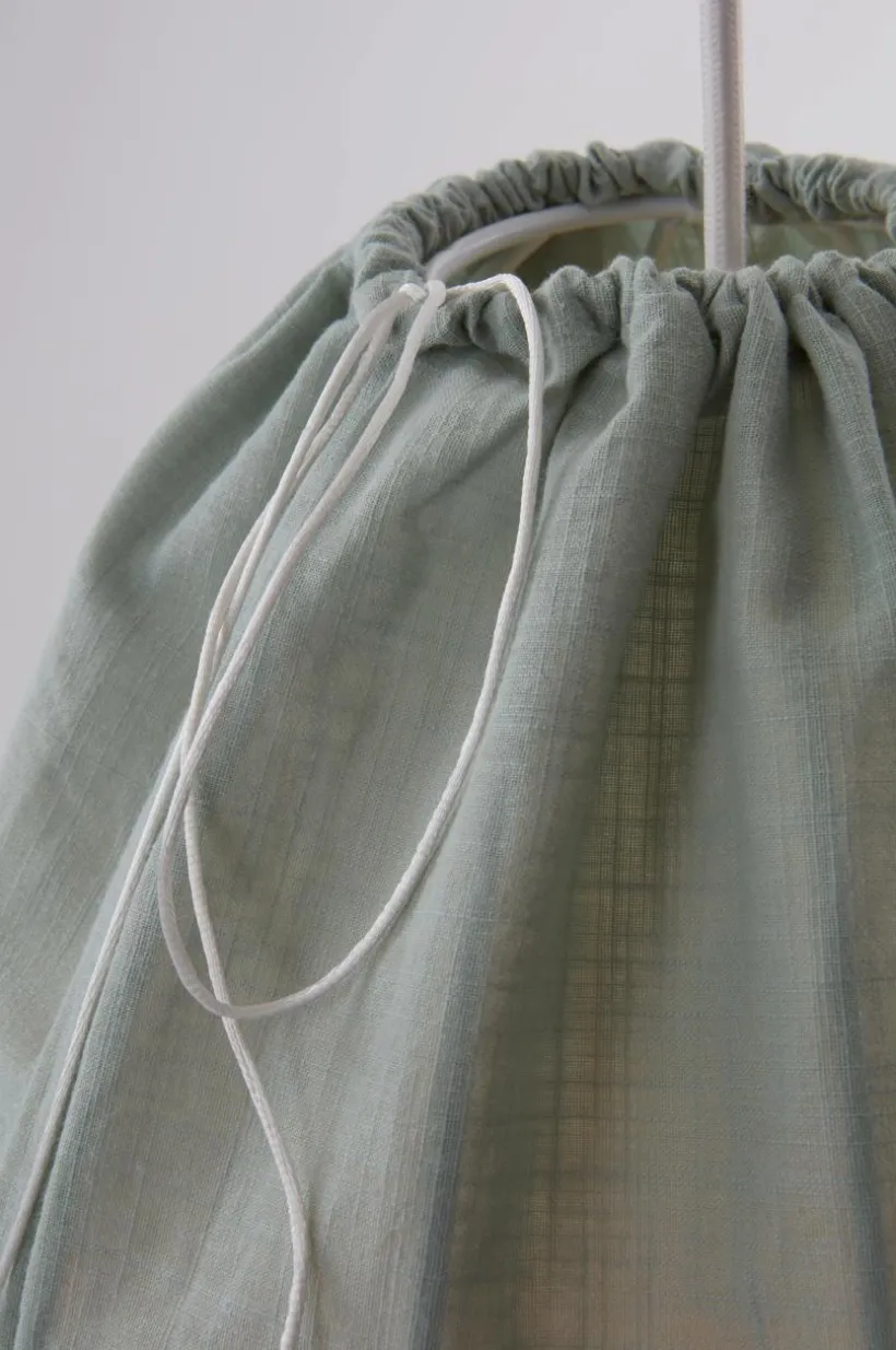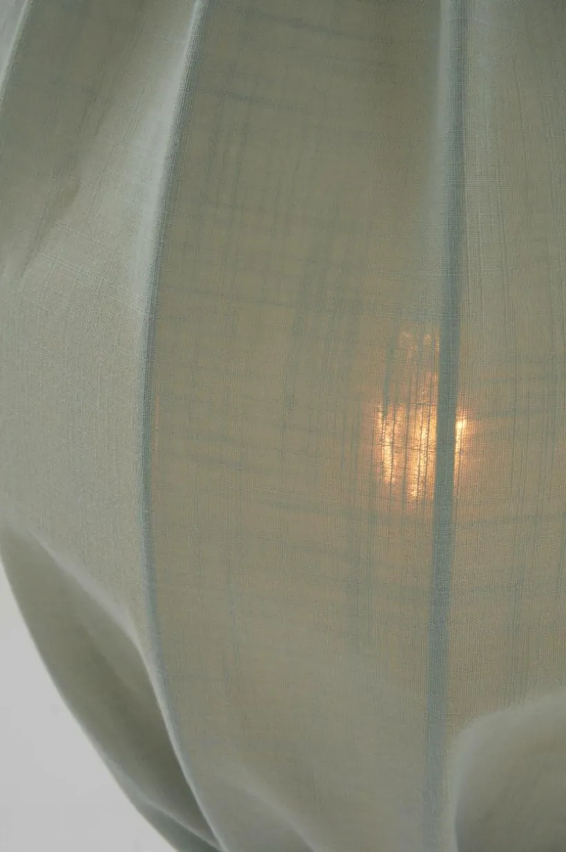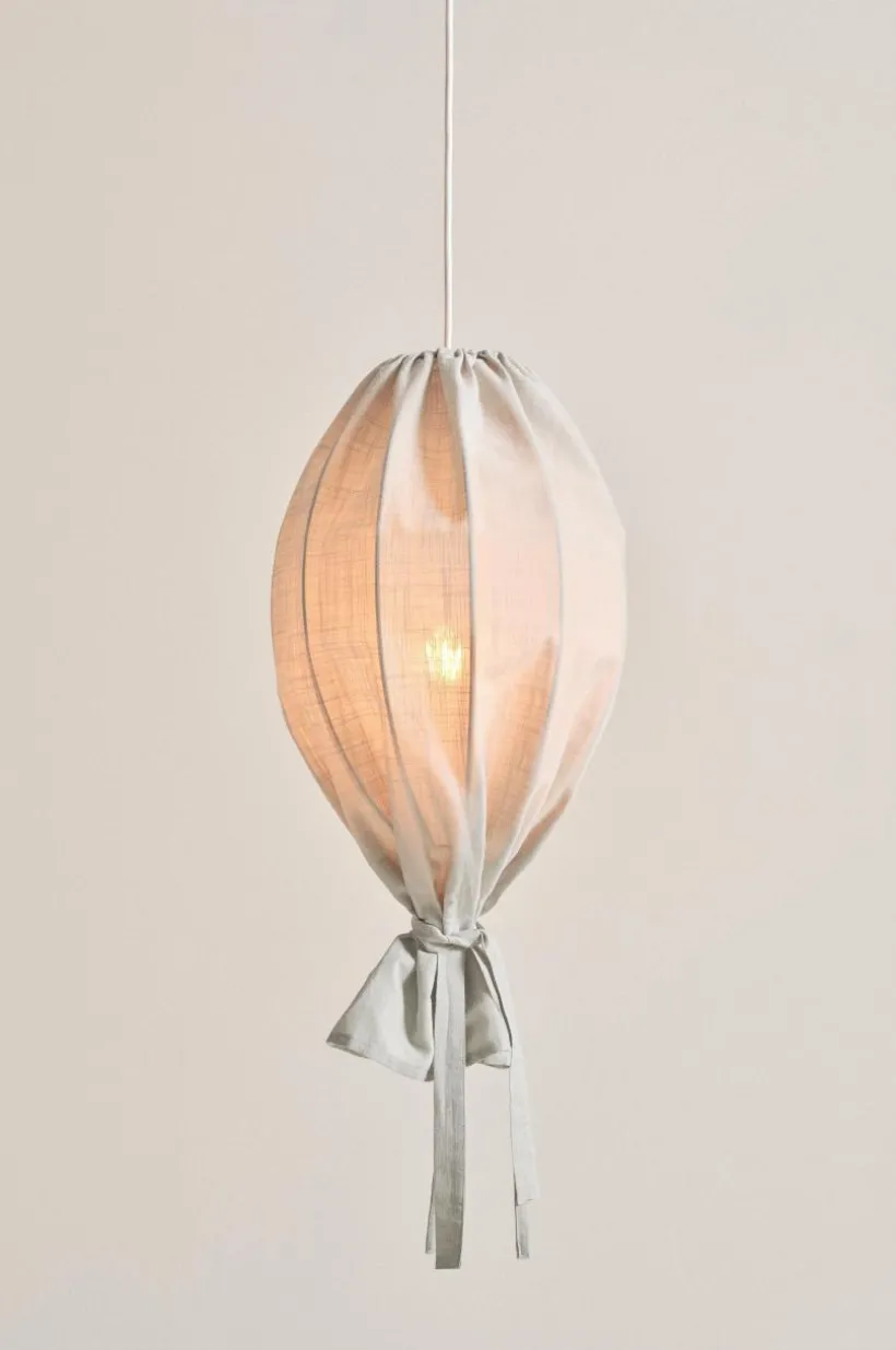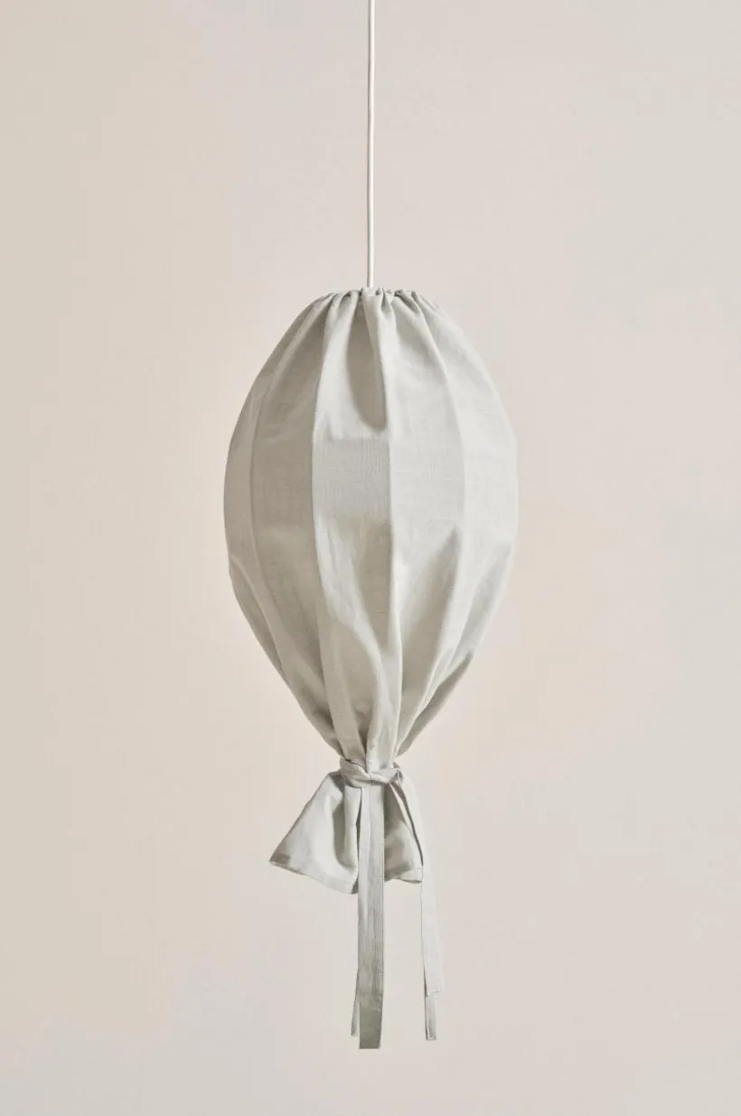 Taklampa av fint linnetyg som knyts under lampan med matchande band. Lampan har en metallställning som ger fin form och tygets färg ger ett stämningsfullt ljus. Vit textilsladd, takkopp av plast. Lampan är ojordad, klass 2. På grund av EU-regler behövs en separat takkontakt i vissa länder. Takkontakten ska vara ojordad (klass 2) och köps separat.