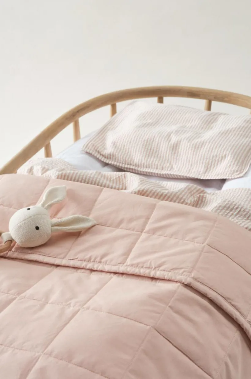 Vadderad babyfilt med yttertyg av bomull och fyllning av polyester. Det garnfärgade tyget är enfärgat och täcket är rutquiltat så att vadderingen fördelas jämnt. En söm runt om täcket ger fin kantning. Filten passar perfekt att ha både i barnvagnen och spjälsängen. Den är också mycket passande som lekmatta. Yttertygets gramvikt 120 g/m².