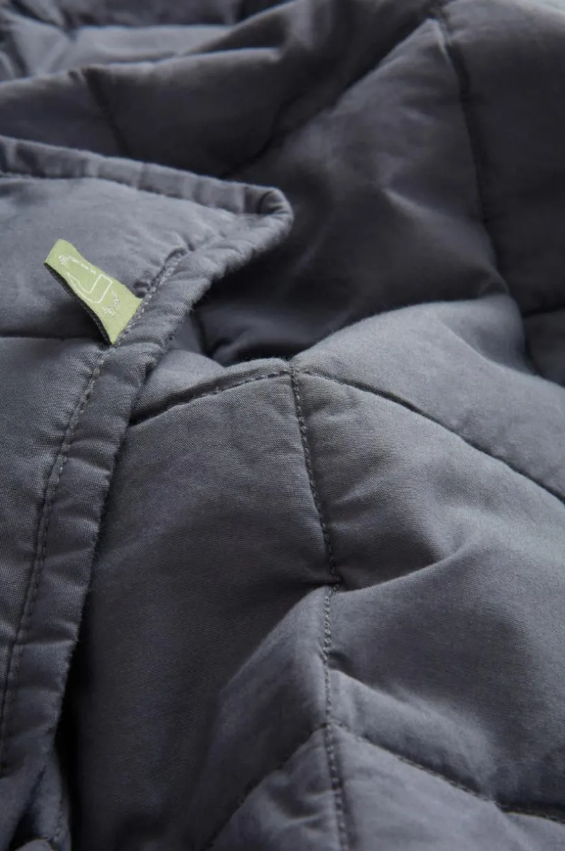 Vadderad babyfilt med yttertyg av bomull och fyllning av polyester. Det garnfärgade tyget är enfärgat och täcket är rutquiltat så att vadderingen fördelas jämnt. En söm runt om täcket ger fin kantning. Filten passar perfekt att ha både i barnvagnen och spjälsängen. Den är också mycket passande som lekmatta. Yttertygets gramvikt 120 g/m².