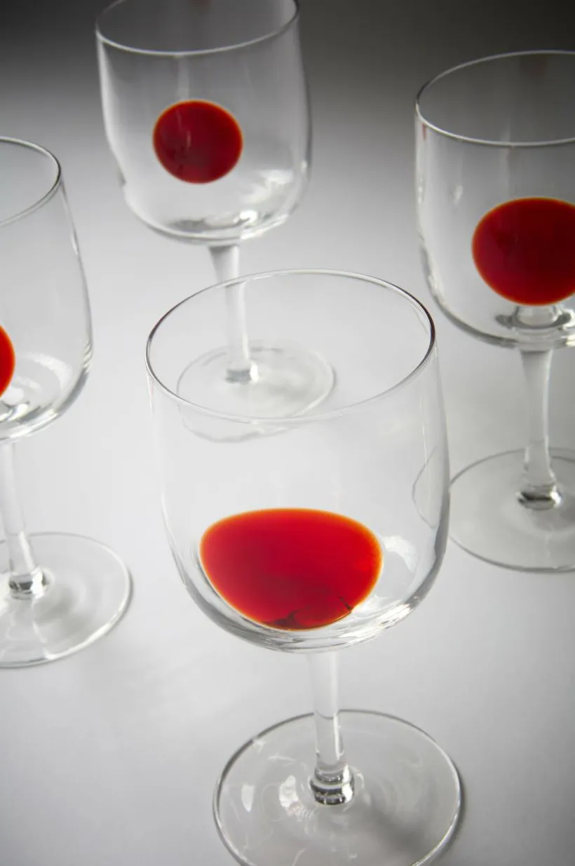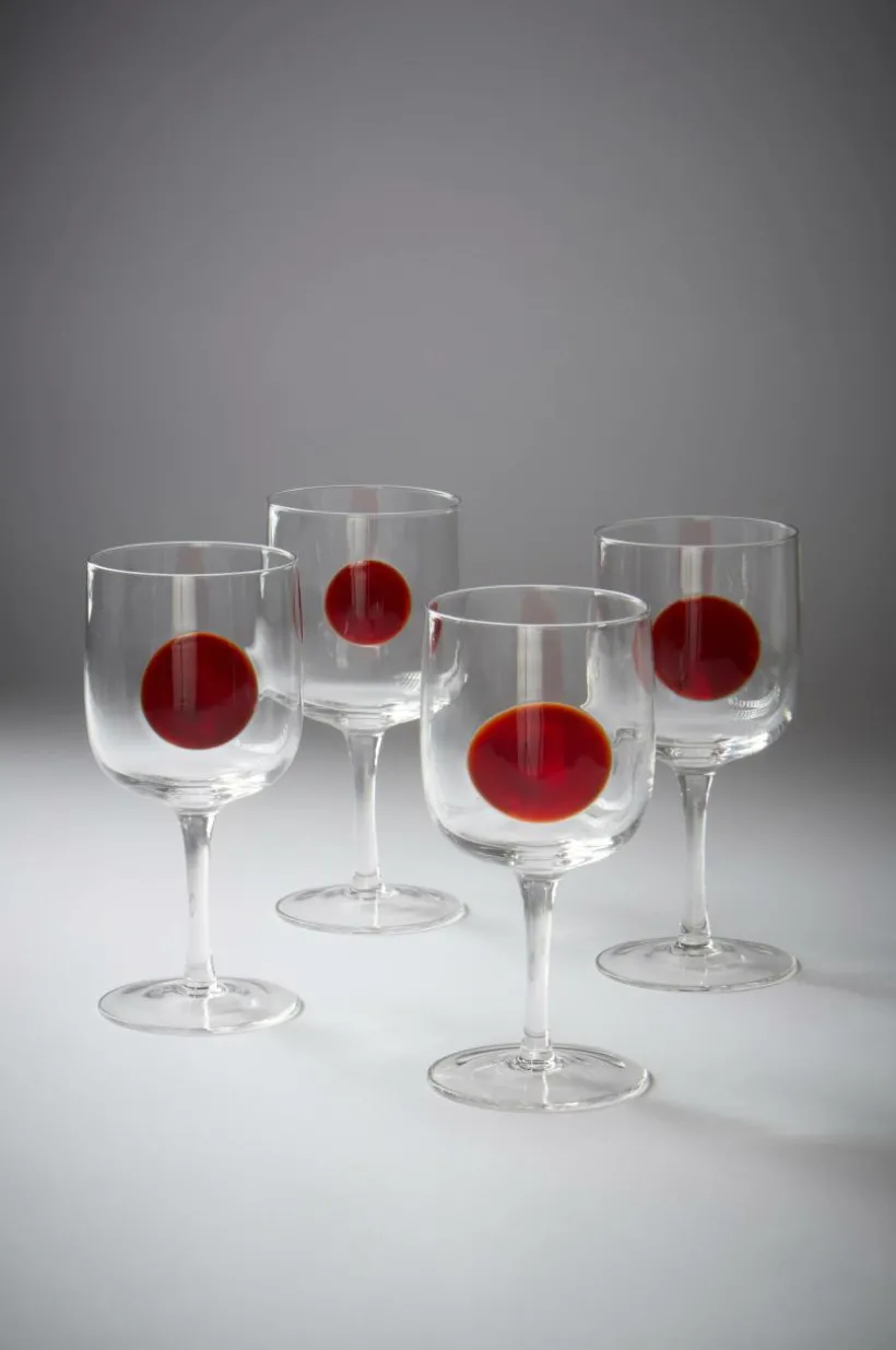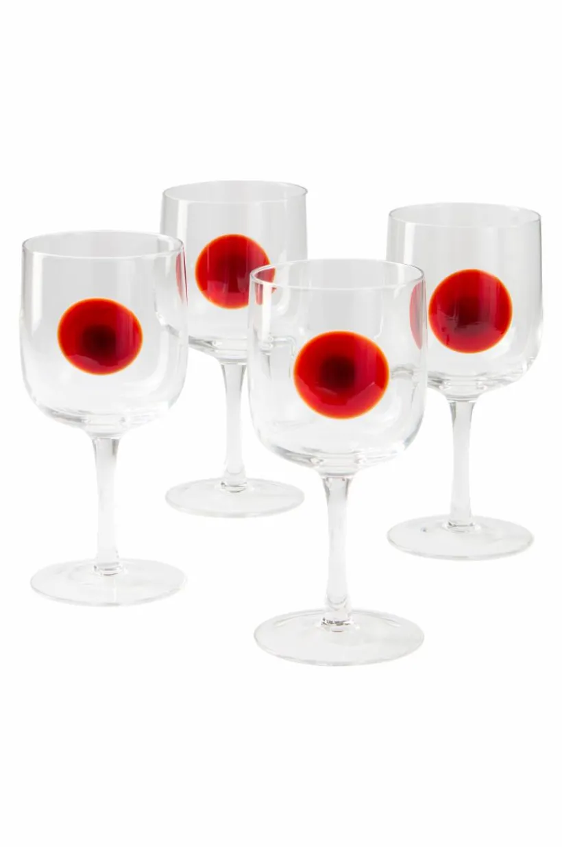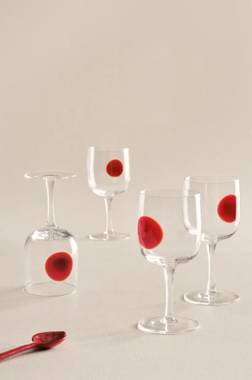 Charmigt vinglas. DART vinglas i 4-pack förhöjer ditt kök och vardagsrum. Klart glas pryds av livfulla prickar. Varje bit är handgjord och unik och berättar sin egen historia. En del av DART-familjen med matchande föremål. Perfekt för trendig och modern hemdesign.