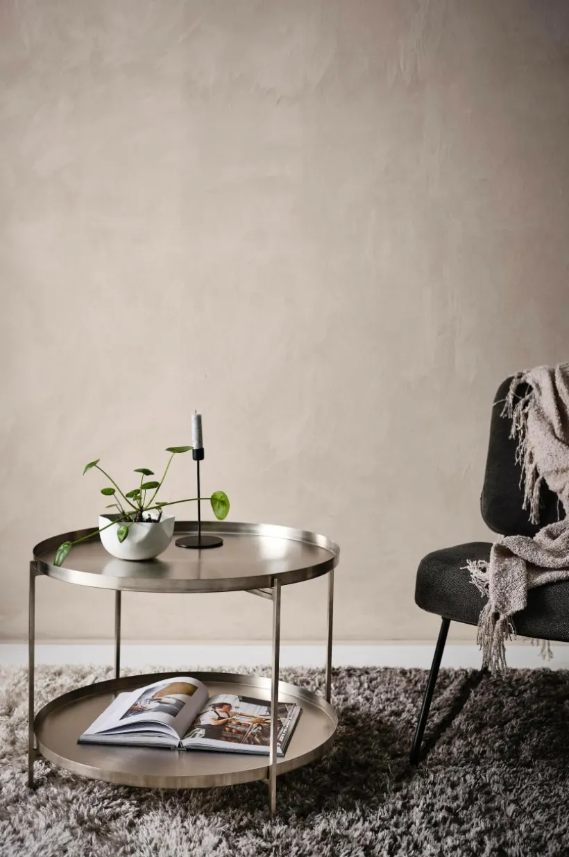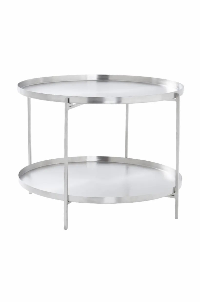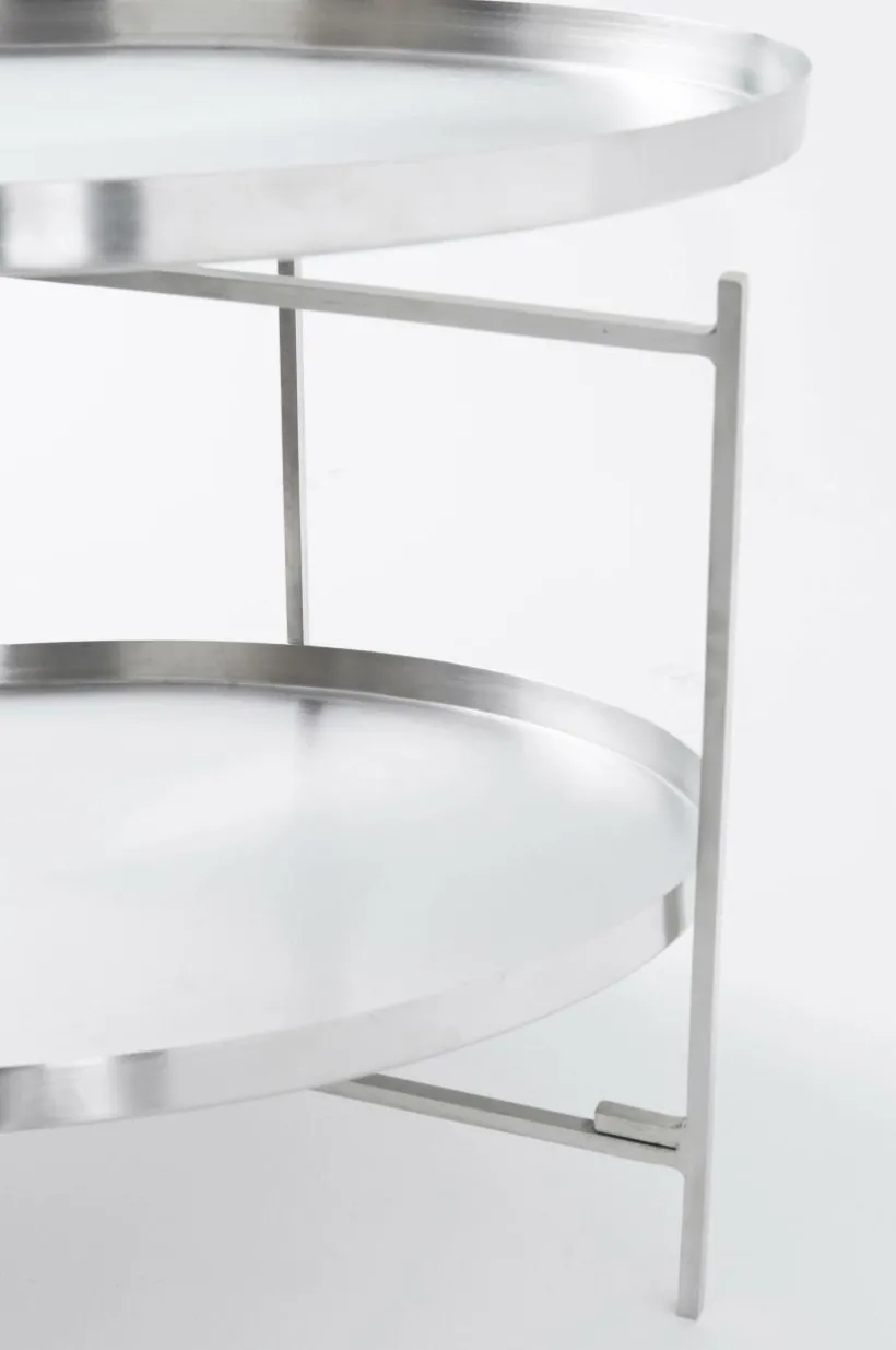 Runt sidobord eller brickbord av metall. Det praktiska brickbordet har stort användningsområde och är mycket flexibelt. Båda brickorna kan lyftas av och du kan välja att ha dem på bordet med kanten vänd uppåt eller vänd nedåt. Stativet är hopfällbart. Viss montering krävs.