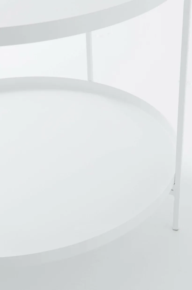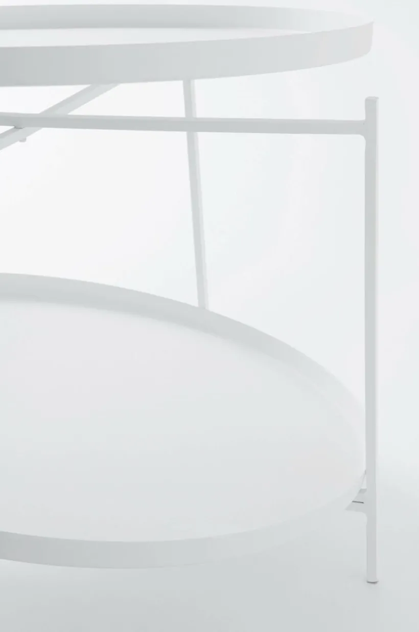 Runt sidobord eller brickbord av metall. Det praktiska brickbordet har stort användningsområde och är mycket flexibelt. Båda brickorna kan lyftas av och du kan välja att ha dem på bordet med kanten vänd uppåt eller vänd nedåt. Stativet är hopfällbart. Viss montering krävs.