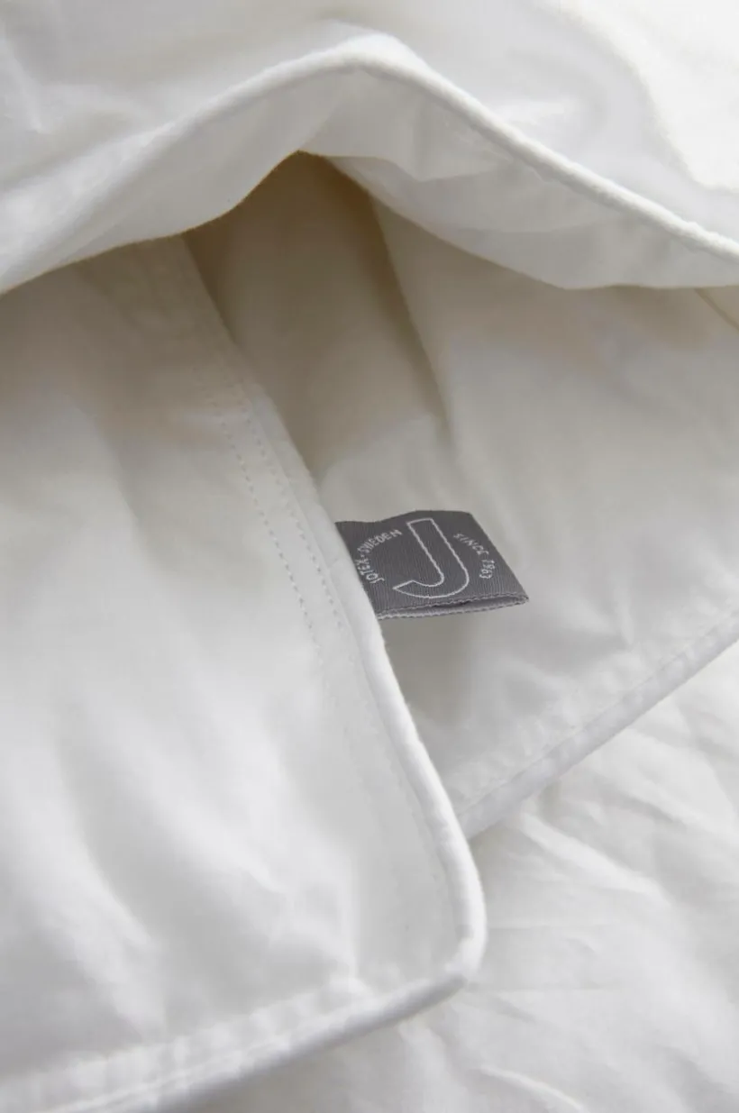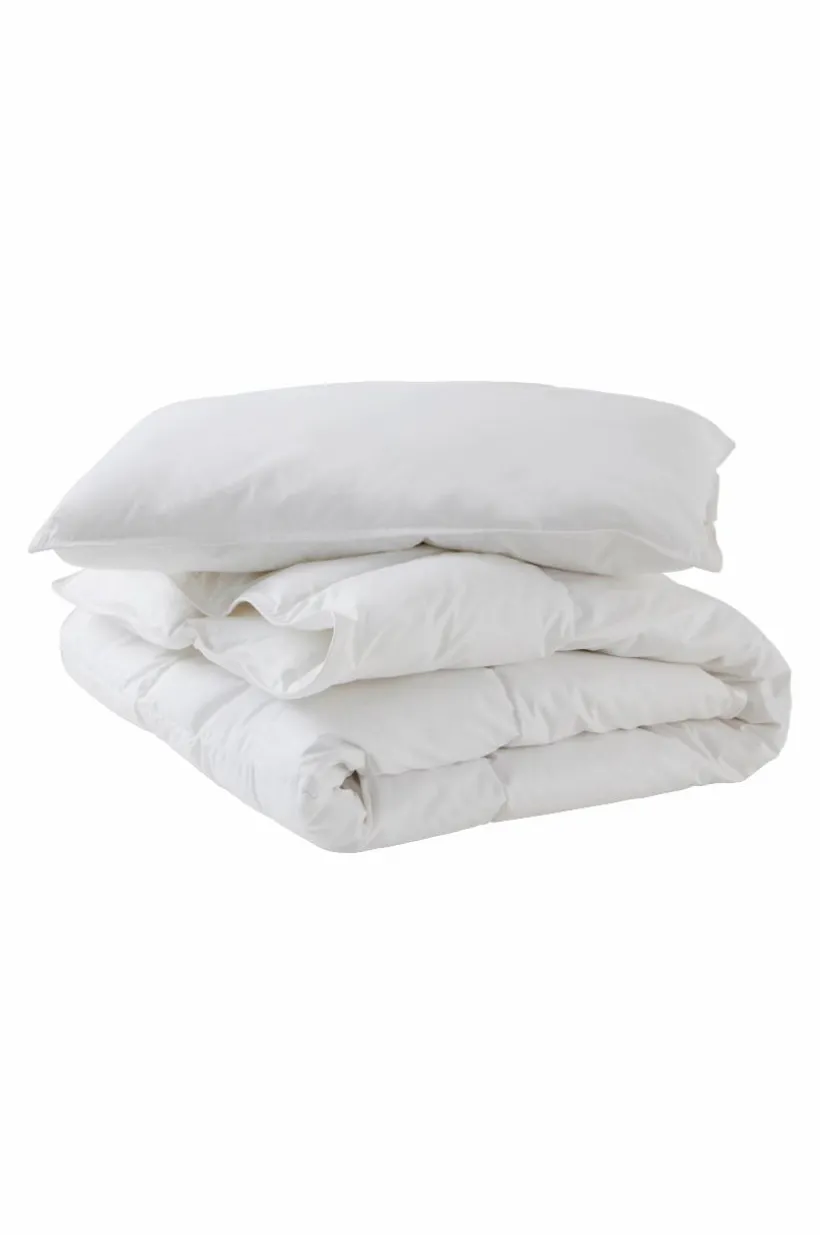 Bäddpaket till det lilla barnet, ett svalt täcke och en mjuk kudde som passar bra i spälsäng eller juniorsäng. Yttertyget är i mjuk ekologisk bomull. Fyllning av dunimitation som ger en härlig känsla av dun, men har polyesterns fördelar som gör det lätt att hålla rent och fräscht. Täcket är rutquiltat och har sydda mellanväggar för att hålla fyllningen på plats. Täcket och kudden är förkrympt och krymper därför inte i tvätten. Fyllningens vikt kudde 190 gram, täcke 300 gram. Paketet levereras i en praktisk väska av non woven.
