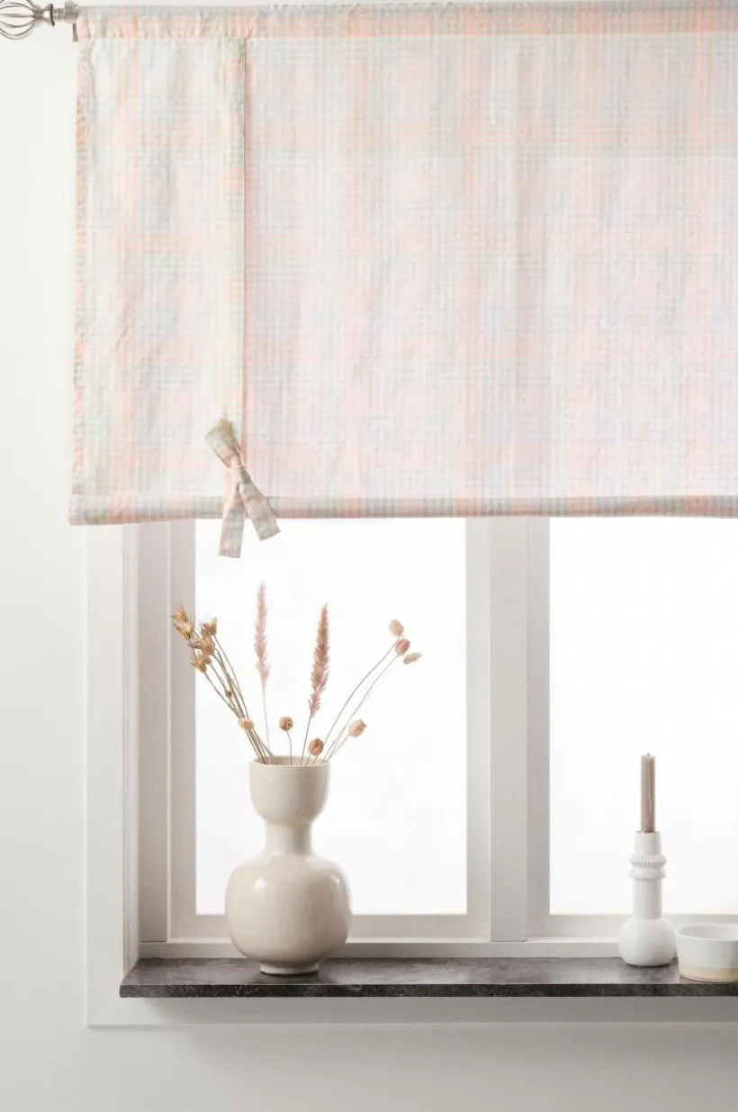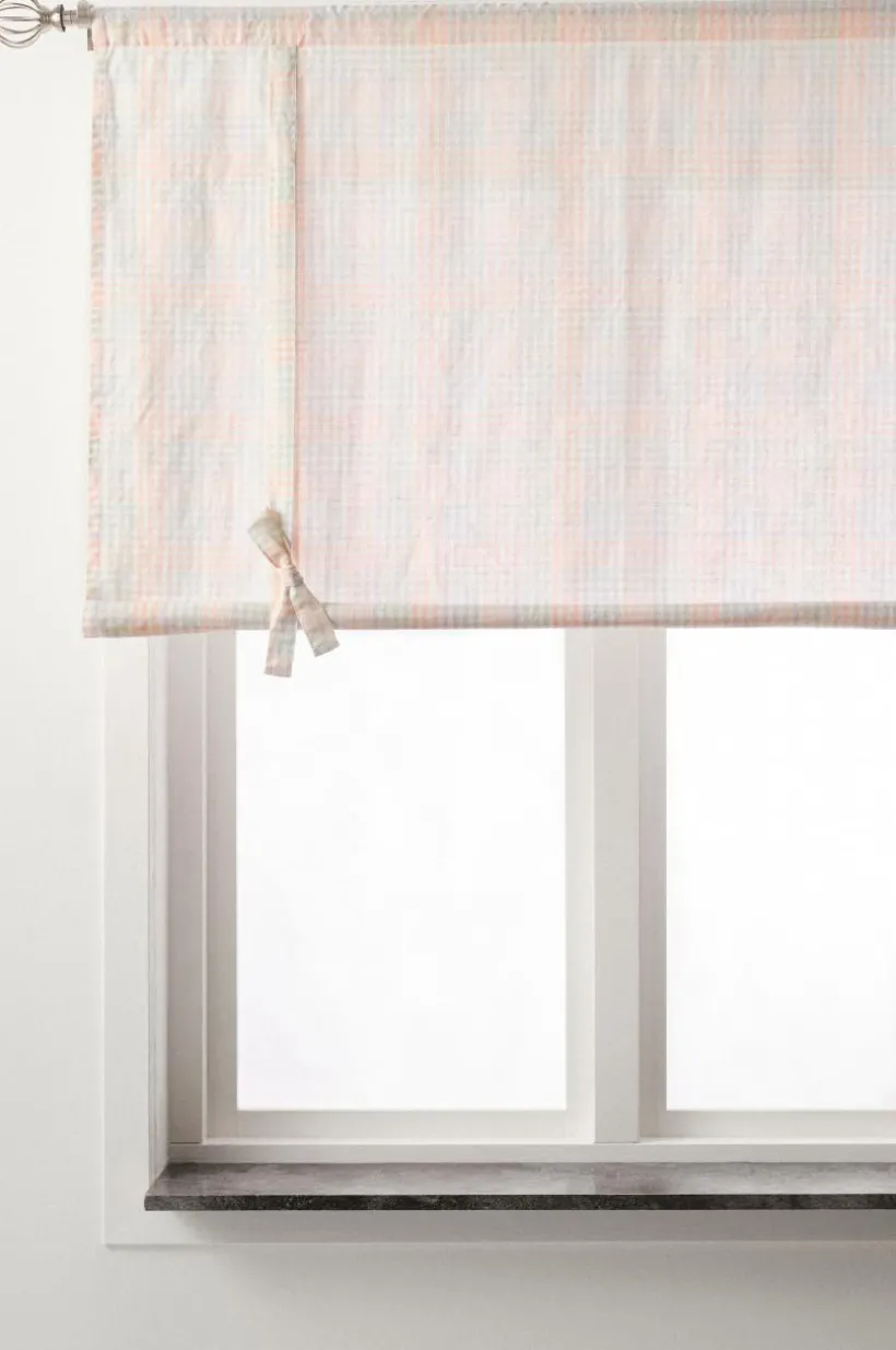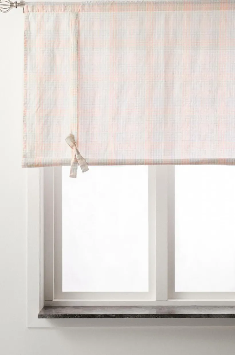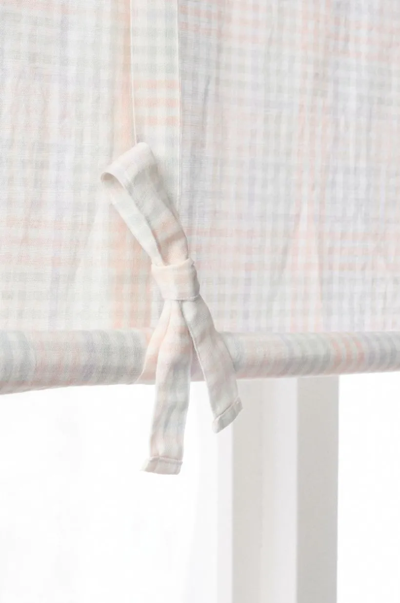 Roll up-gardin i smårutigt tyg av bomull och lin. Rutorna är i mjuka, glada färger som ger en ljus och härlig sommarkänsla året runt. Roll up-gardinen är plaggtvättad vilket innebär att den tvättats efter sömnad och tyget blir mjukt och följsamt. Hängs på vanlig gardinstång. Höjden regleras med knytband.