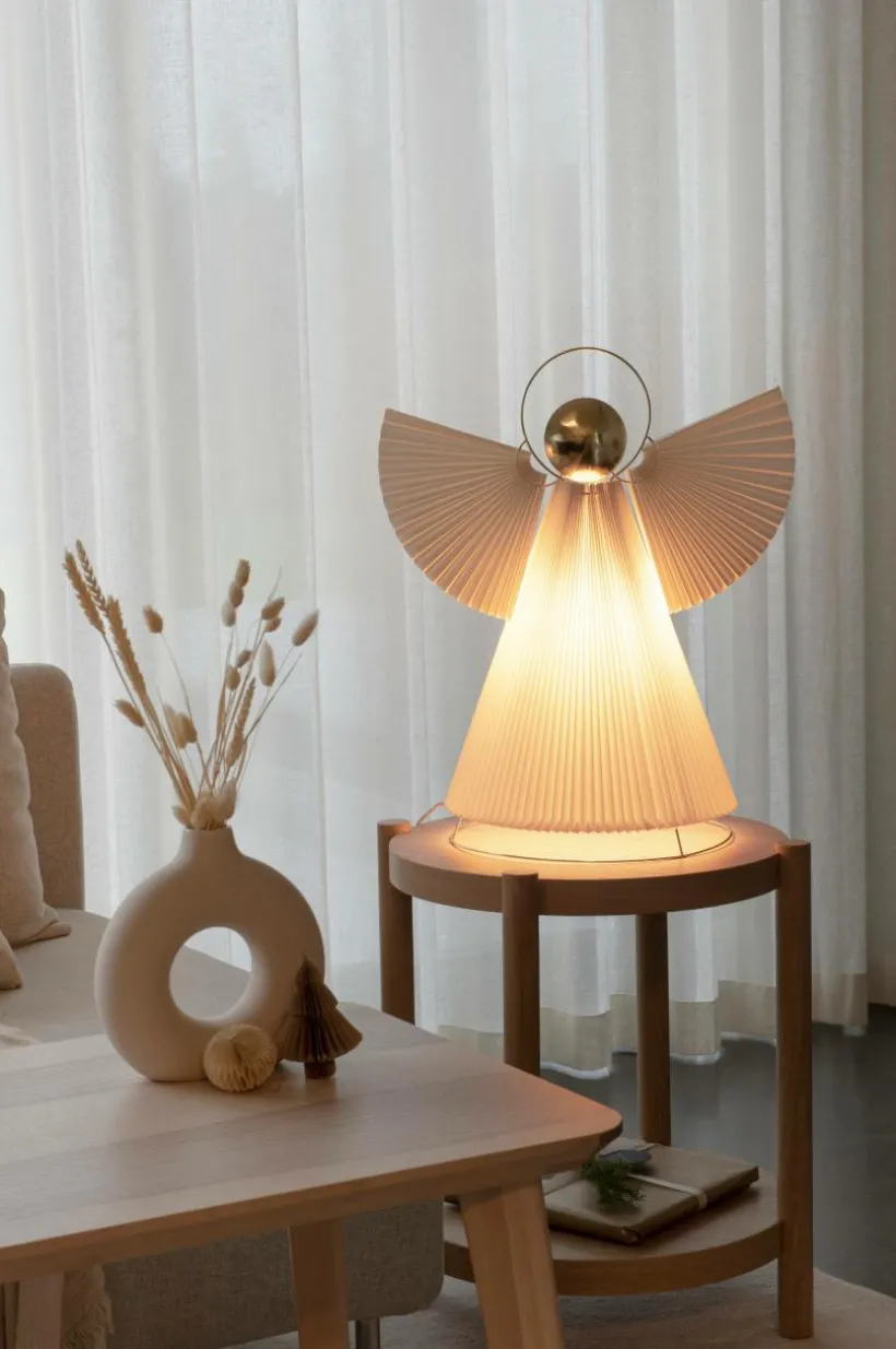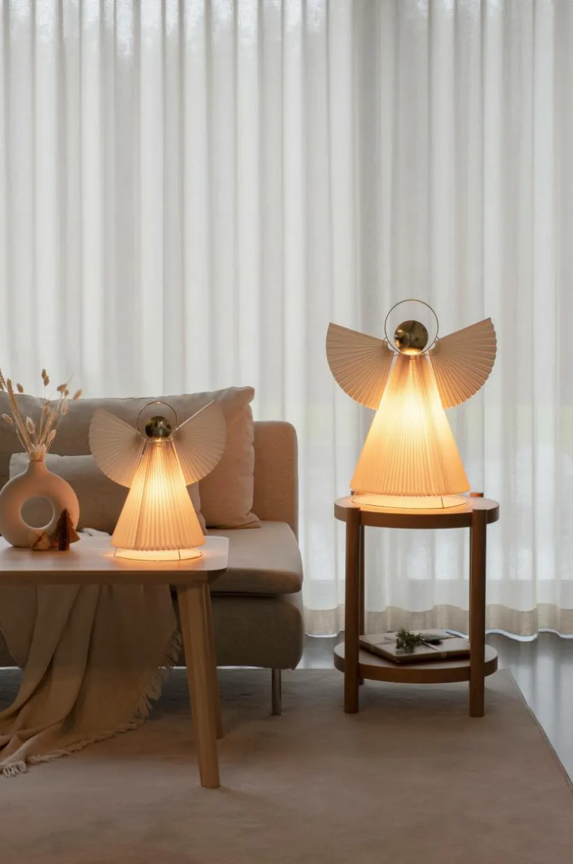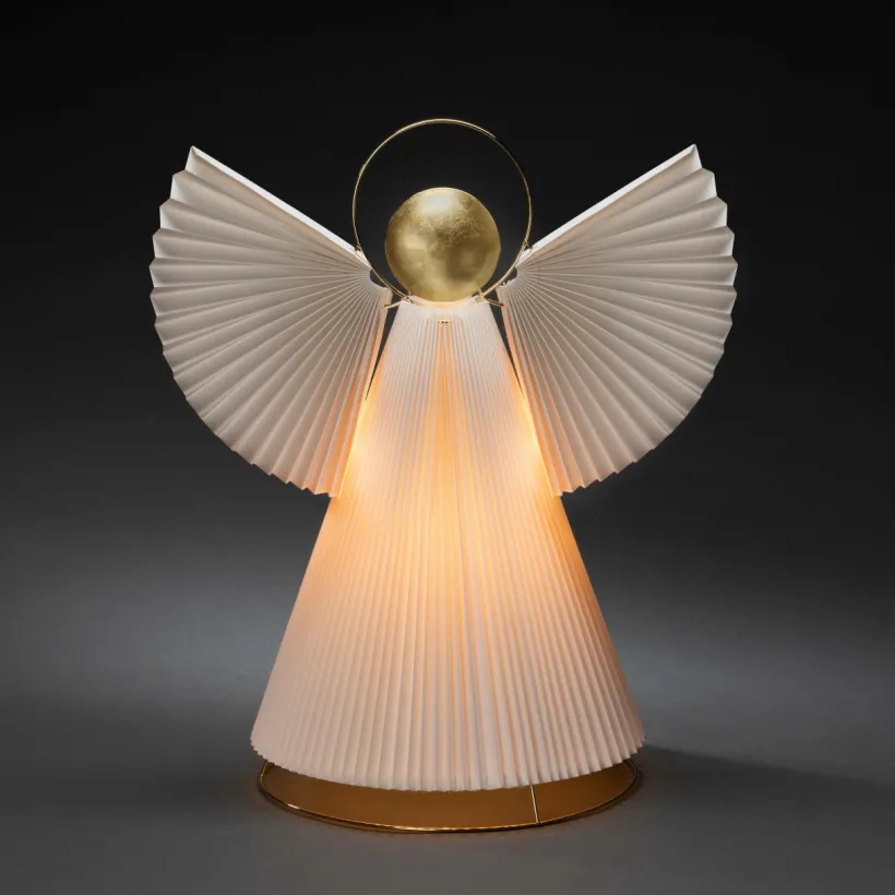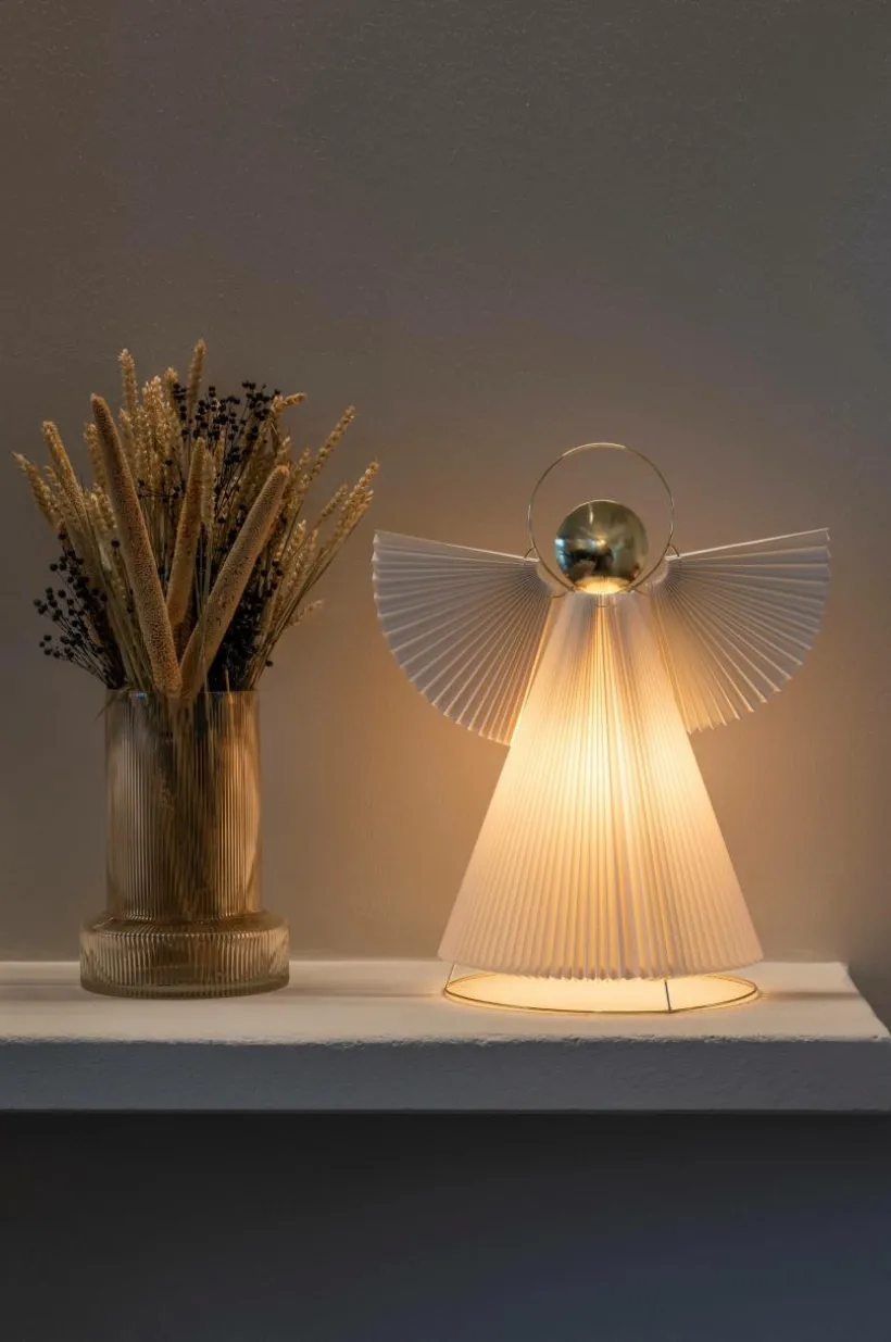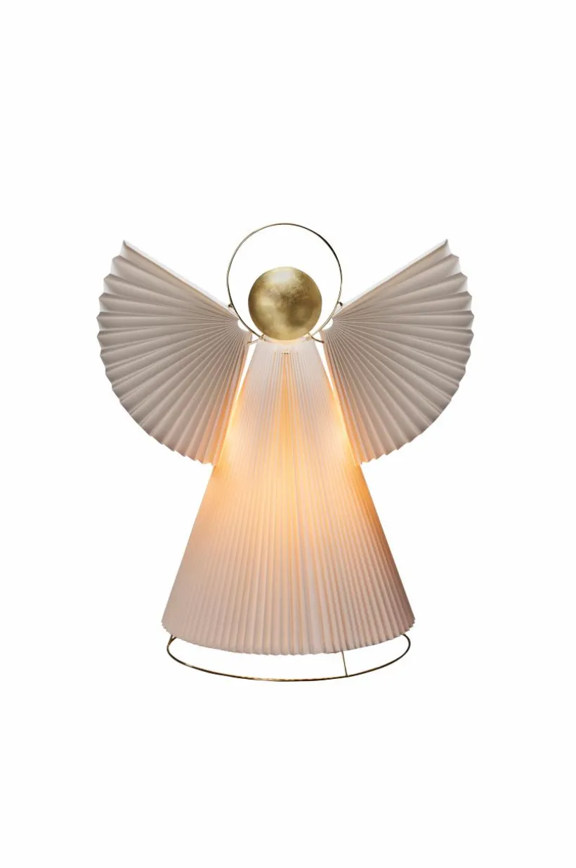 Ängel i plisserat papper med mässingsfärgade detaljer. E14 lamphållare (ljuskälla ingår ej). 54 cm hög och lång anslutningssladd på 5 meter.