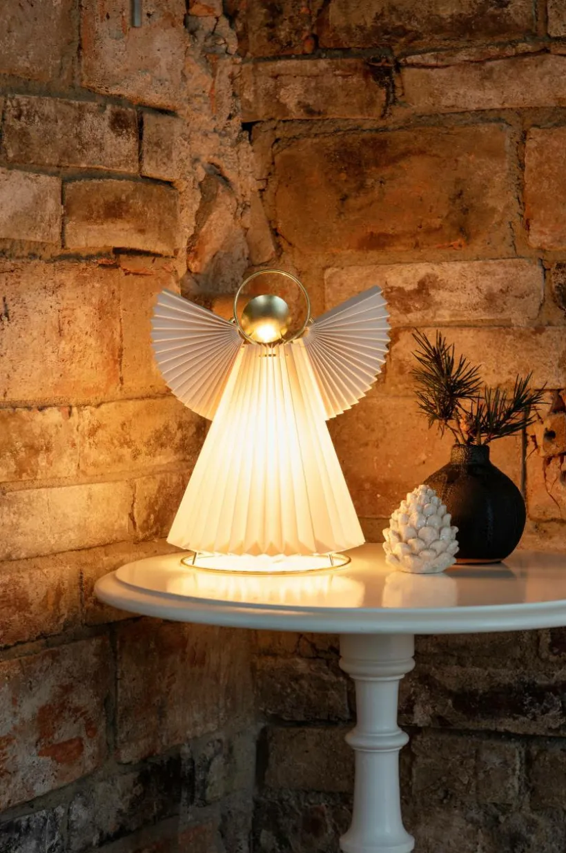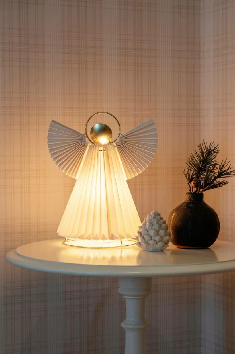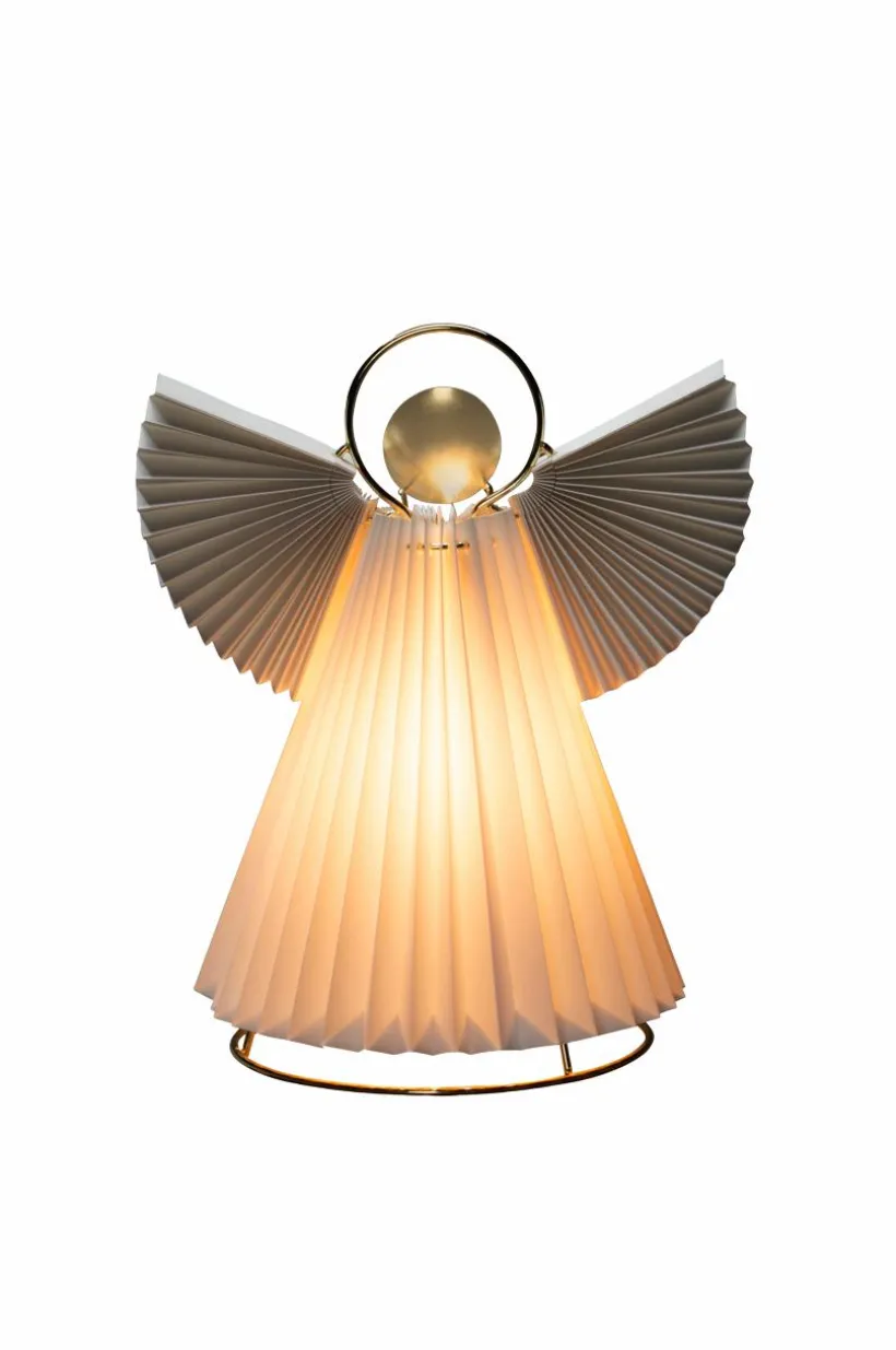 Ängel i plisserat papper, E14 lamphållare (ljuskälla ingår ej). 26 cm hög och lång anslutningssladd på 5 meter.