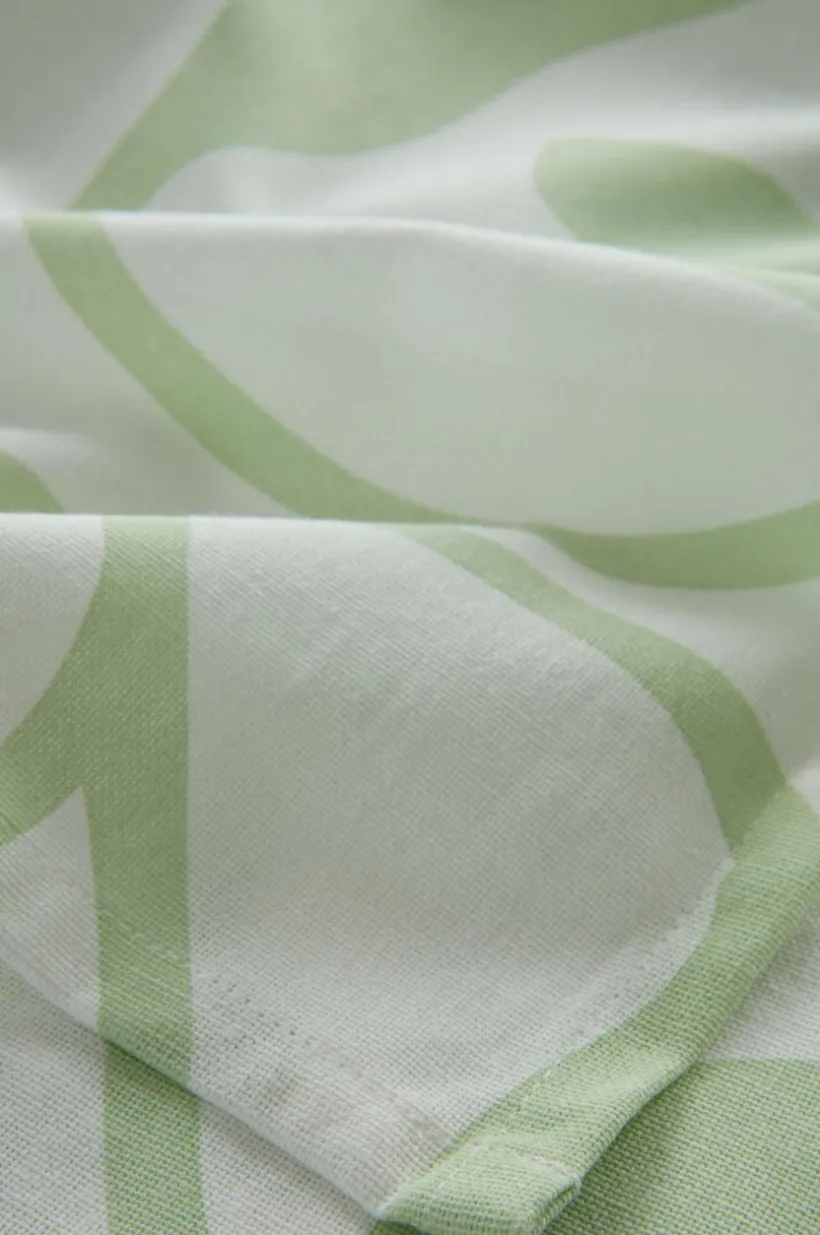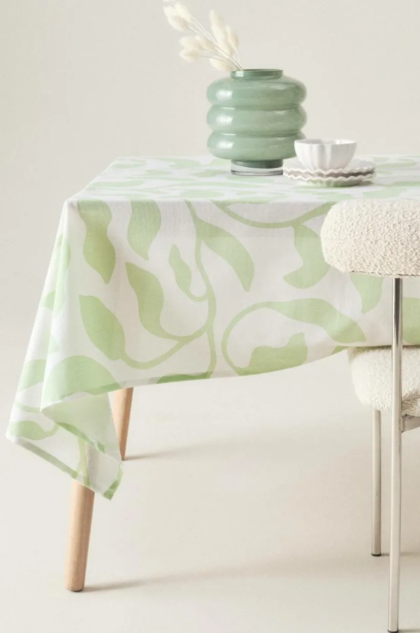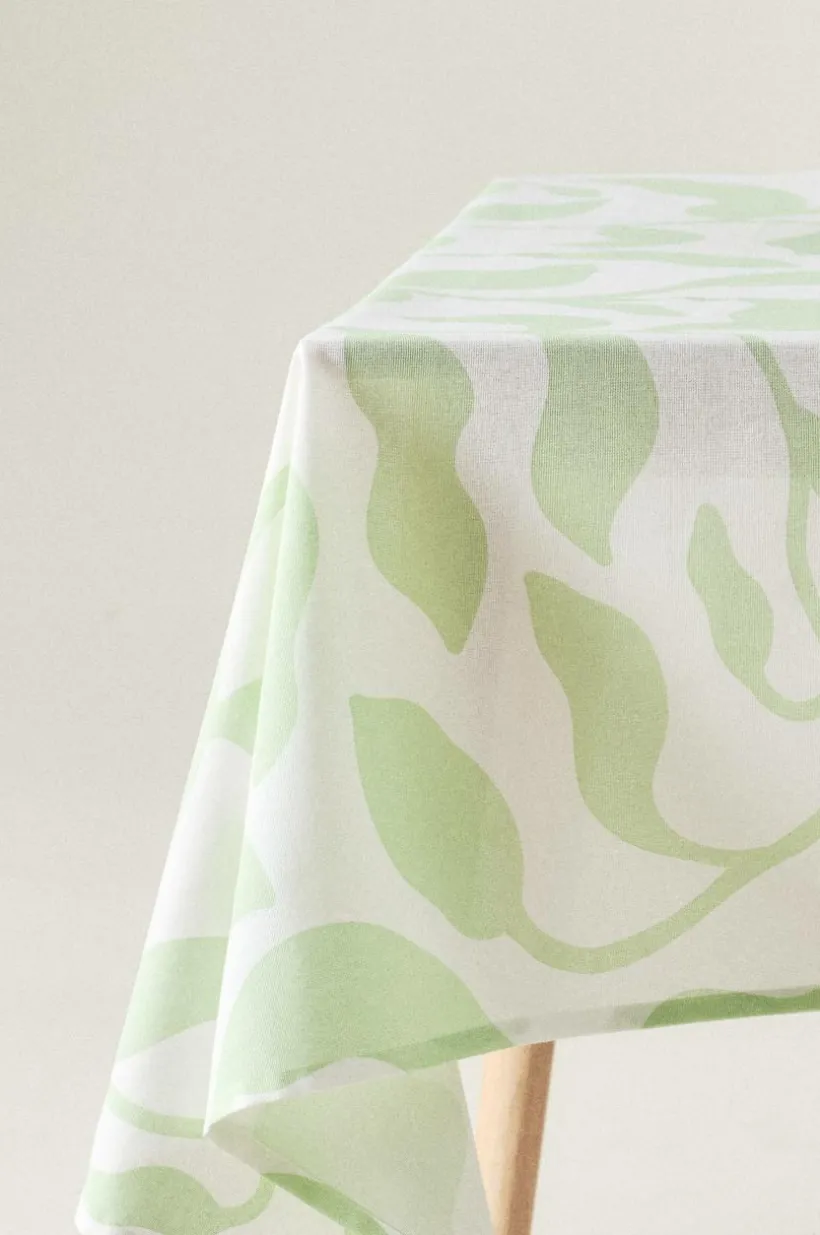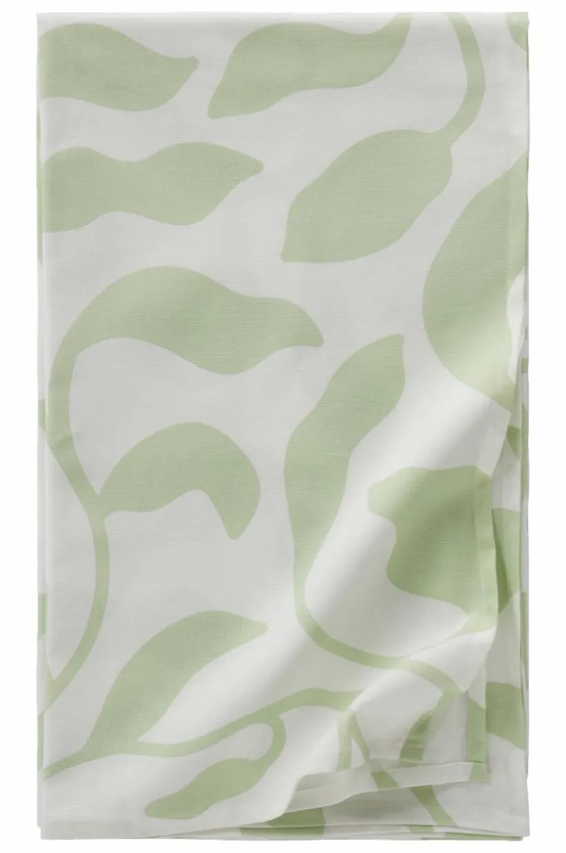 Duk i halvpanama av bomull. Delarna i programmet DELLA har charmigt bladmönster i somrig färg tryckt på vit botten. Tygets gramvikt 170 g/m².