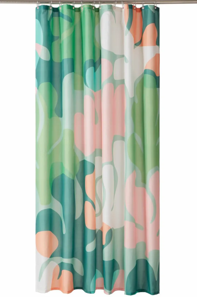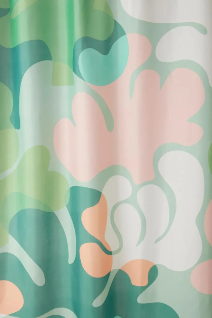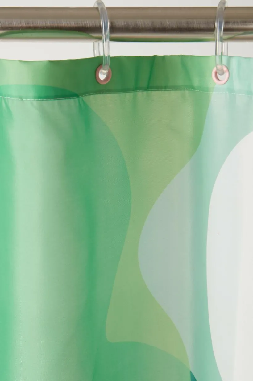 Duschdraperi av polyester med digitaltryckt mönster i harmoniska färger, designat av Maria Carlberg. Både färg och form ger mönstret skön retrokänsla. Digitaltrycket ger distinkt mönster och klara färger. Tyget har vattenavvisande beläggning. Upptill har duschdraperiet 12 metallöljetter i matchande färg. Ringar till upphängningen ingår ej.