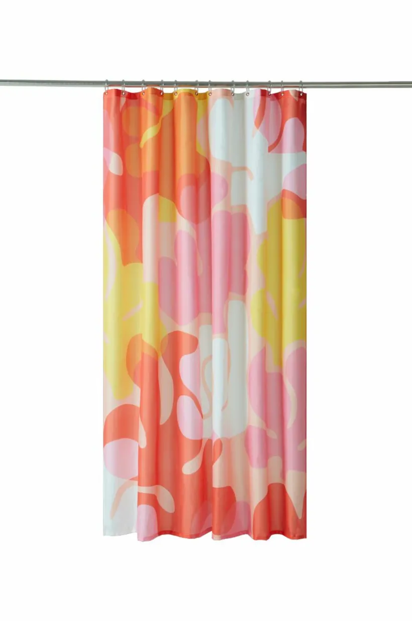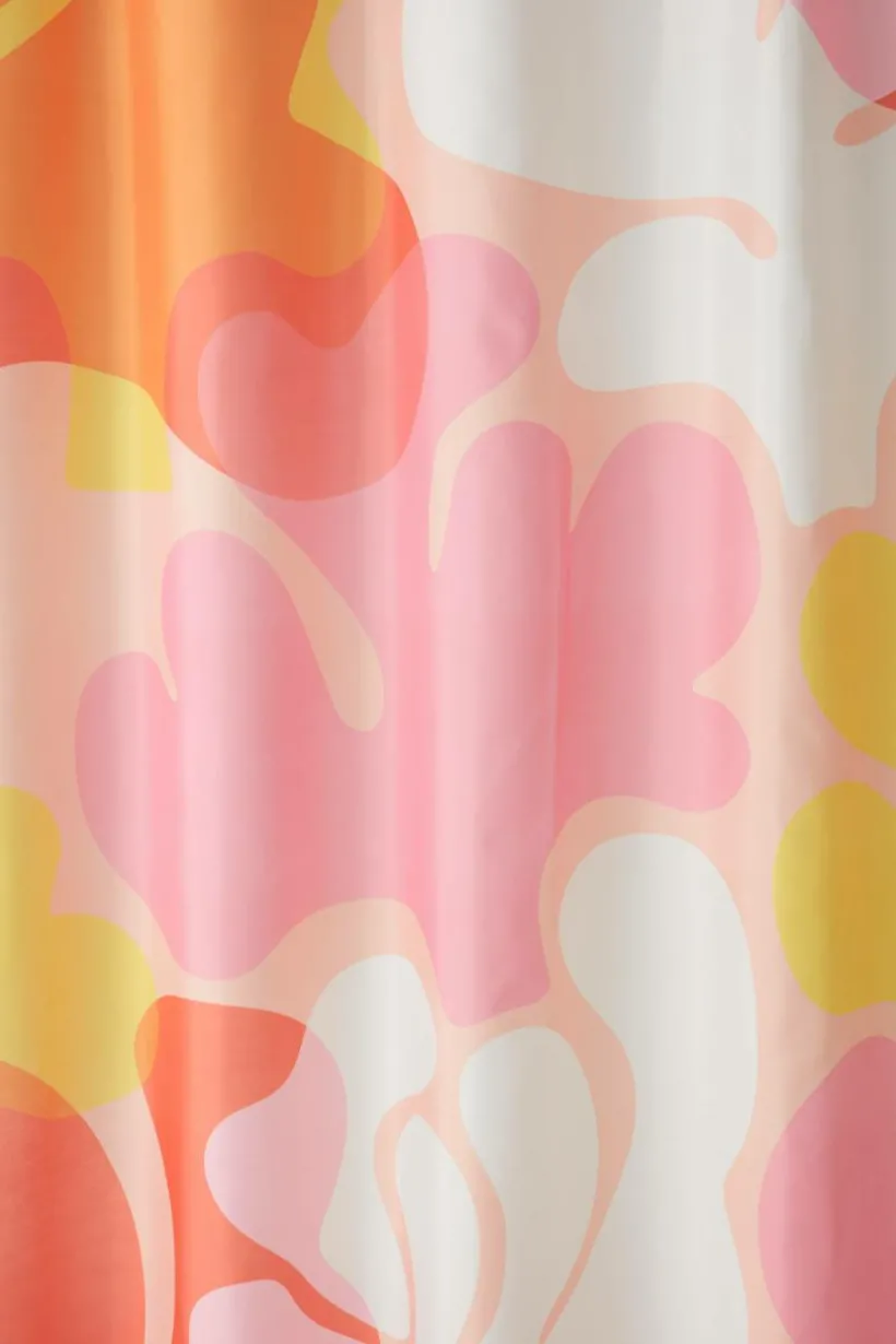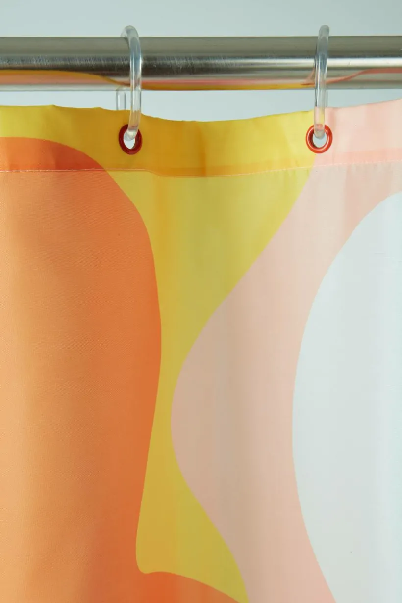 Duschdraperi av polyester med digitaltryckt mönster i harmoniska färger, designat av Maria Carlberg. Både färg och form ger mönstret skön retrokänsla. Digitaltrycket ger distinkt mönster och klara färger. Tyget har vattenavvisande beläggning. Upptill har duschdraperiet 12 metallöljetter i matchande färg. Ringar till upphängningen ingår ej.
