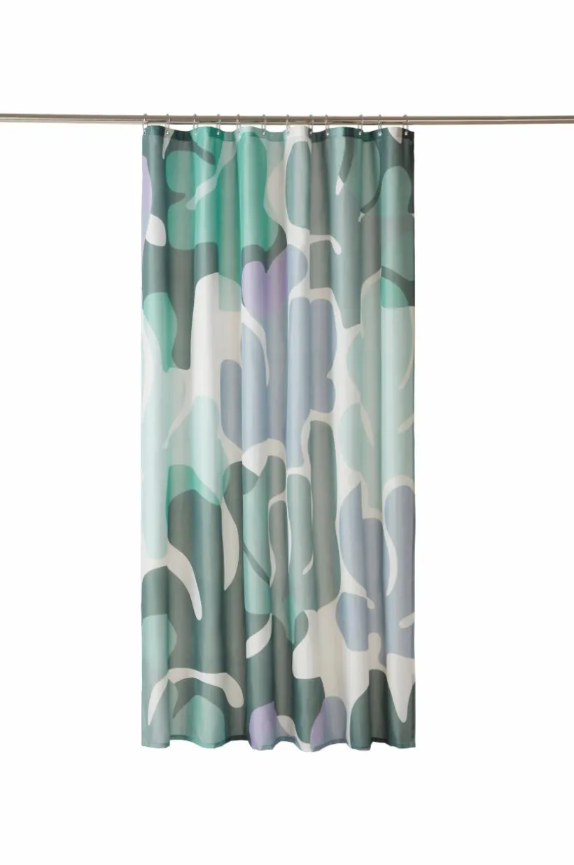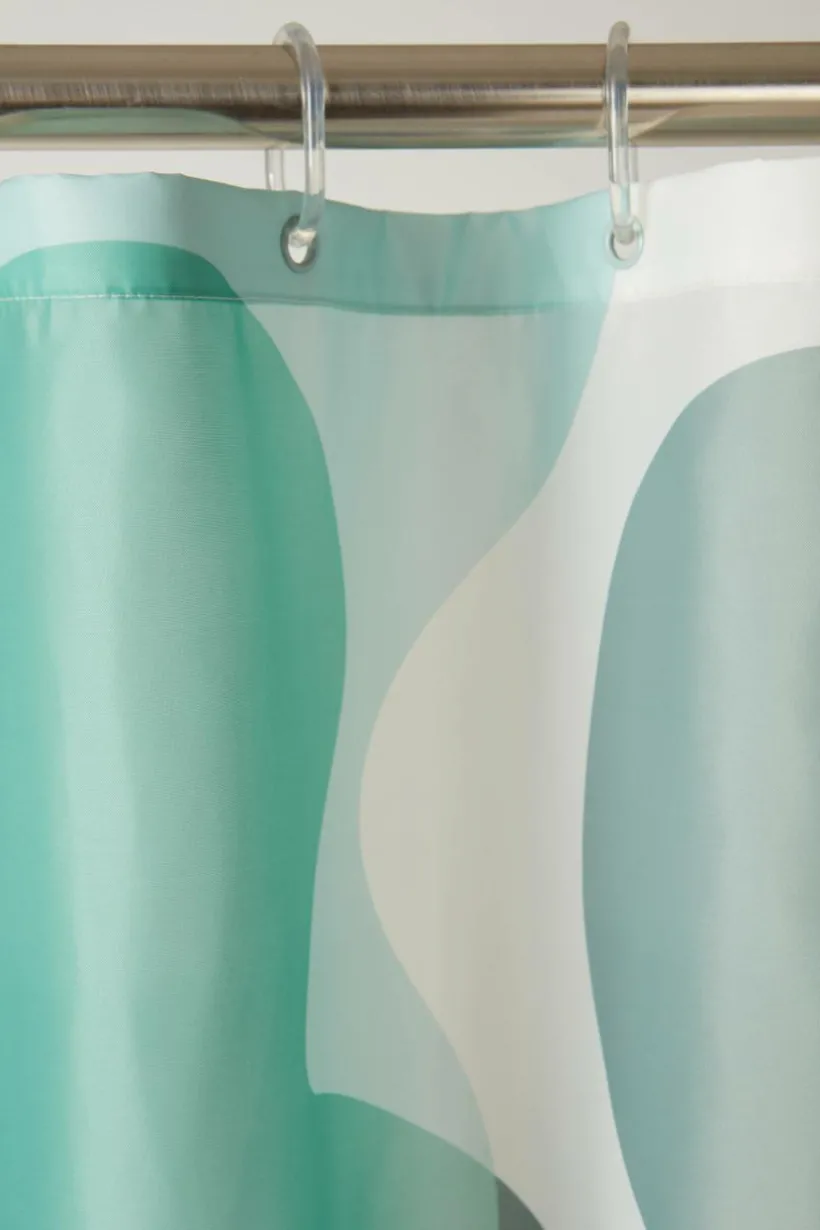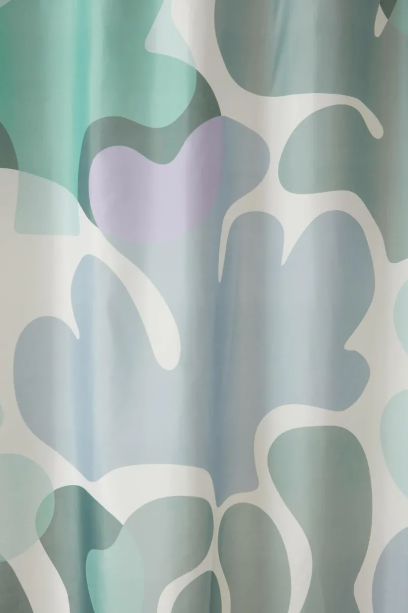 Duschdraperi av polyester med digitaltryckt mönster i harmoniska färger, designat av Maria Carlberg. Både färg och form ger mönstret skön retrokänsla. Digitaltrycket ger distinkt mönster och klara färger. Tyget har vattenavvisande beläggning. Upptill har duschdraperiet 12 metallöljetter i matchande färg. Ringar till upphängningen ingår ej.