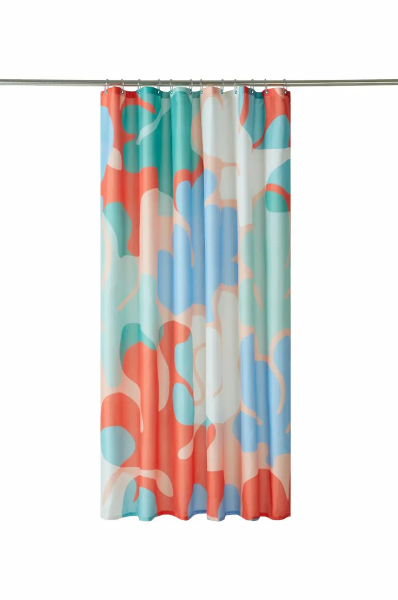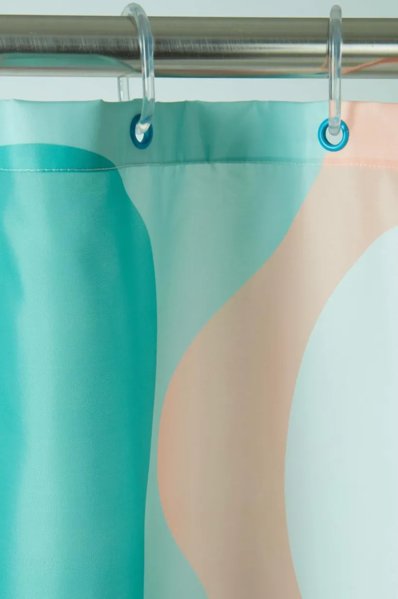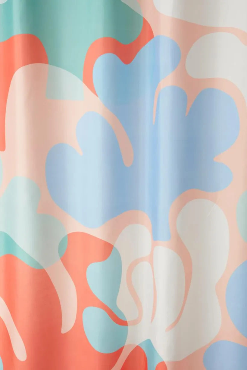 Duschdraperi av polyester med digitaltryckt mönster i harmoniska färger, designat av Maria Carlberg. Både färg och form ger mönstret skön retrokänsla. Digitaltrycket ger distinkt mönster och klara färger. Tyget har vattenavvisande beläggning. Upptill har duschdraperiet 12 metallöljetter i matchande färg. Ringar till upphängningen ingår ej.