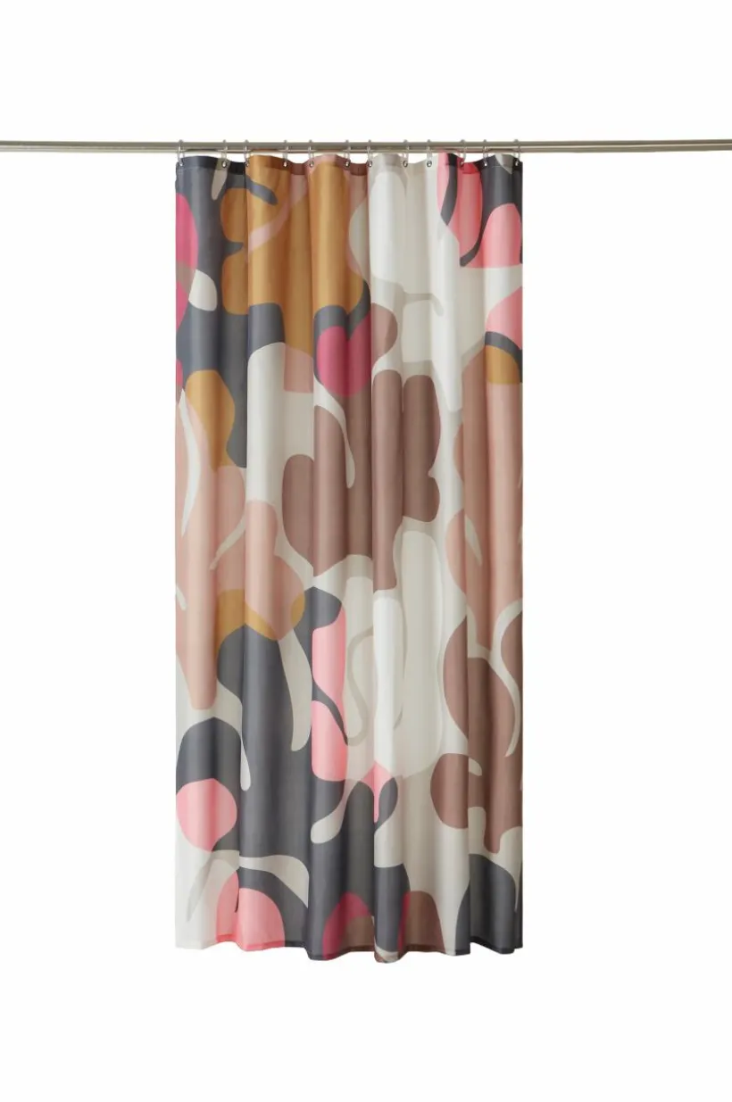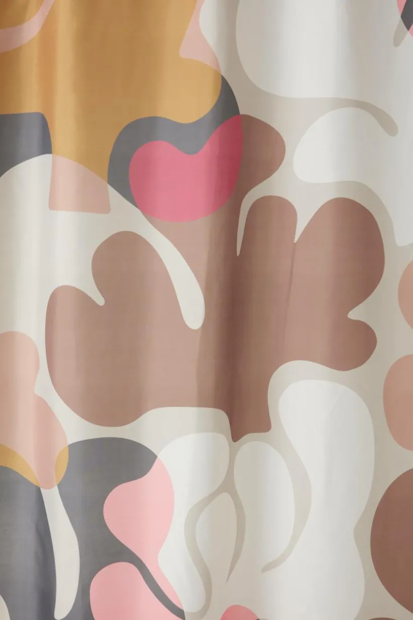 Duschdraperi av polyester med digitaltryckt mönster i harmoniska färger, designat av Maria Carlberg. Både färg och form ger mönstret skön retrokänsla. Digitaltrycket ger distinkt mönster och klara färger. Tyget har vattenavvisande beläggning. Upptill har duschdraperiet 12 metallöljetter i matchande färg. Ringar till upphängningen ingår ej.