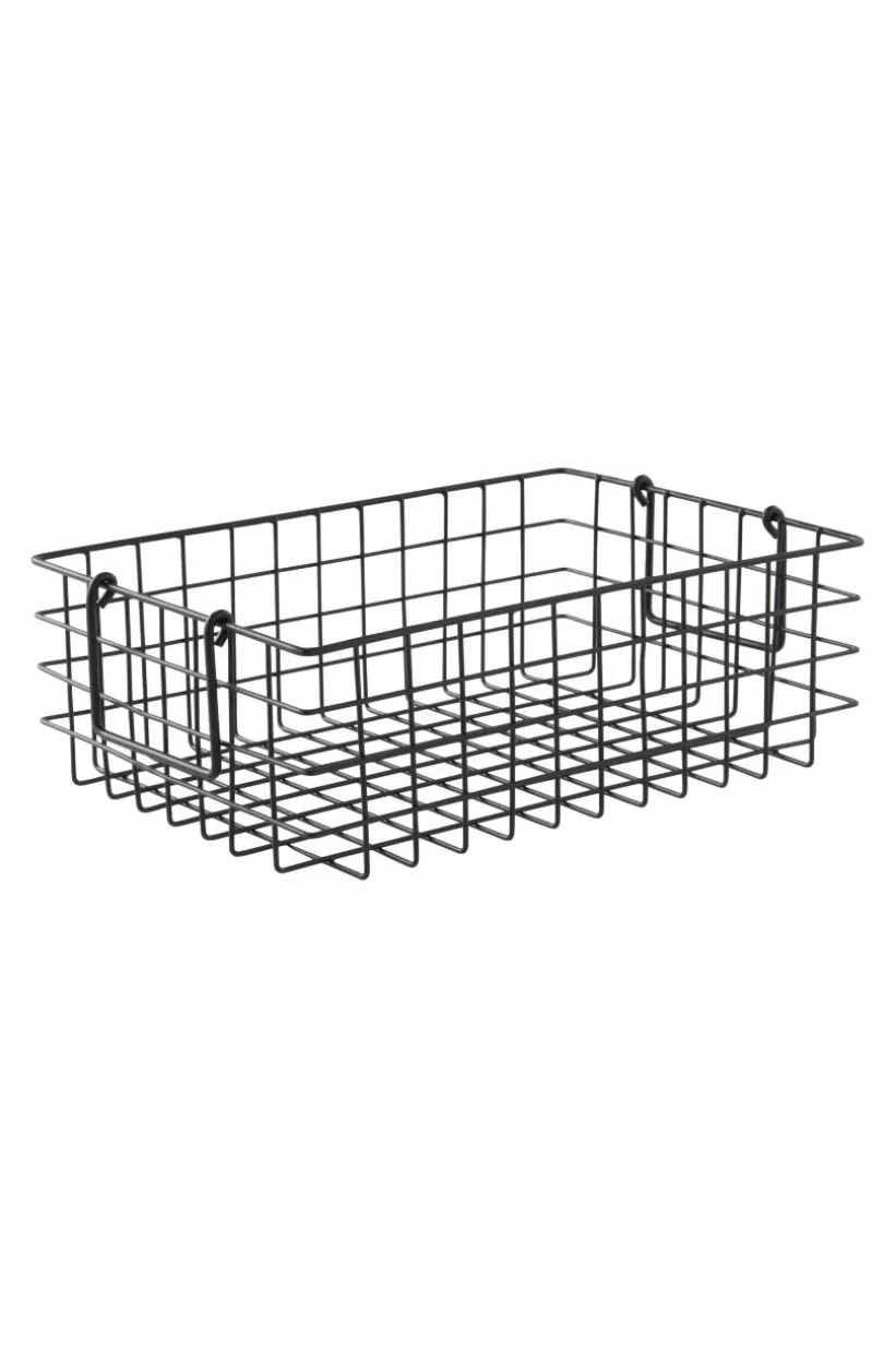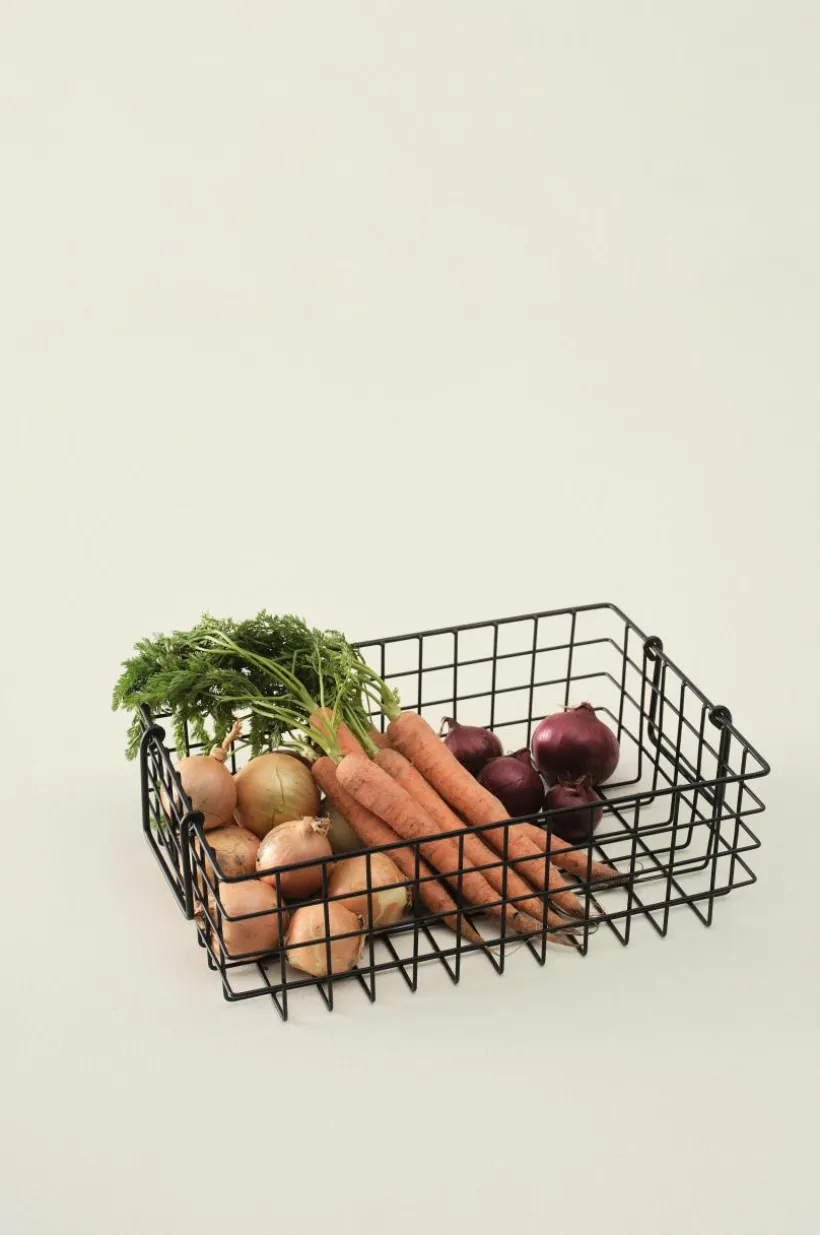 Trådkorg av järn i matt färg. Trådkorgen har två handtag, ett på vardera kortsida som faller ner när du inte bär i dem. Trådkorgen är användbar till mycket, allt från förvaring i lådor och skåp till att dekorera köksbänken med korgen fylld av frukt eller varför inte med vantar i hallen? I barnkammaren blir det enkelt att hitta rätt saker i bokhyllan när barnet ser vad som ryms i korgen.