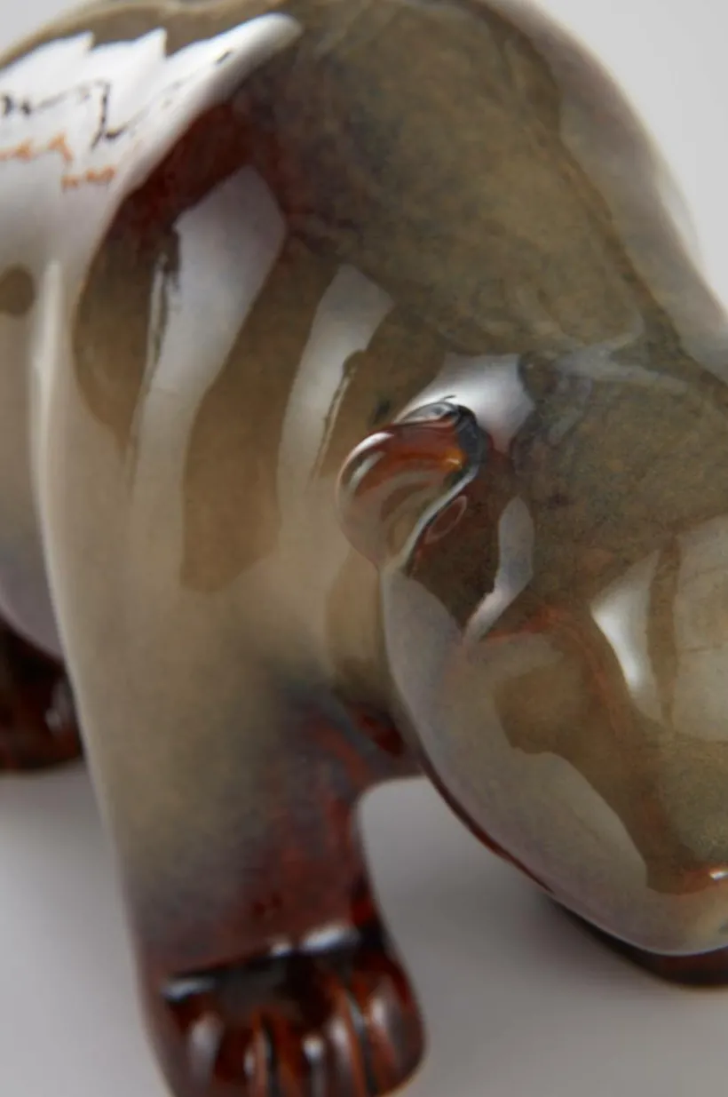 Vacker dekorationsfigur av stengods. Det abstrakta djuret kan ha inspirerats av en förhistorisk grottbjörn. Finishen går i snygga beige och grå nyanser.