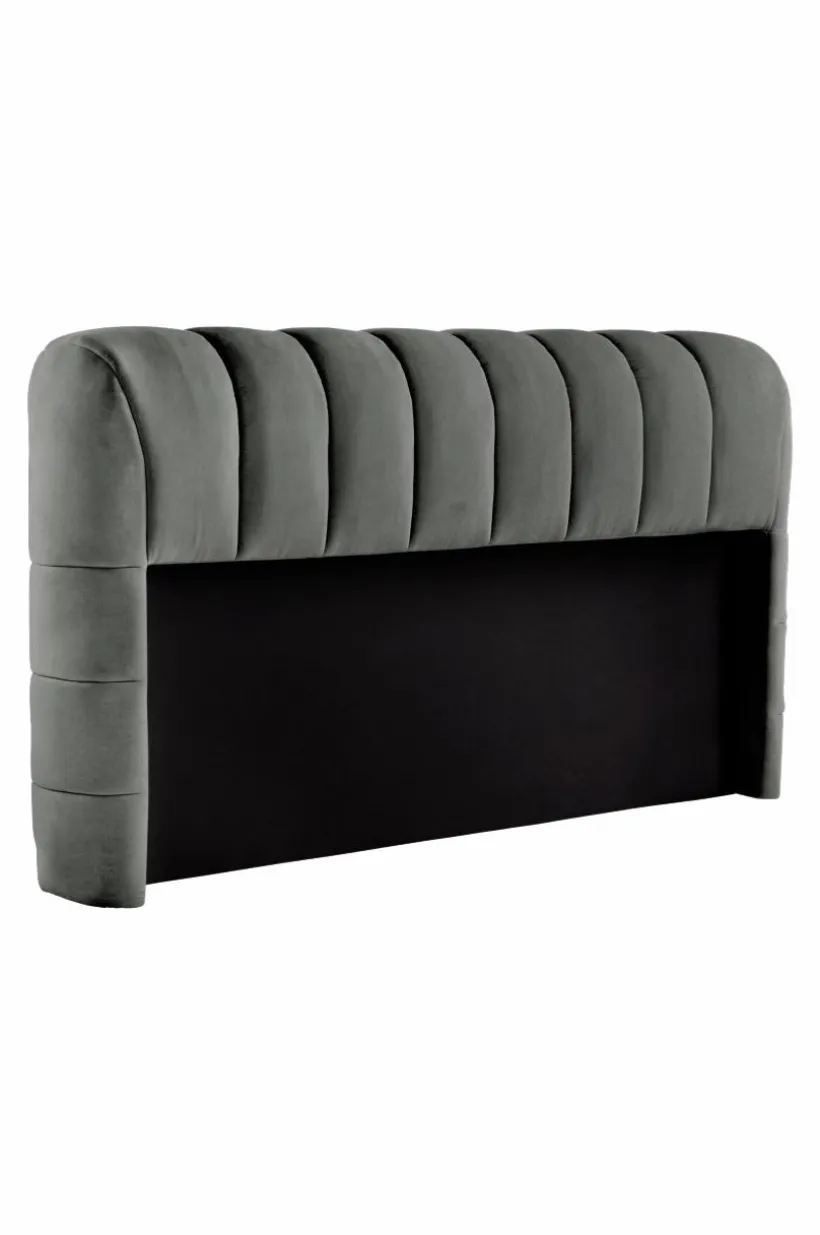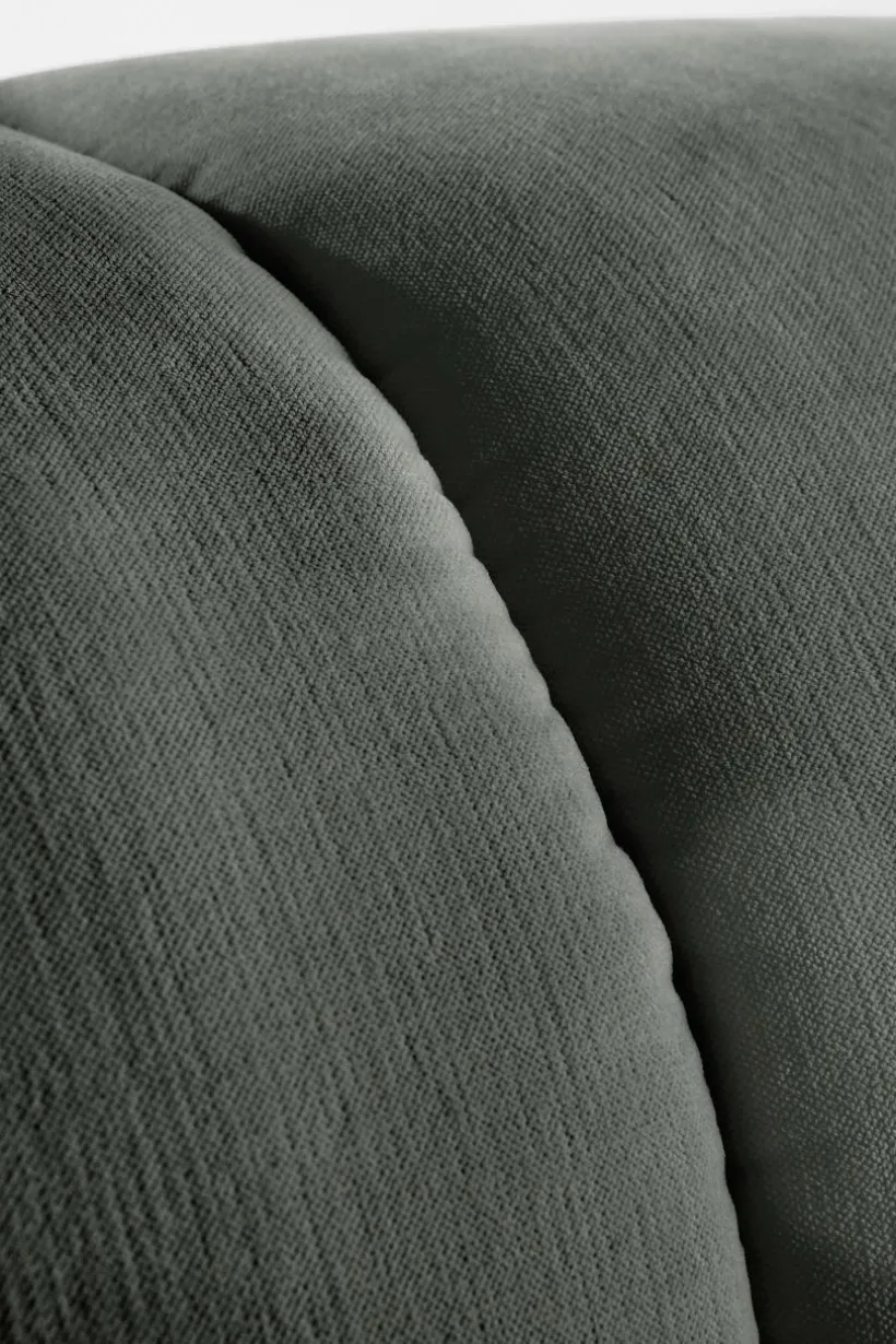 Sänggavel som är mjuk och rund i formen, mycket generös och inbjudande. Sänggaveln är mjukt vadderad och klädd med ett neutralt och lättmatchat, enfärgat polyestertyg, lodräta sömmar gör sängen riktigt snygg. Allt trä i sängen är FSC-certifierat. Stommen är tillverkad av furu och plywood. Denna sänggavel har inte väggfäste, men den står stabilt. Madrass/resårmadrass ingår ej.