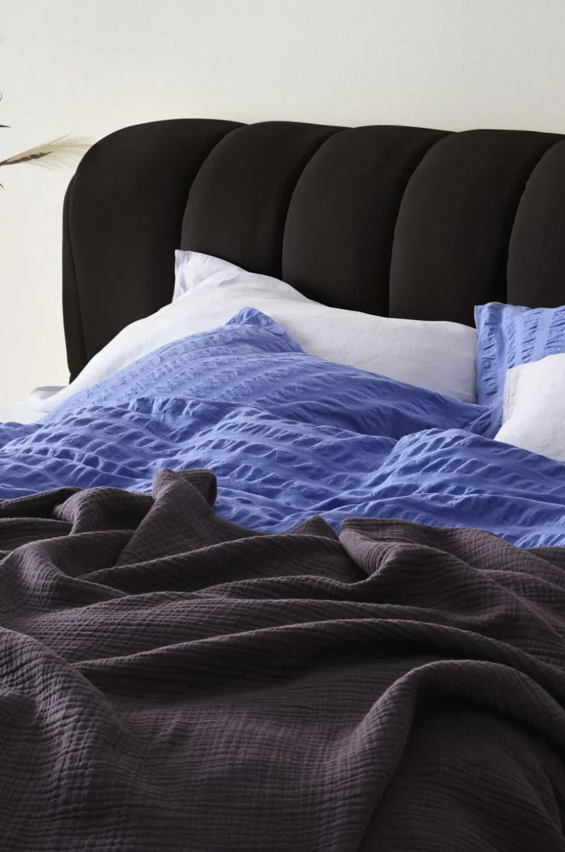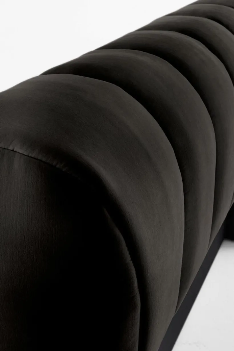 Sänggavel som är mjuk och rund i formen, mycket generös och inbjudande. Sänggaveln är mjukt vadderad och klädd med ett neutralt och lättmatchat, enfärgat polyestertyg, lodräta sömmar gör sängen riktigt snygg. Allt trä i sängen är FSC-certifierat. Stommen är tillverkad av furu och plywood. Denna sänggavel har inte väggfäste, men den står stabilt. Madrass/resårmadrass ingår ej.
