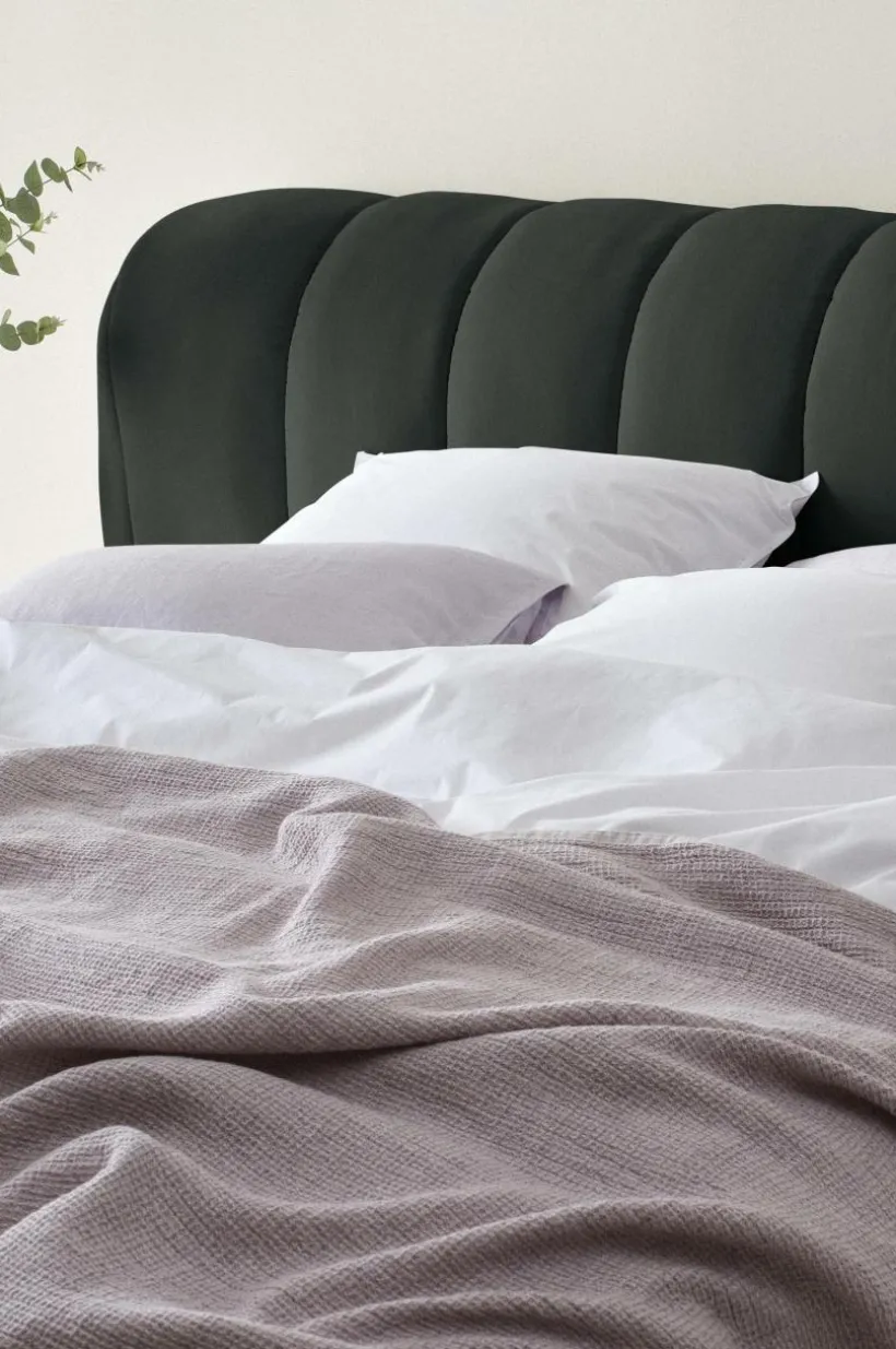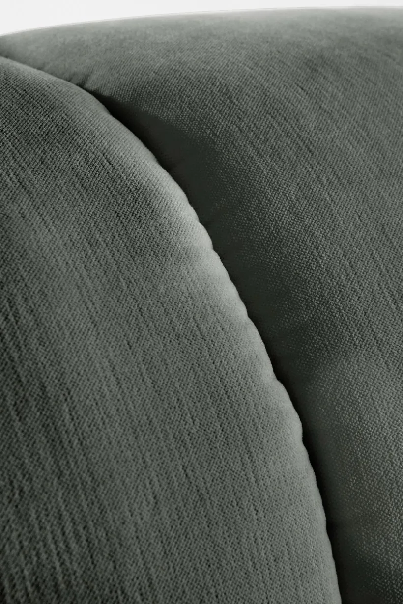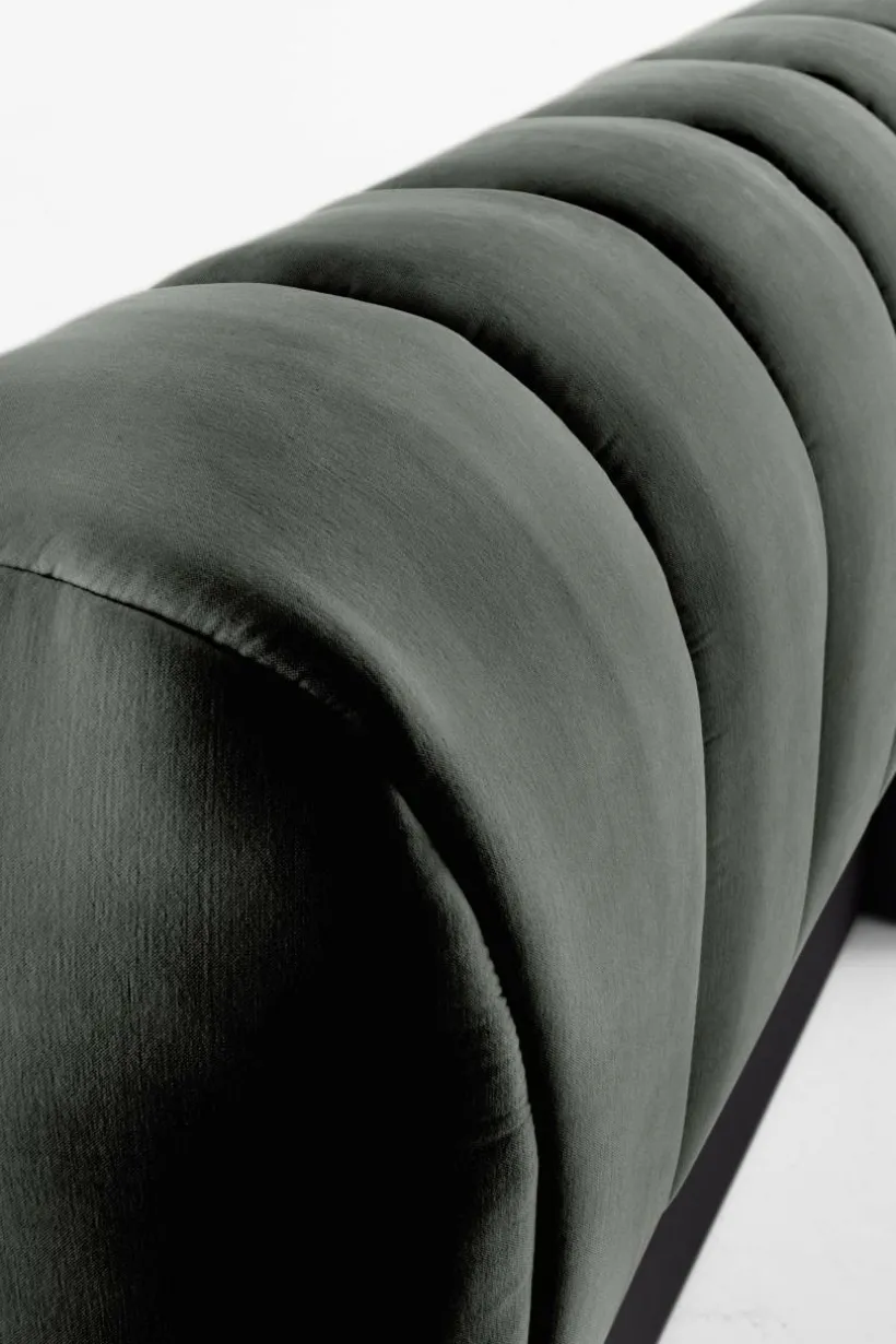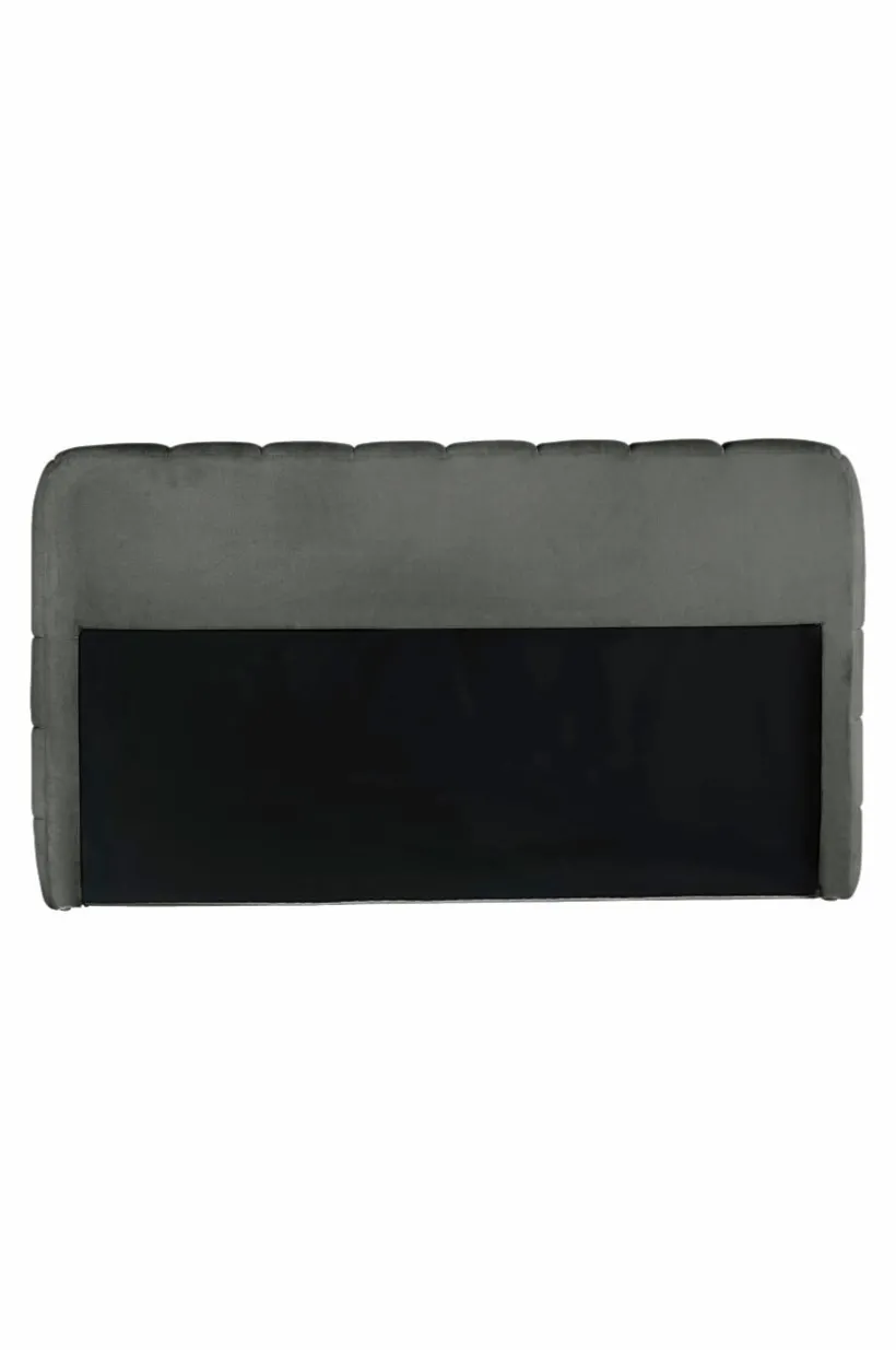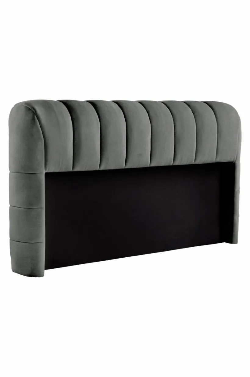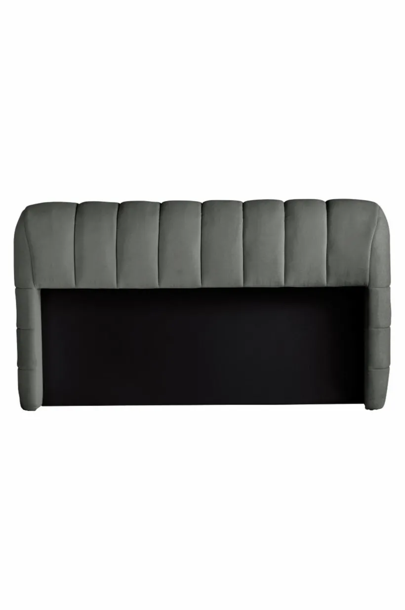 Sänggavel som är mjuk och rund i formen, mycket generös och inbjudande. Sänggaveln är mjukt vadderad och klädd med ett neutralt och lättmatchat, enfärgat polyestertyg, lodräta sömmar gör sängen riktigt snygg. Allt trä i sängen är FSC-certifierat. Stommen är tillverkad av furu och plywood. Denna sänggavel har inte väggfäste, men den står stabilt. Madrass/resårmadrass ingår ej.