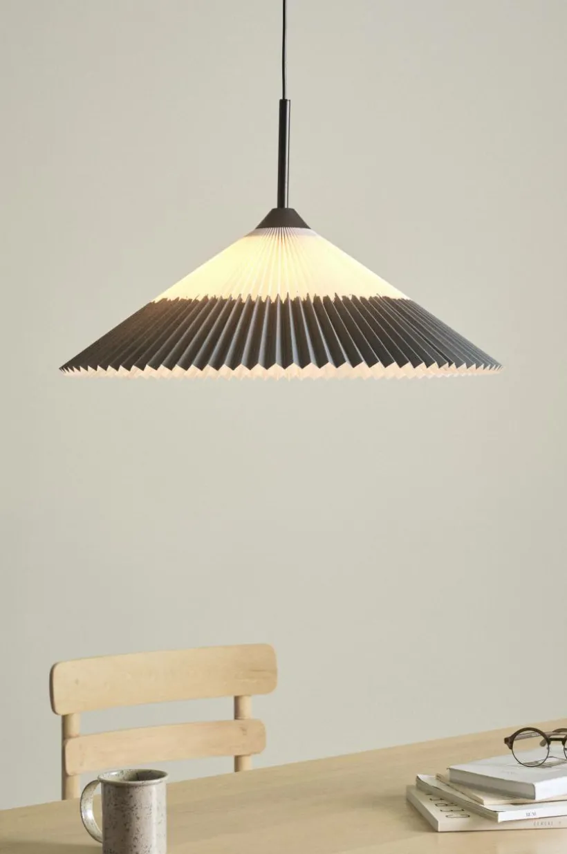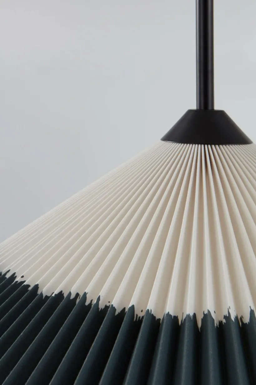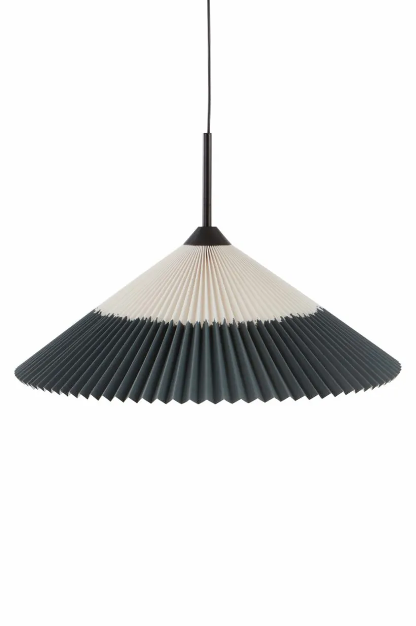 Taklampa med veckad textilskärm och metalldetaljer med matt finish. Skärmen är snyggt färgad med lätt batikkänsla i färgningen. Takkopp av metall med krokupphänge. Svart sladd. Lampan är jordad, klass 1. På grund av EU-regler behövs en separat takkontakt i vissa länder. Takkontakten ska vara jordad (klass 1) och köps separat.