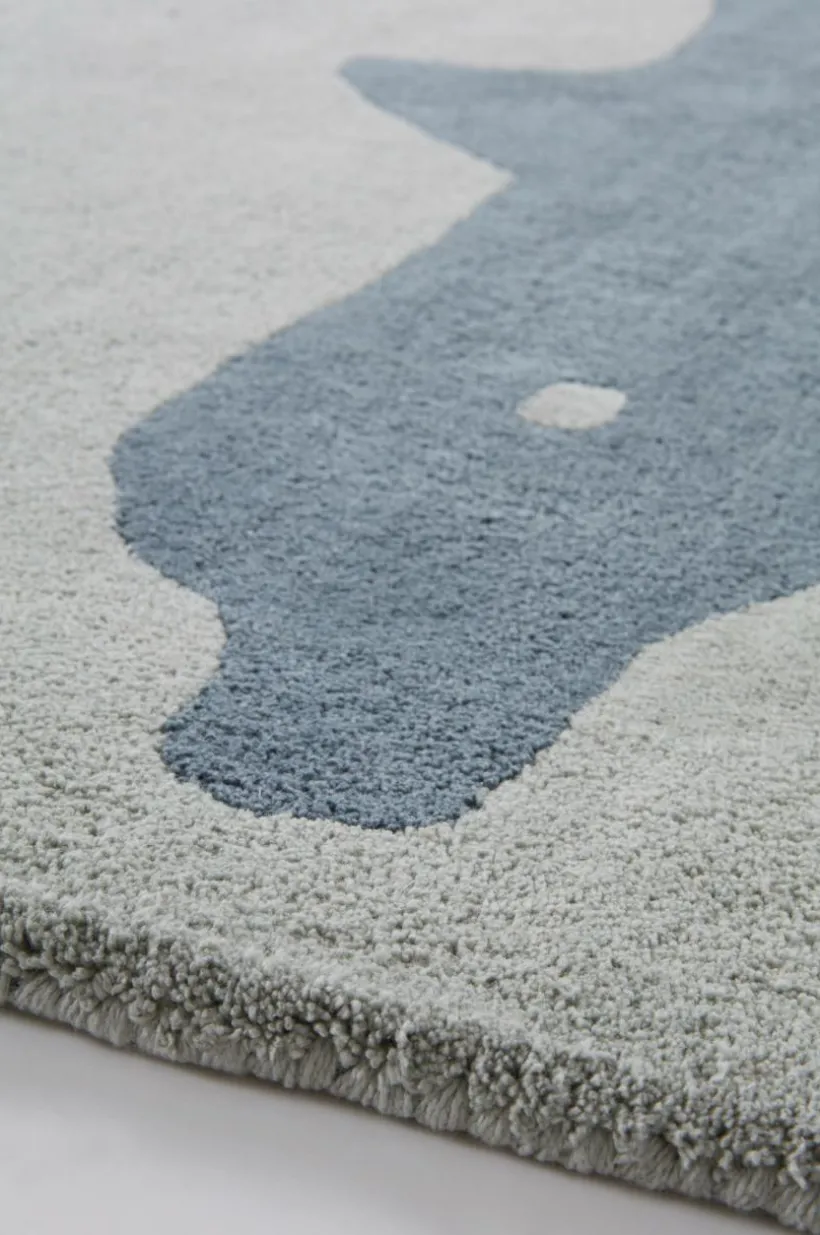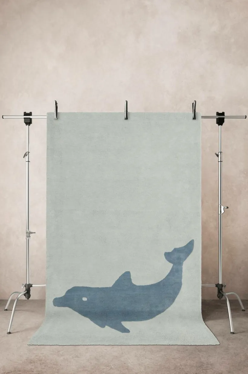 Underbar, handtuftad matta i ekologisk bomull med delfinmotiv i milda färger. Mattan är mjuk och skön, härligt om barn vill sitta och leka på golvet. Lugghöjd 0,9-1,1 cm. Tjocklek 1,4-1,5 cm. 3200-3400 g/m².