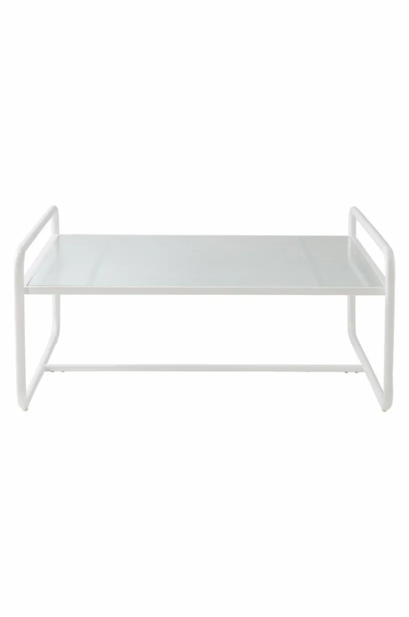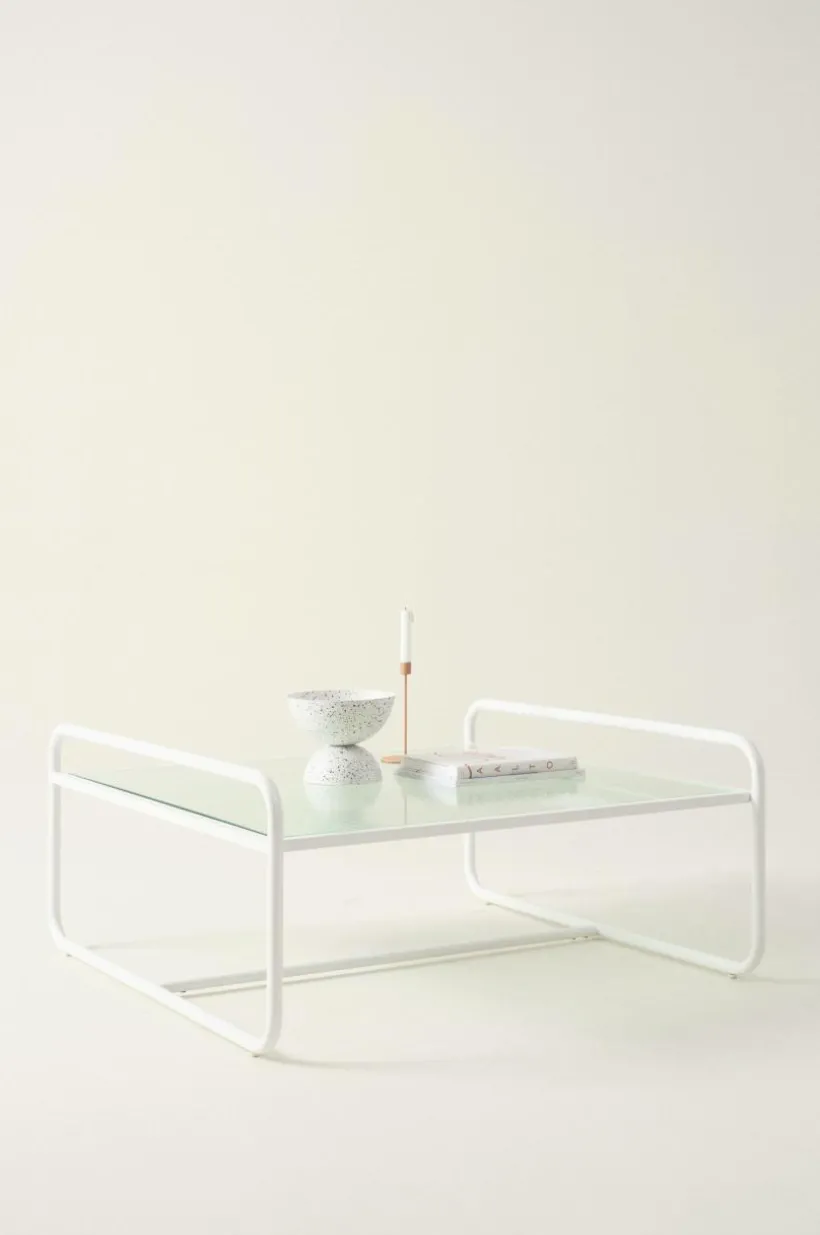 Storlek: Höjd 45 cm, 100×100 cm. Stålrör ø 3,2 cm. Tjocklek glas: 8 mm.