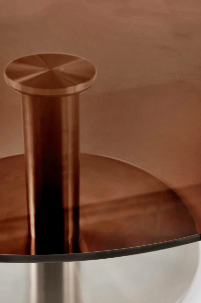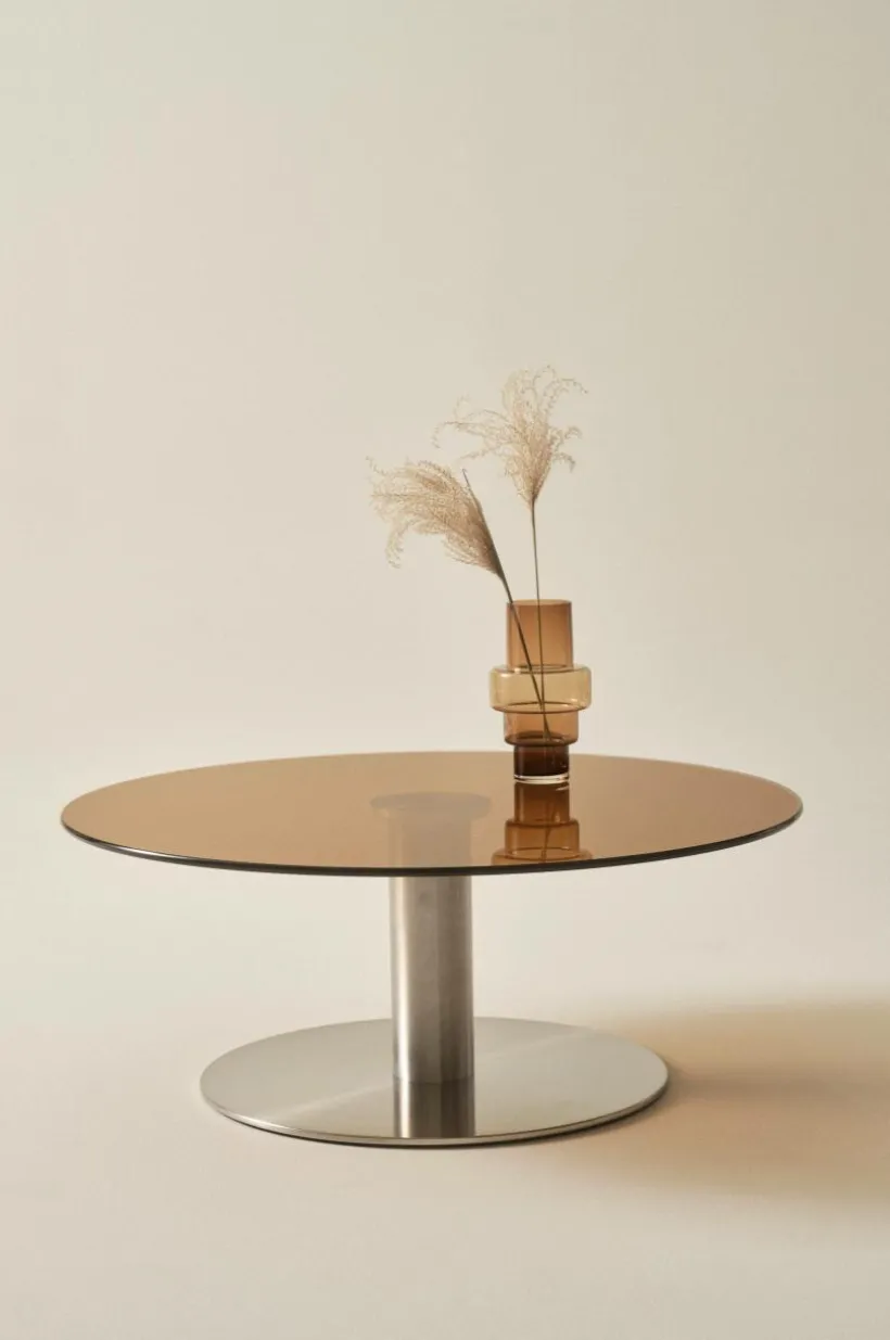 Runt soffbord med bordsskiva av glas och pelarfot av rostfritt stål med borstad yta. Foten är rak och stilren och harmonierar fint till bordsskivan av glas där mittpunkten skapar ett snyggt centrum genom att foten syns genom glaset. Den låga höjden på bordet ger skön loungekänsla vid soffan. Viss montering krävs. Monteringsanvisning medföljer.