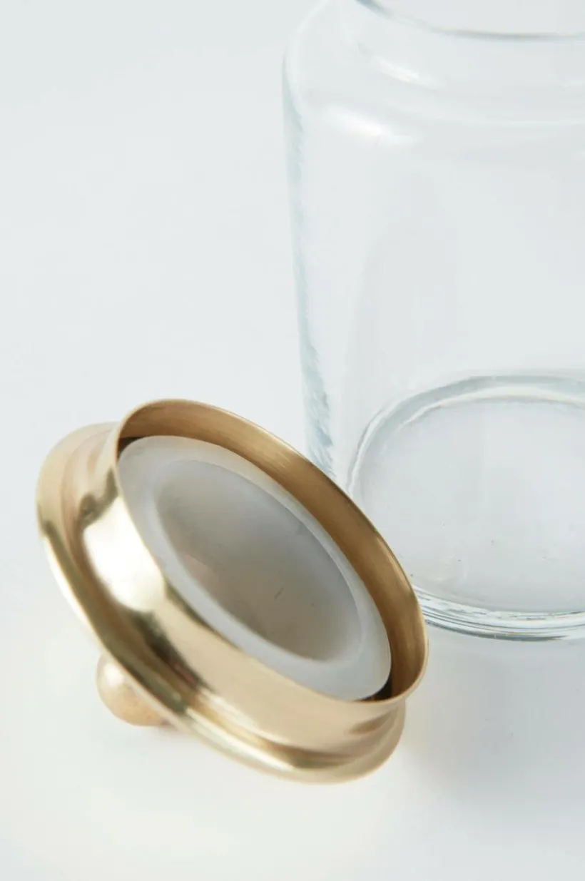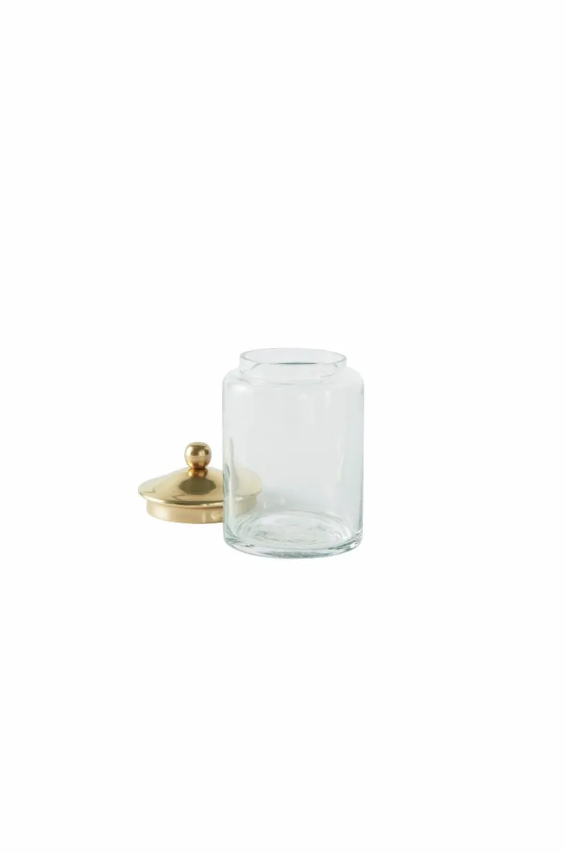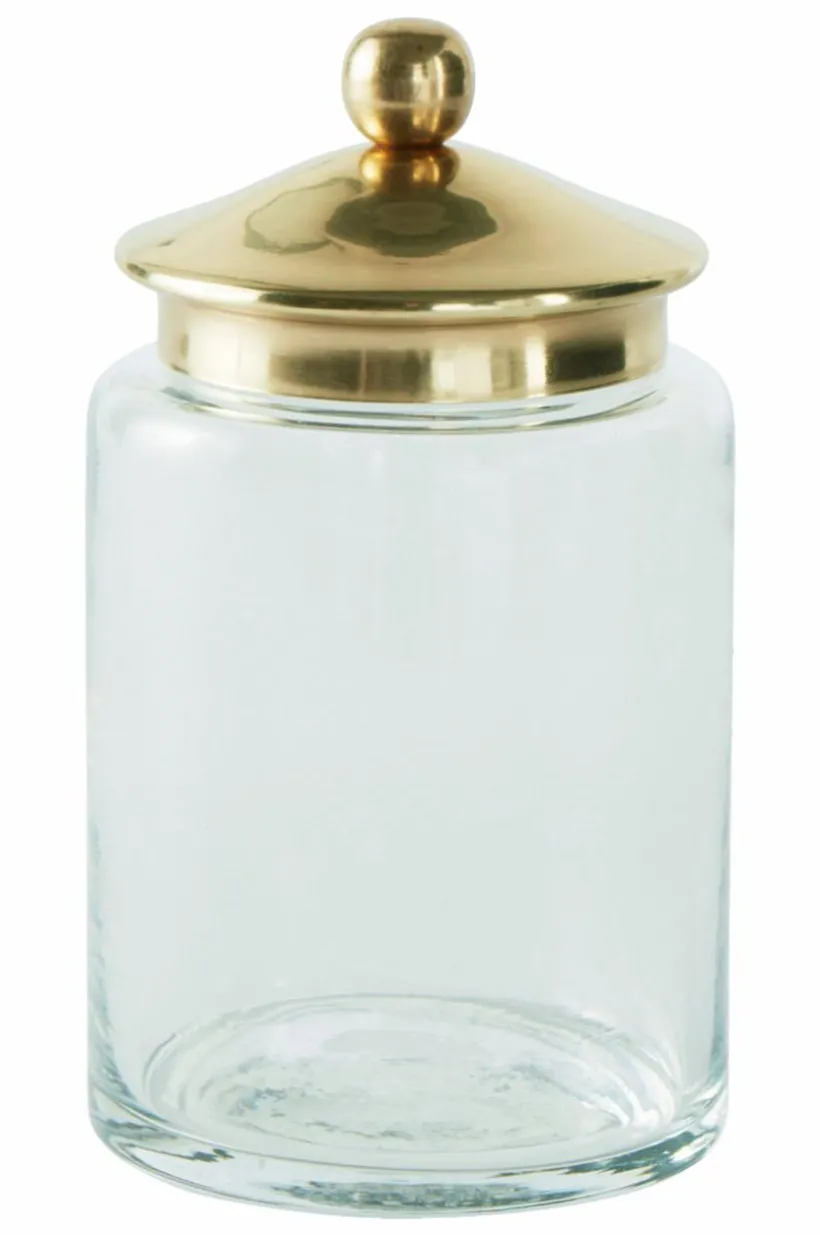 Burk av glas med lock av metall. Det lilla metallocket har en fin antikguldfärgad finish.