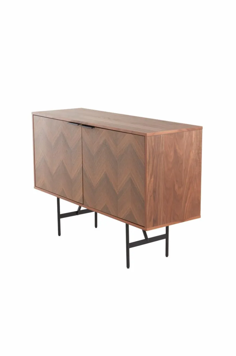 Retroinspirerat sideboard i valnötsfaner med fiskbenslook och metallben. Bordet har två luckor och hyllplan med plats för förvaring. Viss montering krävs. Monteringsanvisning medföljer.