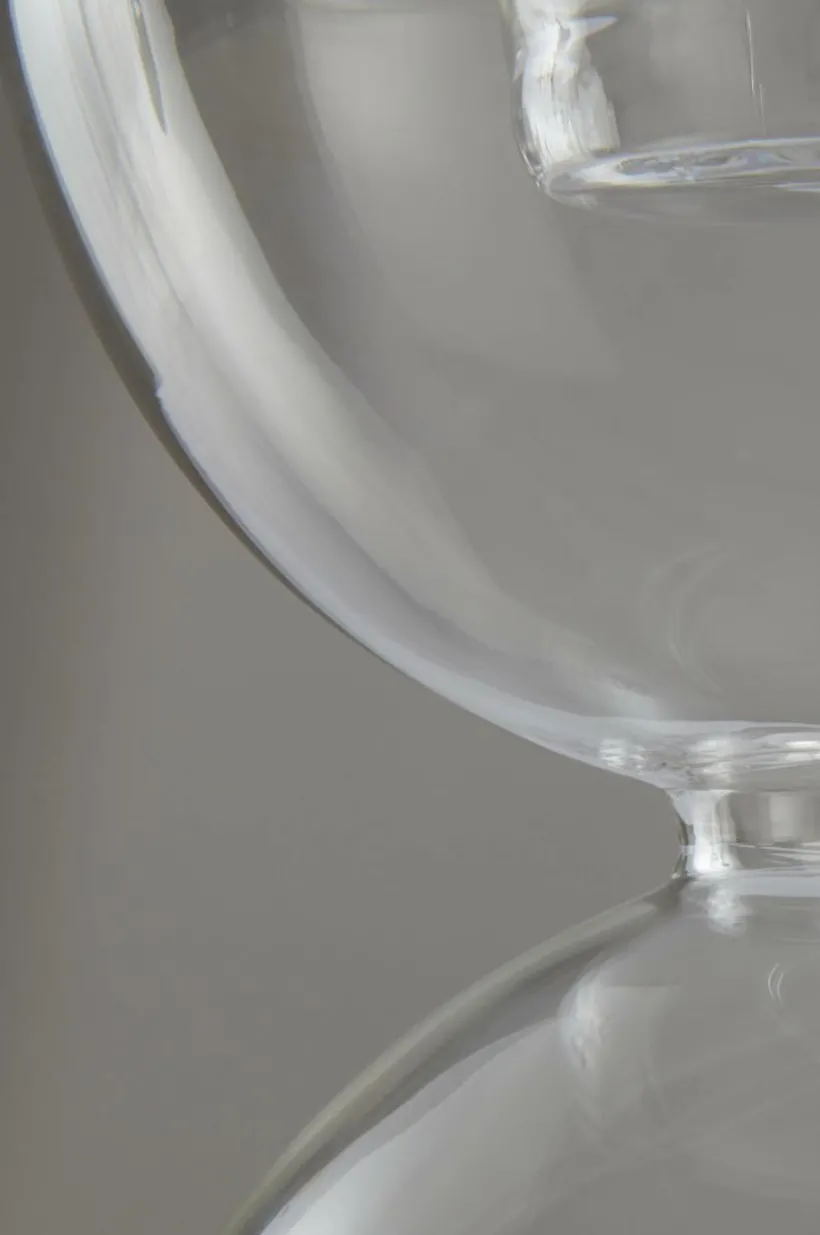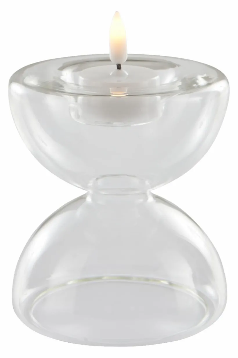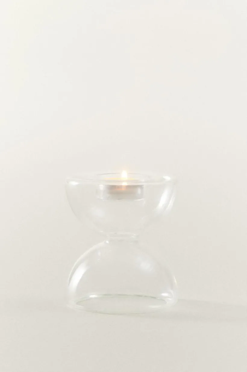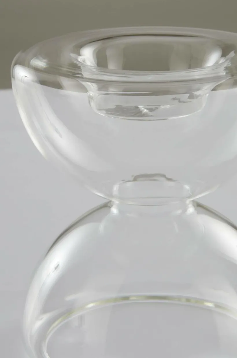 ECHO är en handgjord ljusstake av glas, mjukt formad likt ett timglas. Ljusstaken passar till värmeljus.