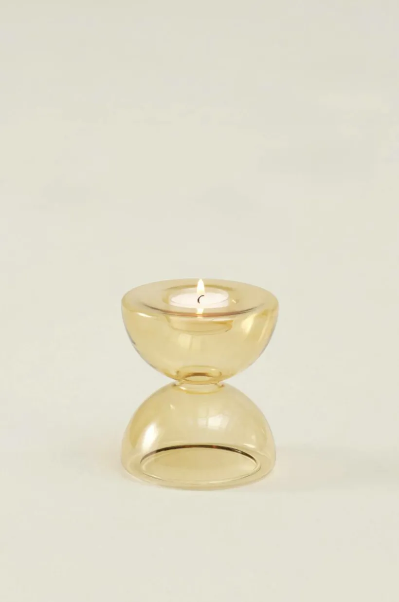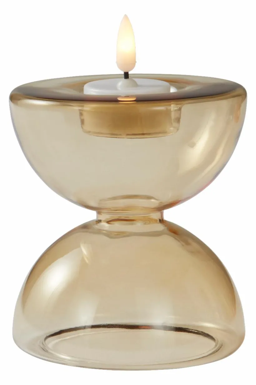ECHO är en handgjord ljusstake av glas, mjukt formad likt ett timglas. Ljusstaken passar till värmeljus.