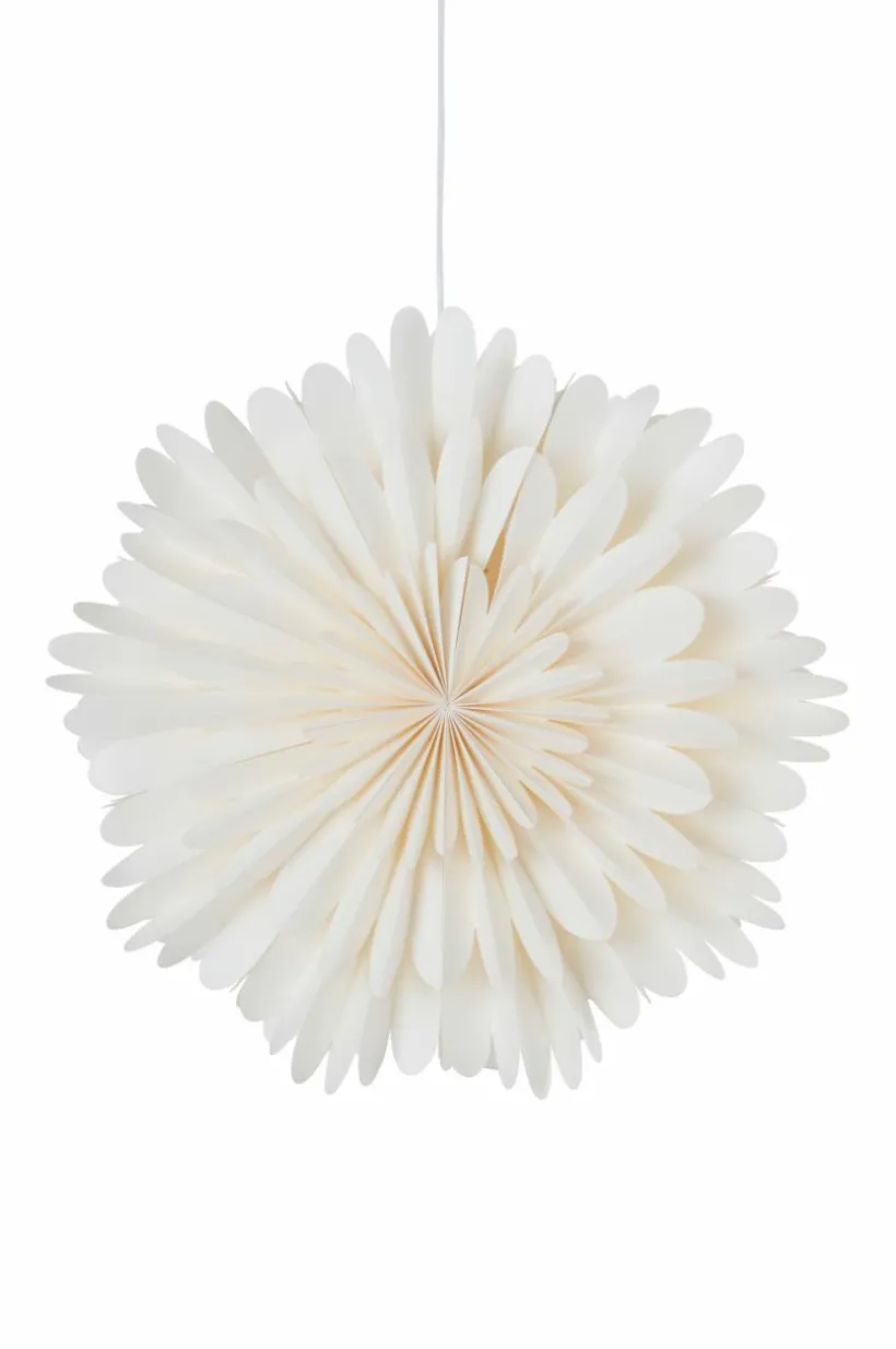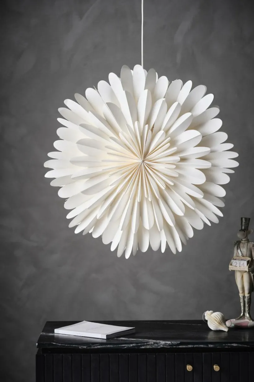 EIRA julstjärna förvandlar ditt vardagsrum med en touch av vintermagi. Denna utsökta stjärna är formad som en snöflinga/blomma och ger ett förtrollande sken. Förpackad i en robust vit låda levereras den komplett med lamphållare, glödlampsskydd och enkla monteringsanvisningar. Med en generös diameter på 68 cm skapar EIRA-stjärnan en festlig atmosfär som fängslar och förtrollar. Den är perfekt som säsongsbelysning och ger inredningen en modern och trendig touch.
