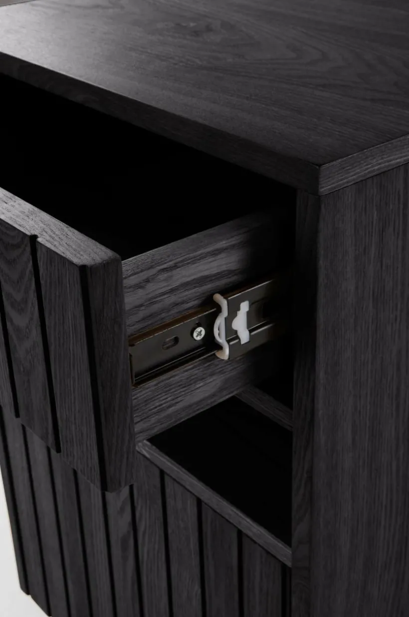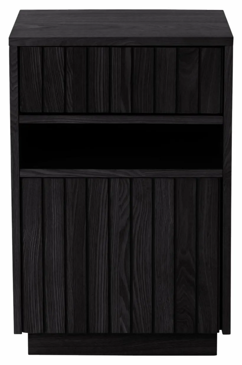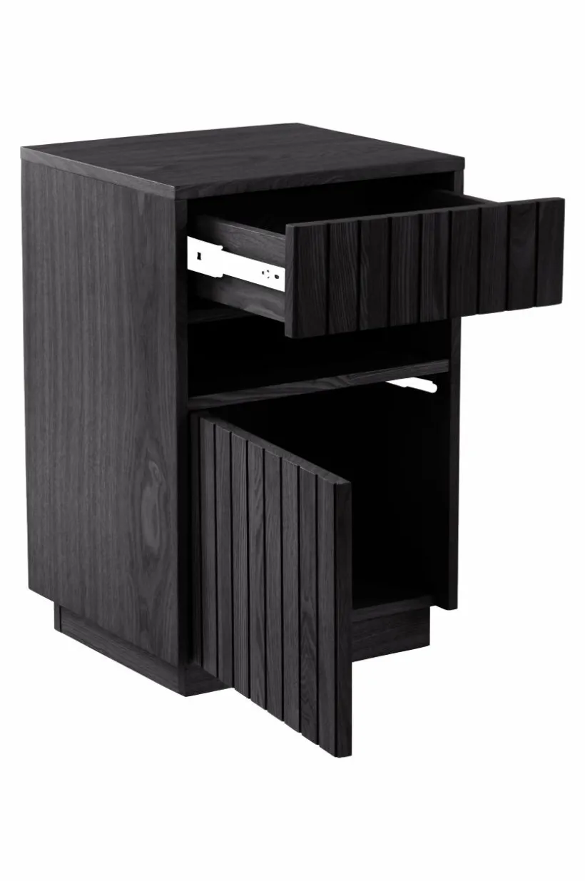 Sängbord av MDF med askfaner. Fronten på lådan och skåpsdörren har urfrästa spår som ger känslan av ribbor vilket ger skön retrokänsla. Både lådan och dörren har pushfunktion som ger sängbordet en stilren front utan handtag. Sladdhål i bakstycket. Dörren kan monteras högerhängd eller vänsterhängd, och sängbordet kan således placeras på båda sidor om sängen. Viss montering krävs. Monteringsanvisning medföljer.