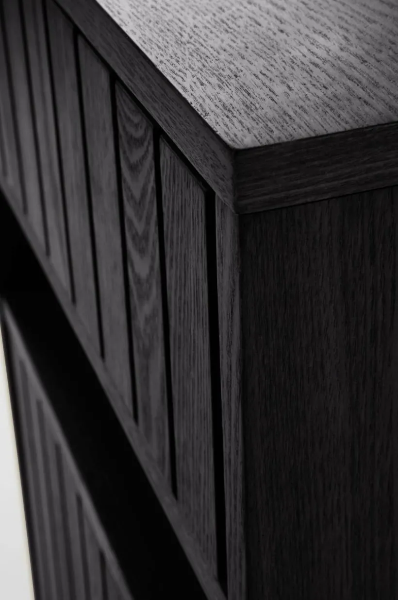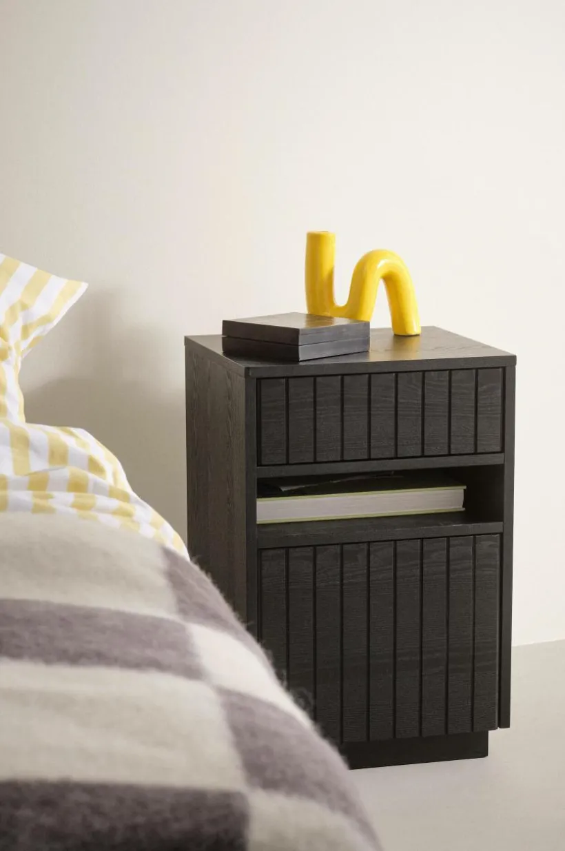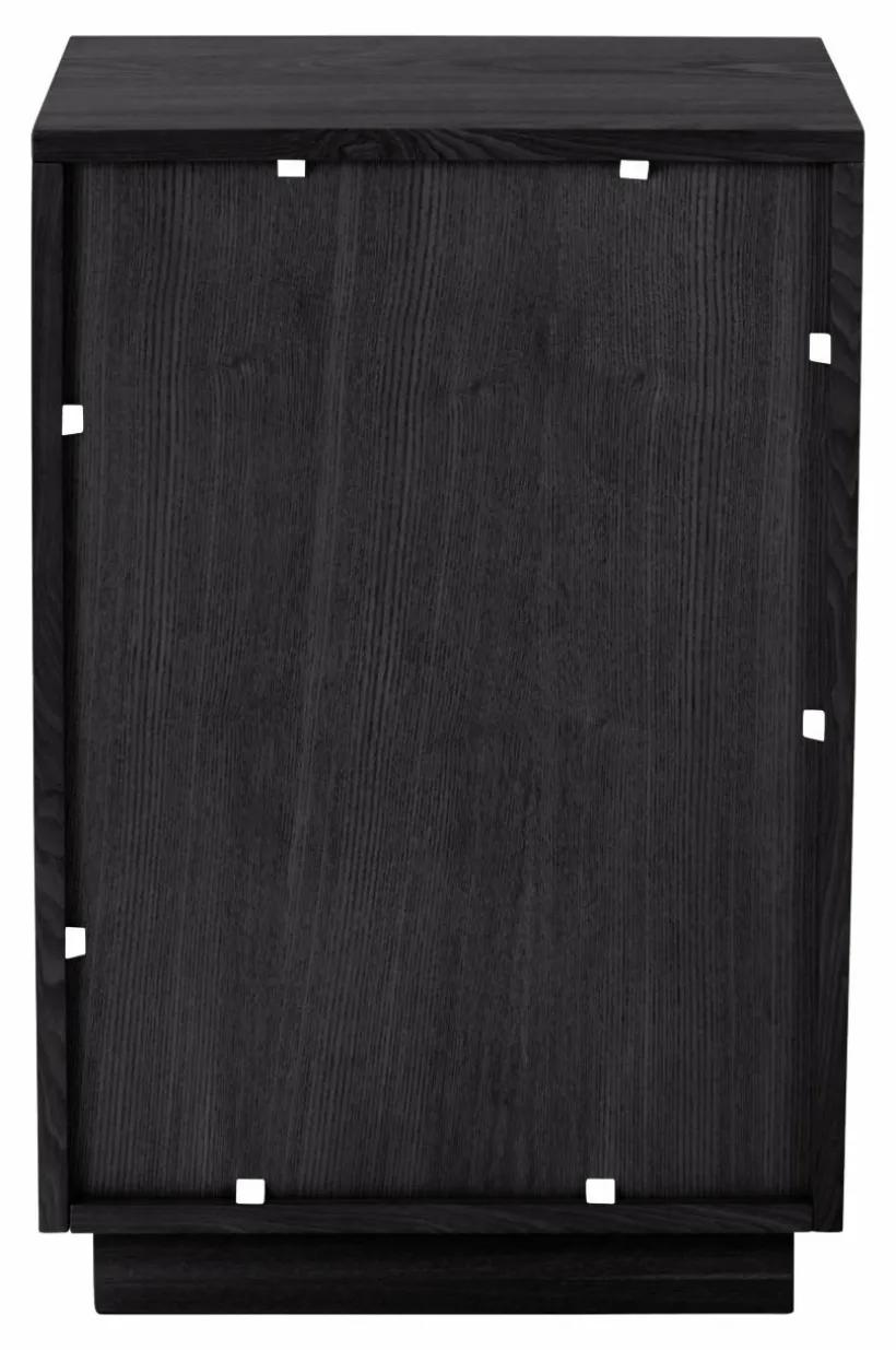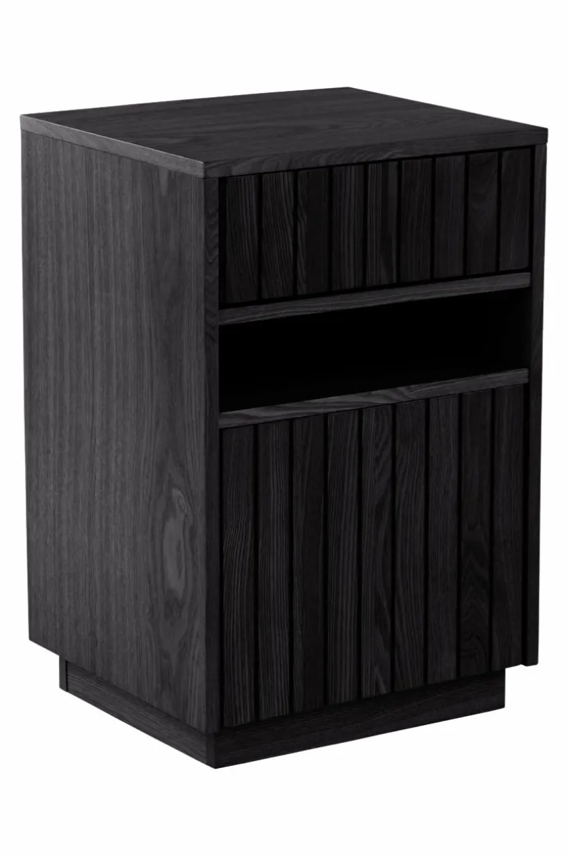 Sängbord av MDF med askfaner. Fronten på lådan och skåpsdörren har urfrästa spår som ger känslan av ribbor vilket ger skön retrokänsla. Både lådan och dörren har pushfunktion som ger sängbordet en stilren front utan handtag. Sladdhål i bakstycket. Dörren kan monteras högerhängd eller vänsterhängd, och sängbordet kan således placeras på båda sidor om sängen. Viss montering krävs. Monteringsanvisning medföljer.