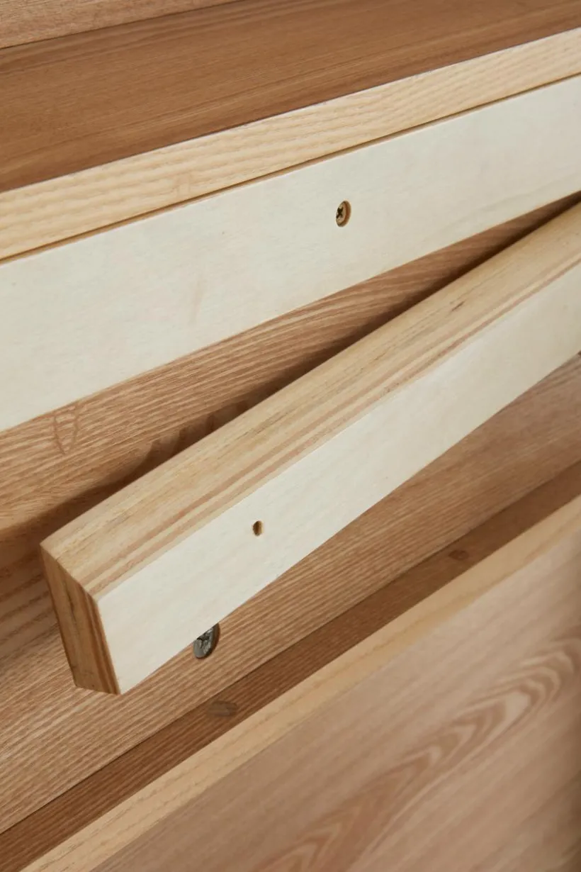 Sänggavel av askfaner med urfrästa spår som ger känslan av ribbor, intrycket du får är en mix av trä och retro. Sänggaveln är djup och har ett praktiskt fack där du kan förvara din bok, mobiltelefon eller ett glas vatten. Sänggaveln är fristående och placeras mellan sängen och väggen. Väggfäste medföljer.