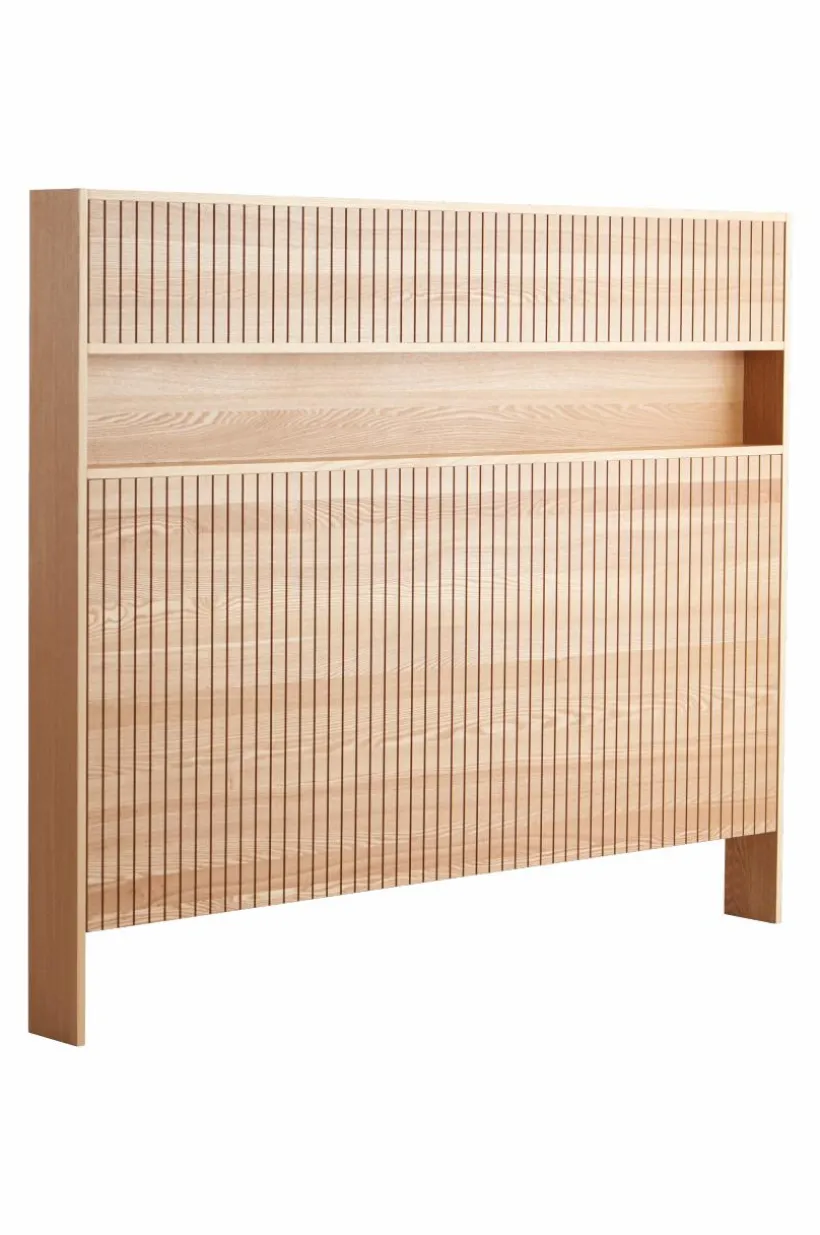 Sänggavel av askfaner med urfrästa spår som ger känslan av ribbor, intrycket du får är en mix av trä och retro. Sänggaveln är djup och har ett praktiskt fack där du kan förvara din bok, mobiltelefon eller ett glas vatten. Sänggaveln är fristående och placeras mellan sängen och väggen. Väggfäste medföljer.