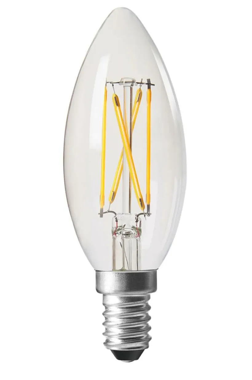 Varmvit LED-glödlampa med E14-sockel. Den är designad med flera glödtrådsstavar och återskapar det nostalgiska skenet från traditionella lyktlampor.