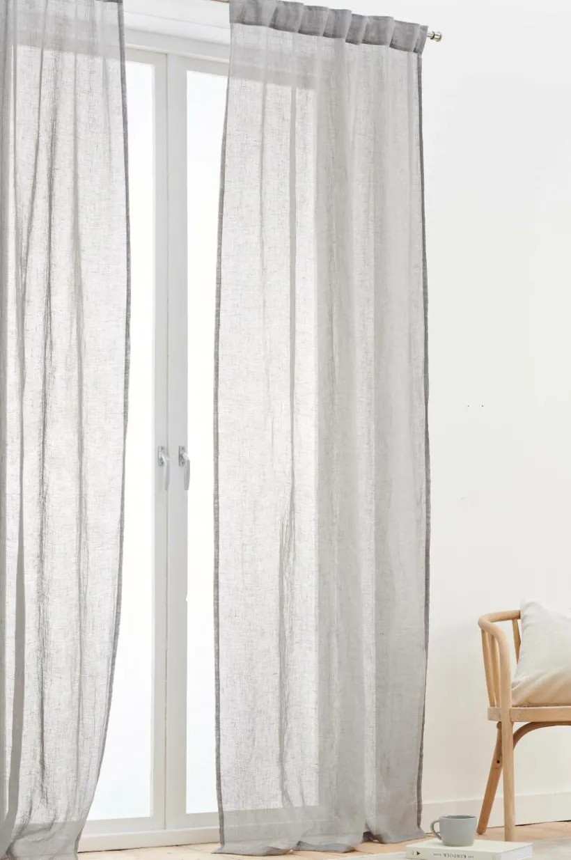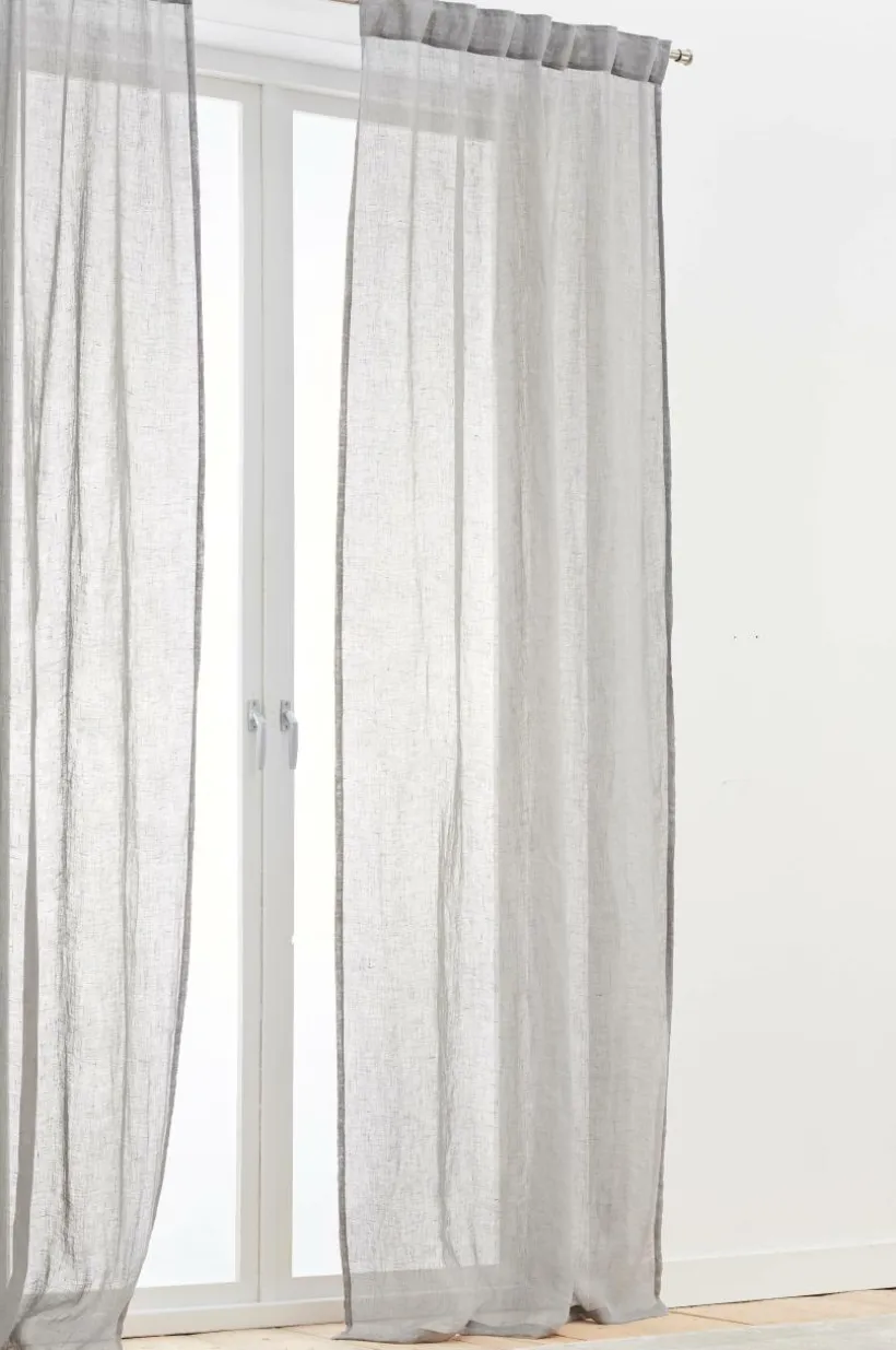 Två gardinlängder i luftigt linne med påsytt multifunktionsband. Gardinen kan hängas upp med fingerkrokar, kanal samt dold hälla.