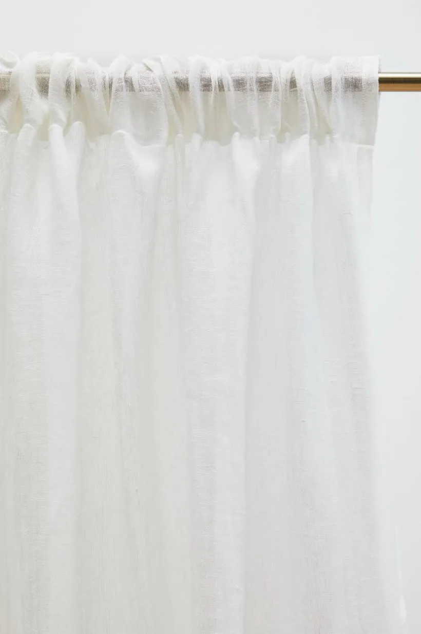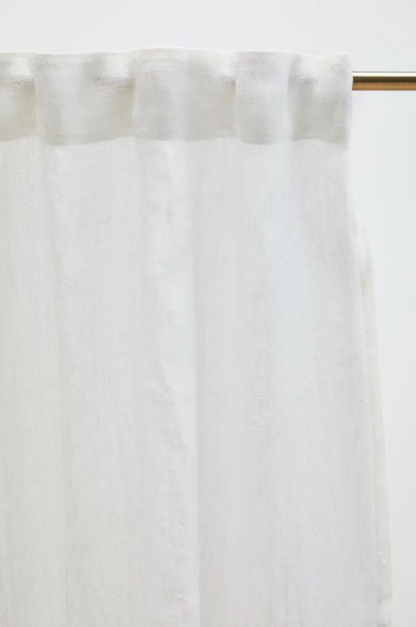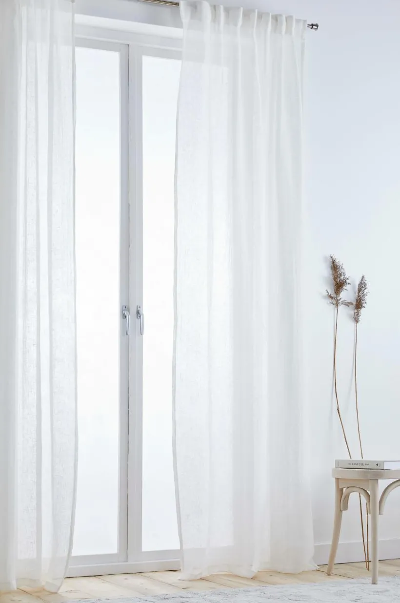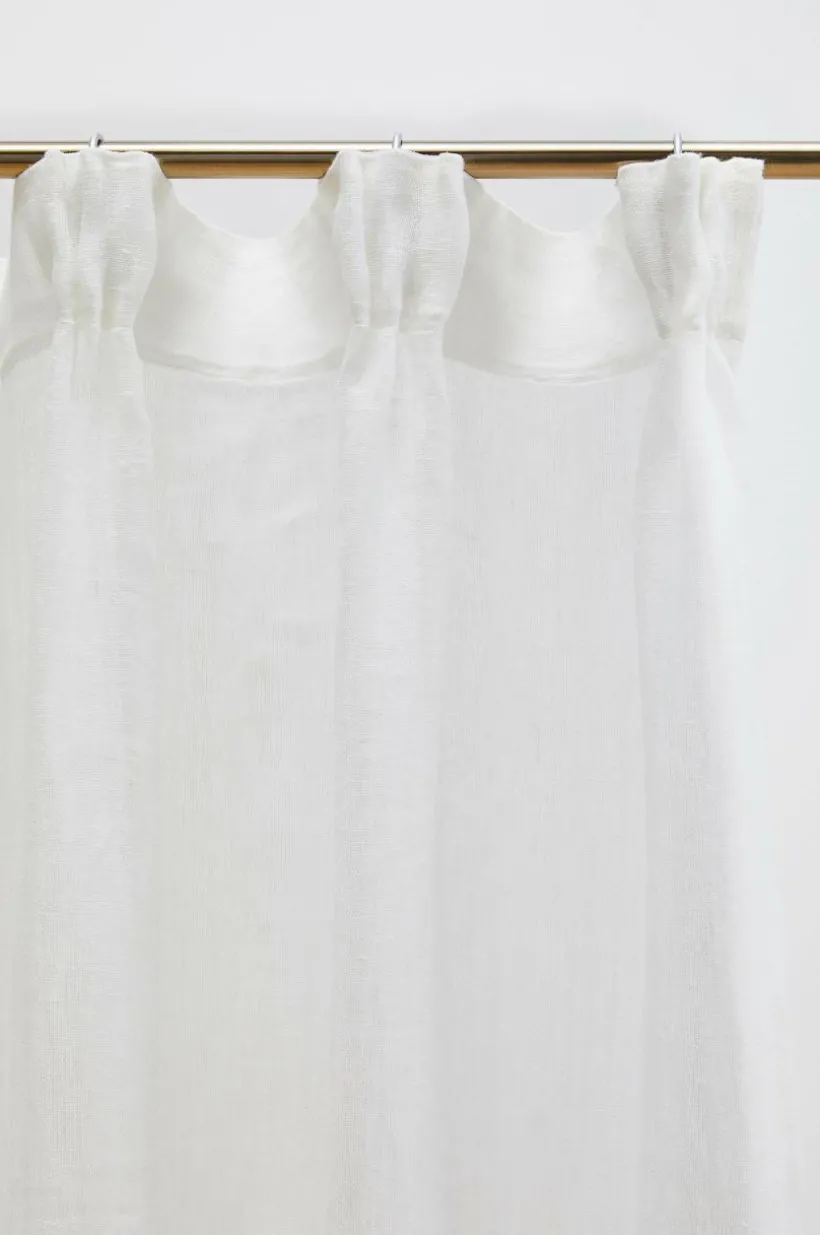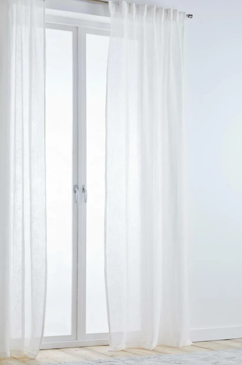 Två gardinlängder i luftigt linne med påsytt multifunktionsband. Gardinen kan hängas upp med fingerkrokar, kanal samt dold hälla.