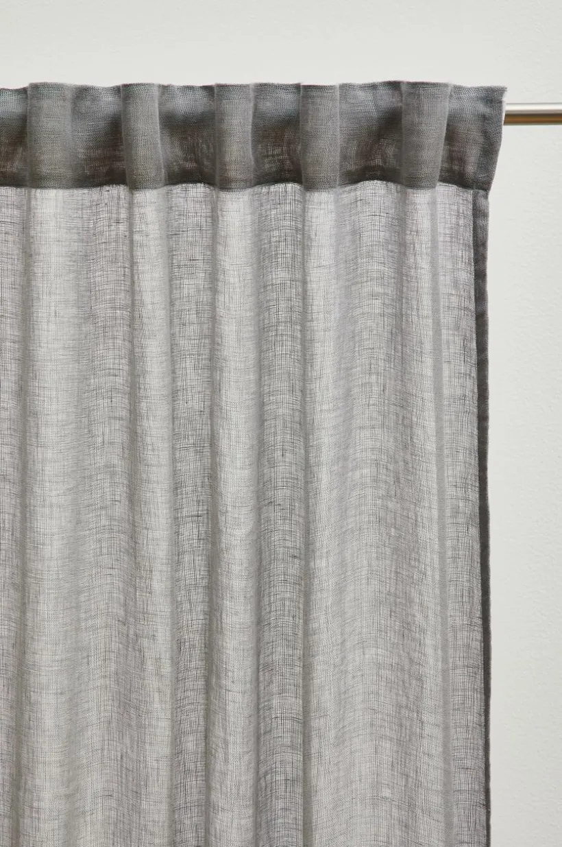 En gardinlängd i luftigt linne med påsytt multifunktionsband. Gardinen kan hängas upp med fingerkrokar, kanal samt dold hälla.