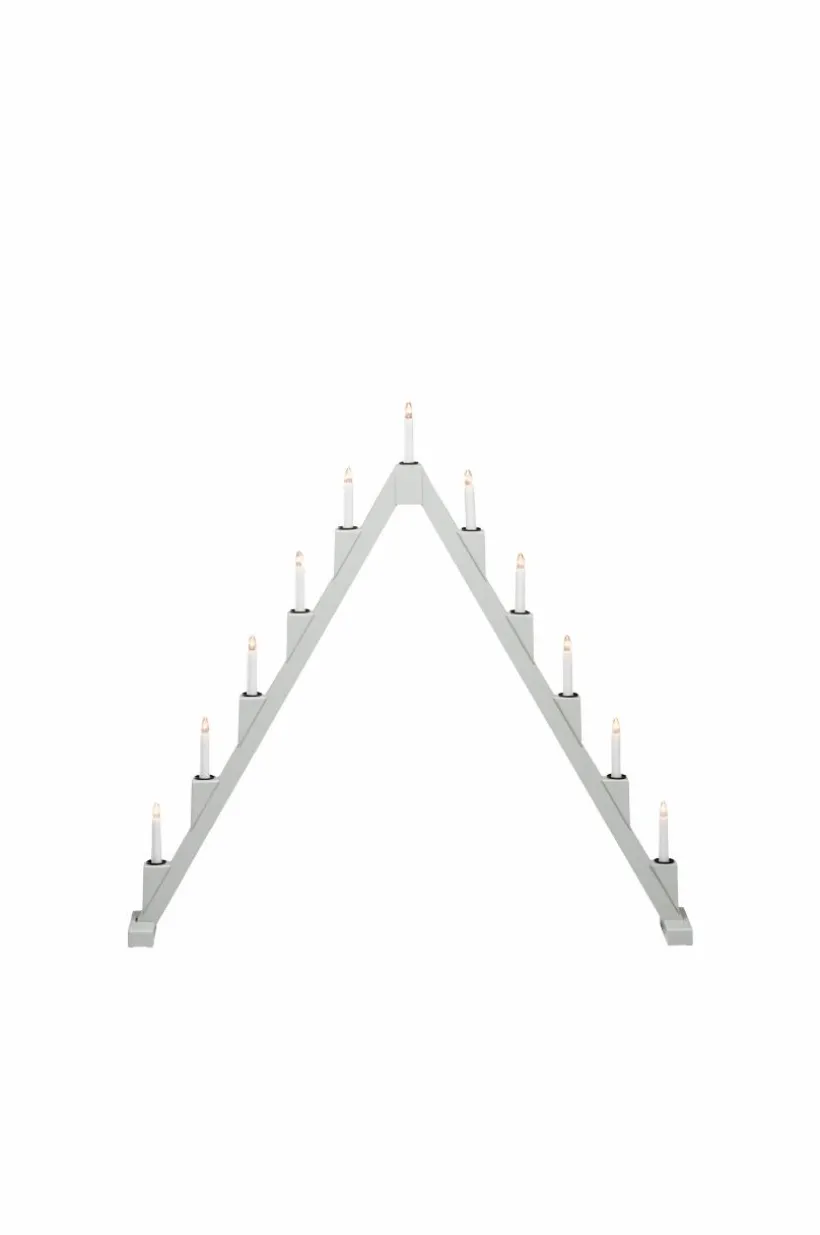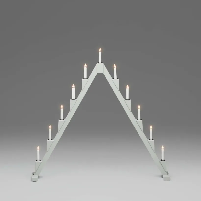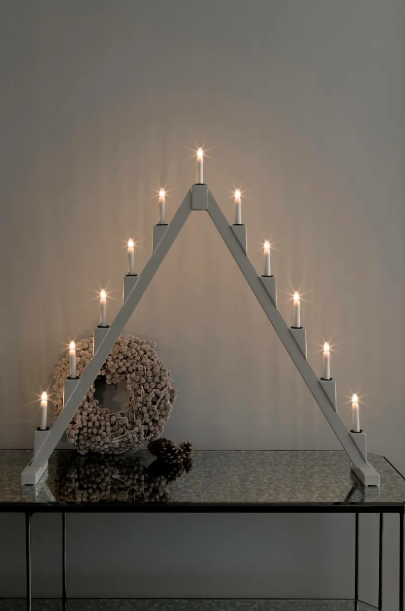 En 11-armad elljusstake i vitlackerat trä och mässingsfärgade deko ringar 230V. Vikbar med varmvita lampor. Anslutningssladd på 1,7 meter med sladdströmbrytare för manuell avstängning/påslagning. Höjd 82 cm och bredd 86 cm.