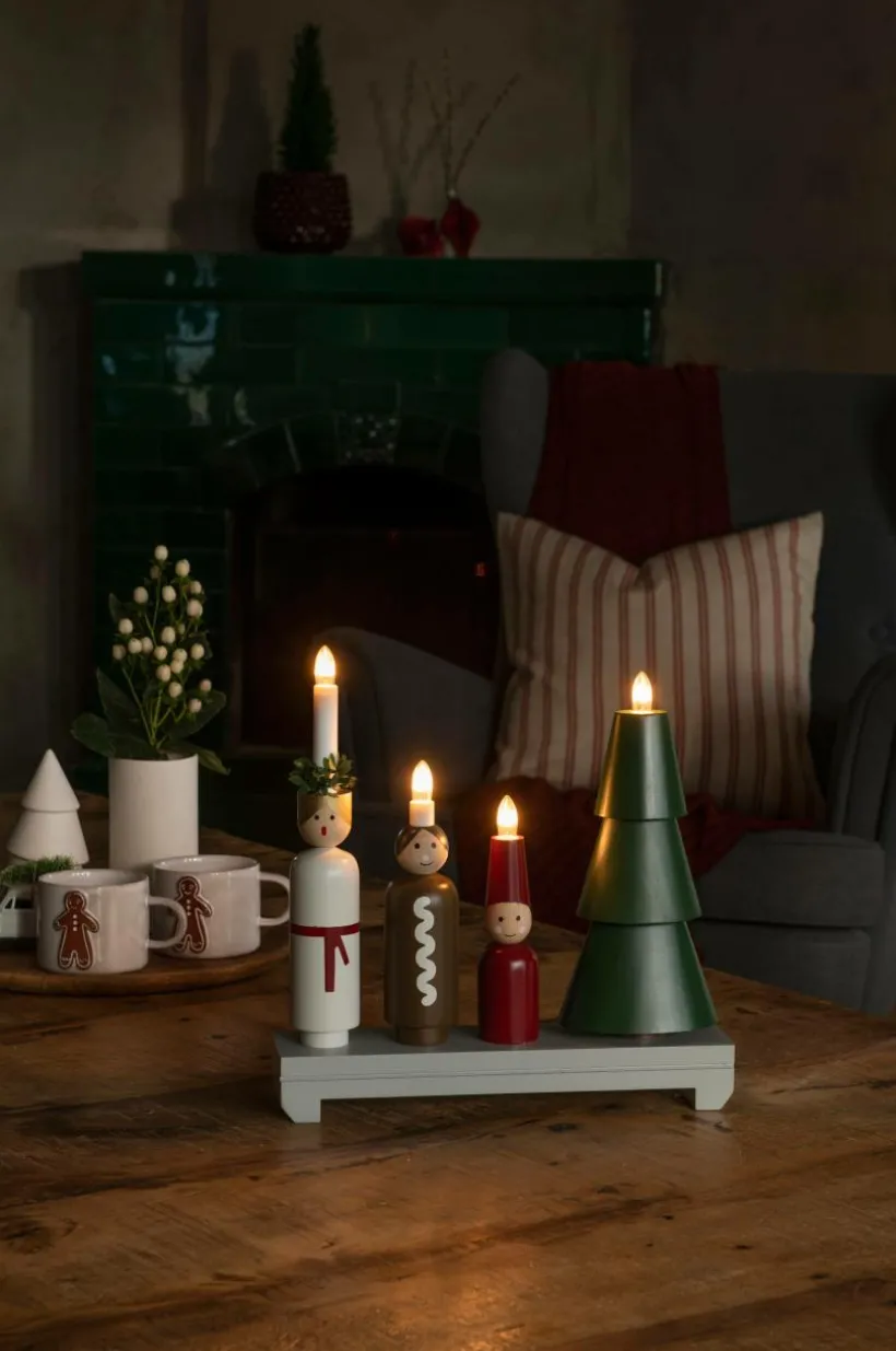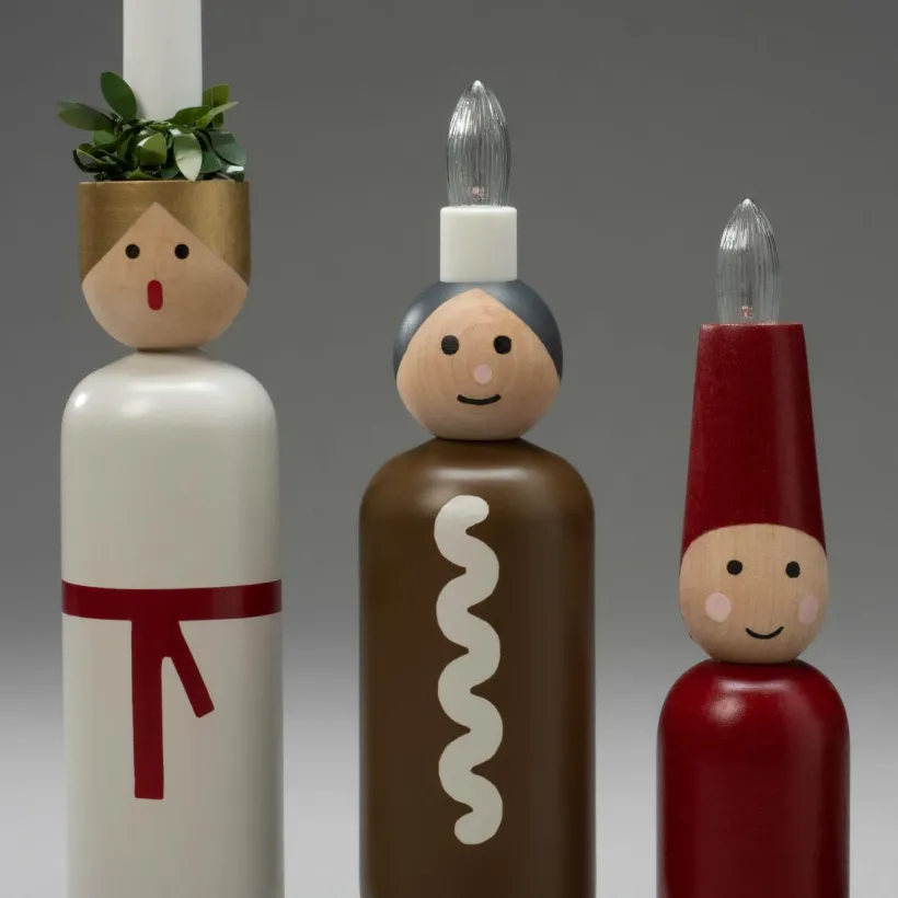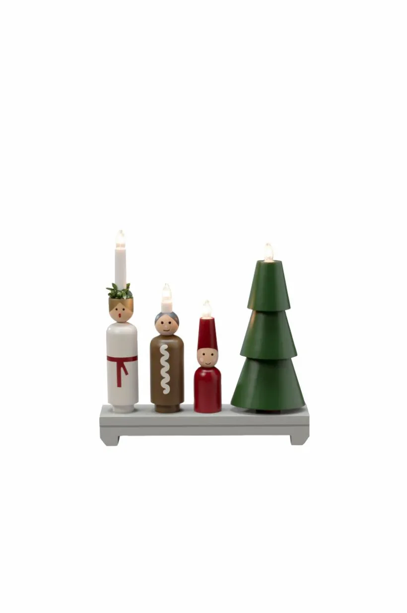 Skandinavisk designad elljustake i trä med luciatåg och gran. Ljusstaken är handmålad i matta färger. 4 st utbytbara ljuskällor som sitter i olika höjd. Anslutningskabel är 1,7 meter. Strömbrytare för manuell avstängning/påslagning. Höjd 29,9 cm och bredd 29 cm.