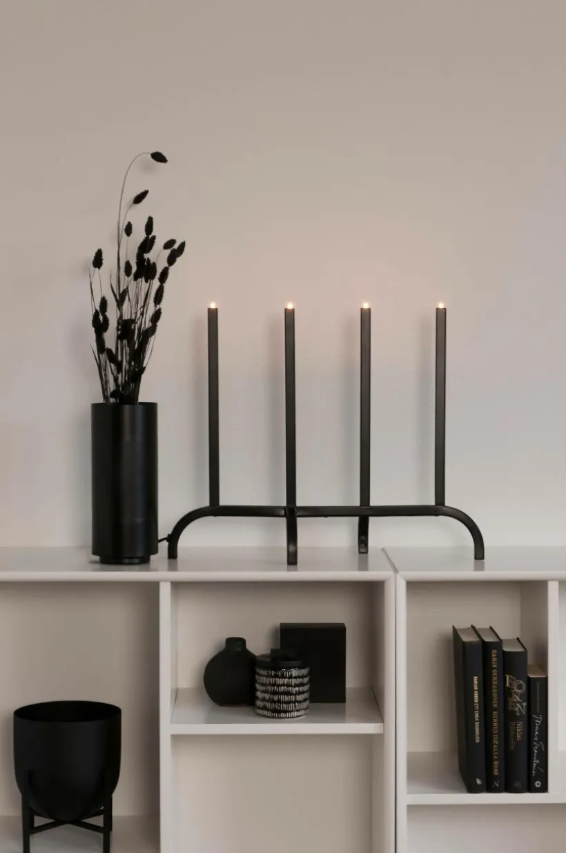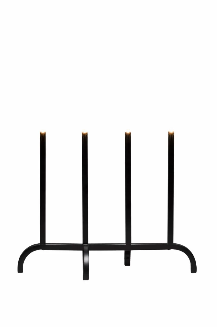 En 4 armad elljusstake i lackerad metall. Varmvita lampor. Drivs med en 12V transformator. Anslutningskabel på 2,4 meter med sladdströmbrytare för manuell avstängning/påslagning. Höjd 40,8 cm och bredd 50,4 cm.