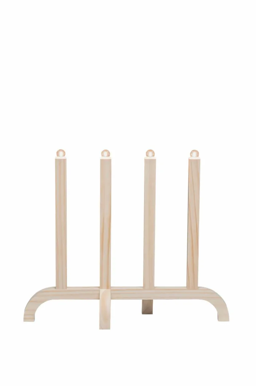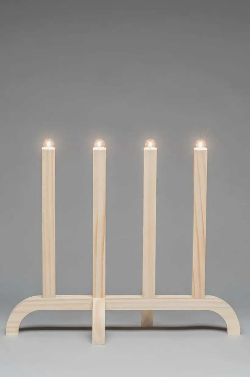 En 4 armad elljusstake i trä 230V. Varmvita lampor. Anslutningskabel på 1,7 meter med sladdströmbrytare för manuell avstängning/påslagning. Höjd 42 cm och bredd 50 cm.