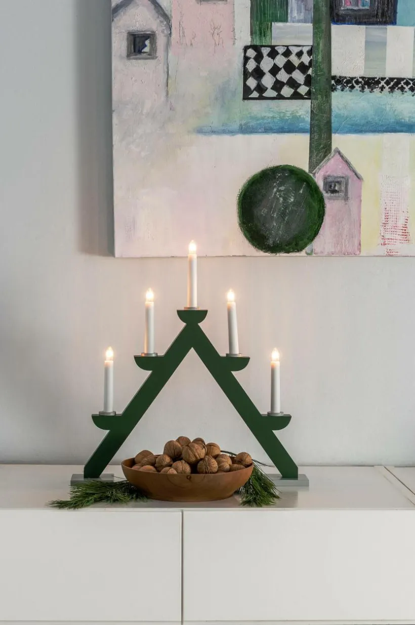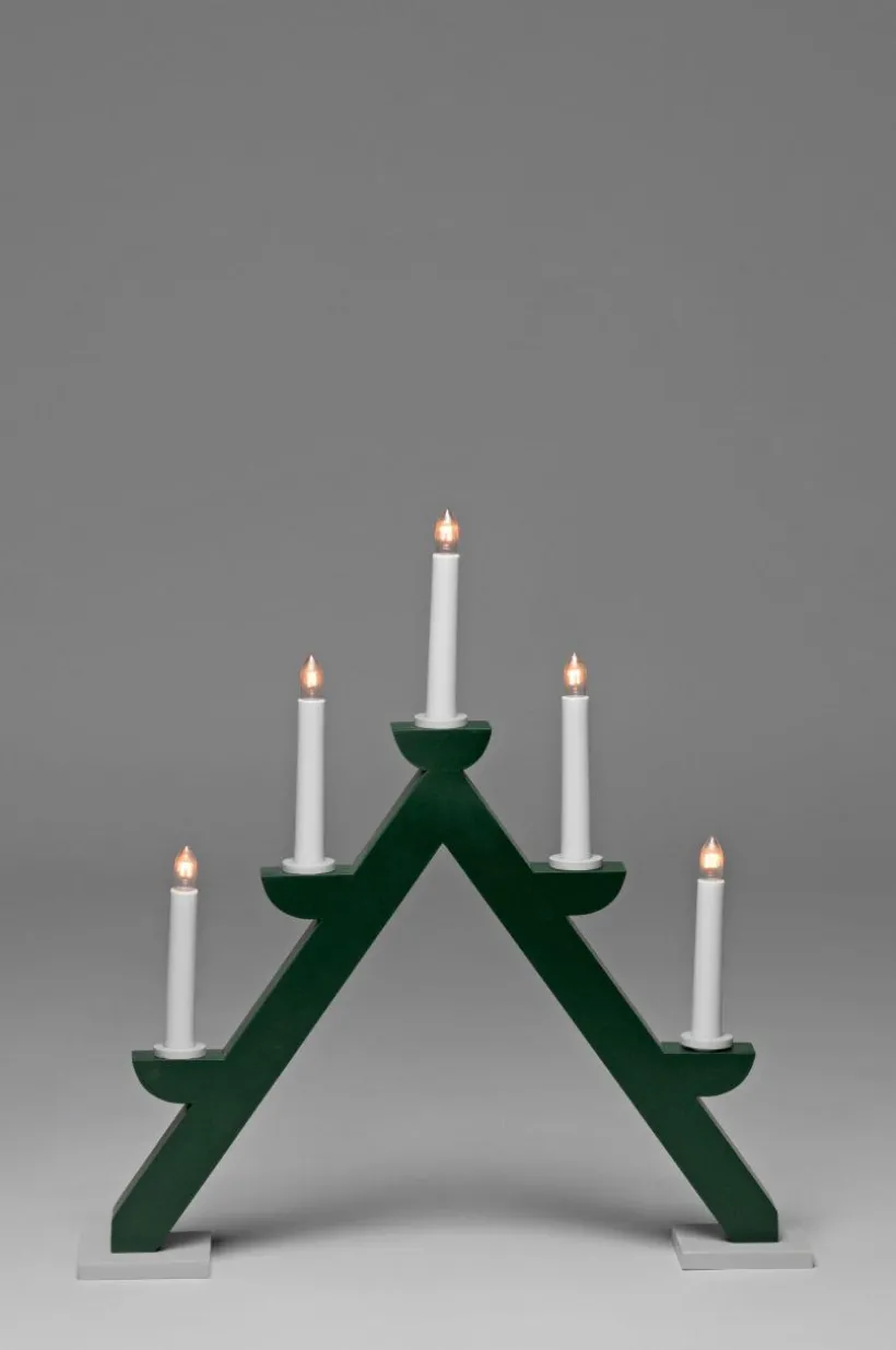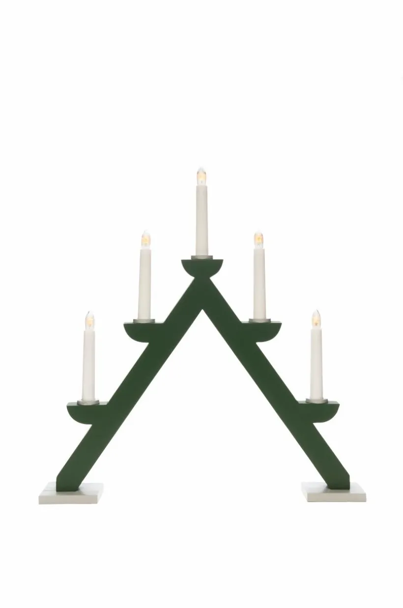 En 5 armad elljusstake i lackerat trä med dekorationsringar 230V. Varmvita lampor. Anslutningskabel på 1,7 meter med sladdströmbrytare för manuell avstängning/påslagning. Höjd 44 cm och bredd 42 cm.