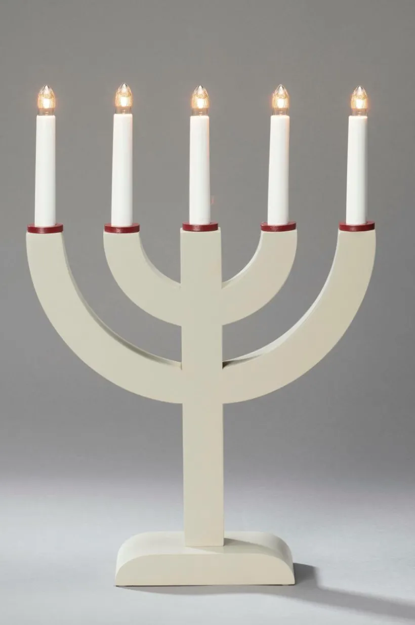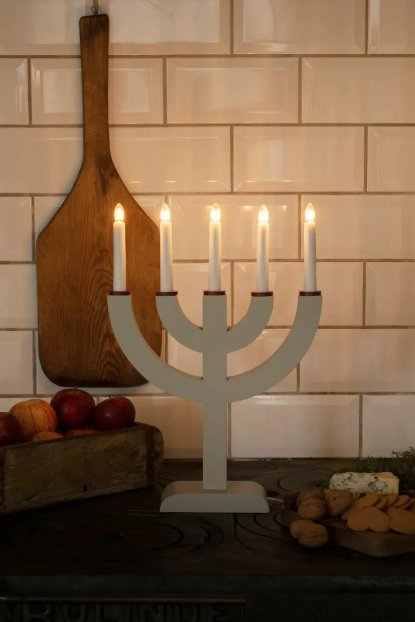 En 5 armad elljusstake i lackerat trä. Varmvita lampor.Anslutningssladd på 1,7 meter med sladdströmbrytare för manuell avstängning/påslagning. Höjd 41,7 cm och bredd 29 cm.
