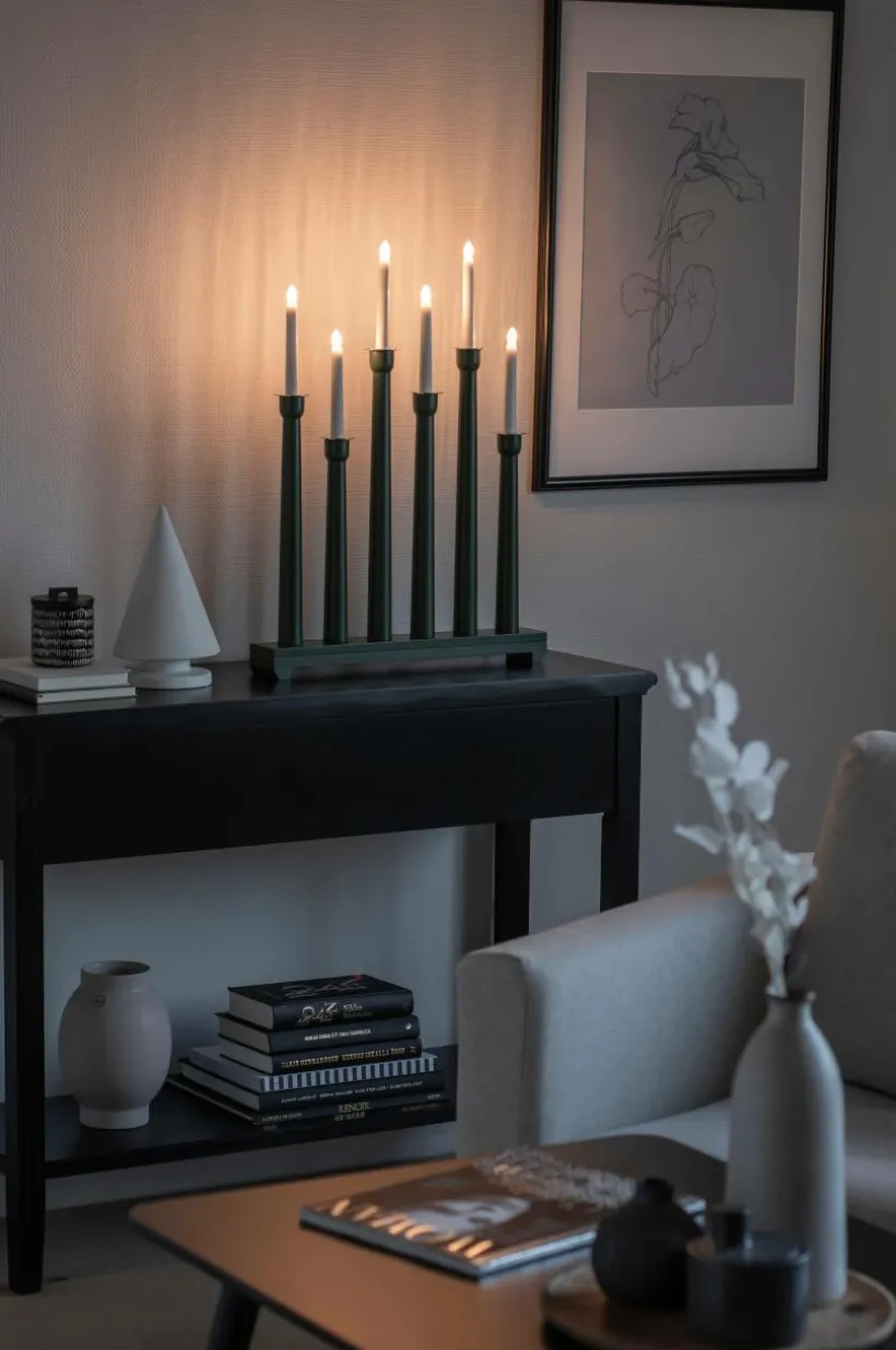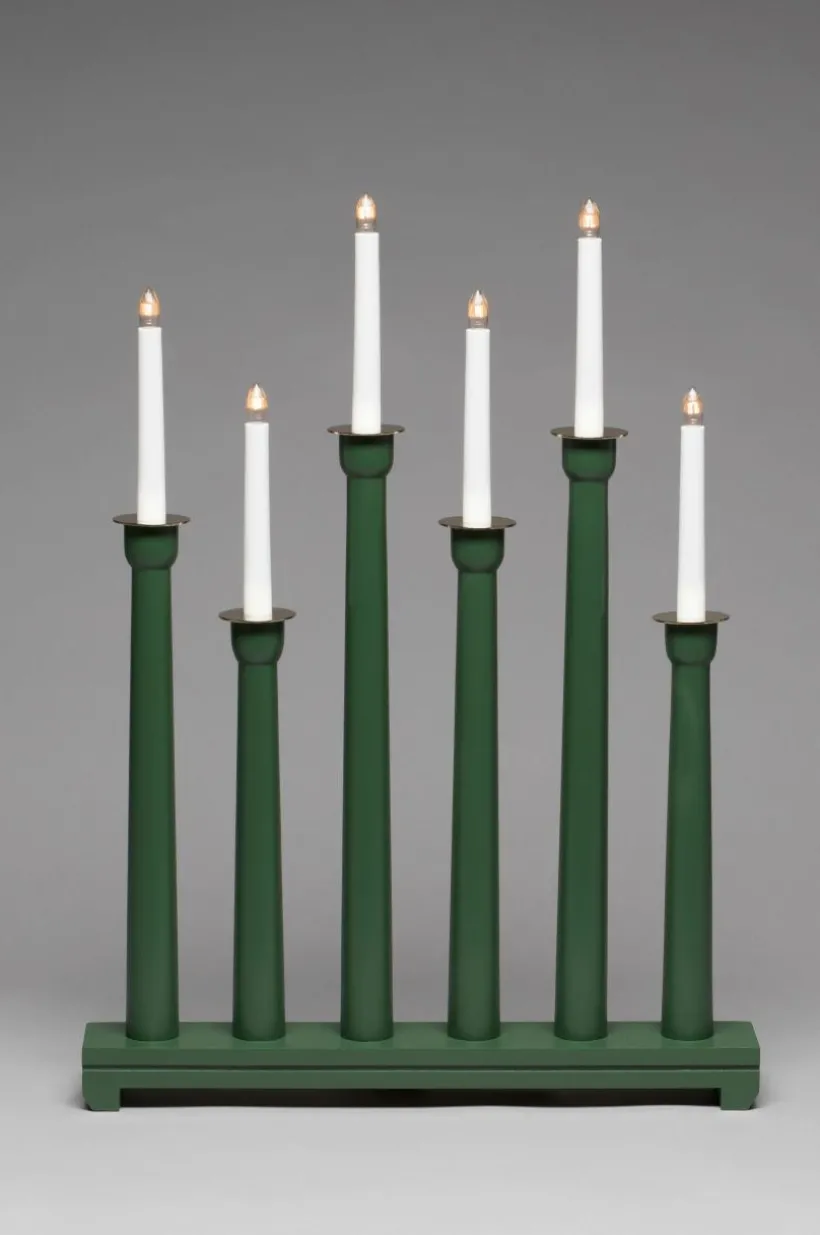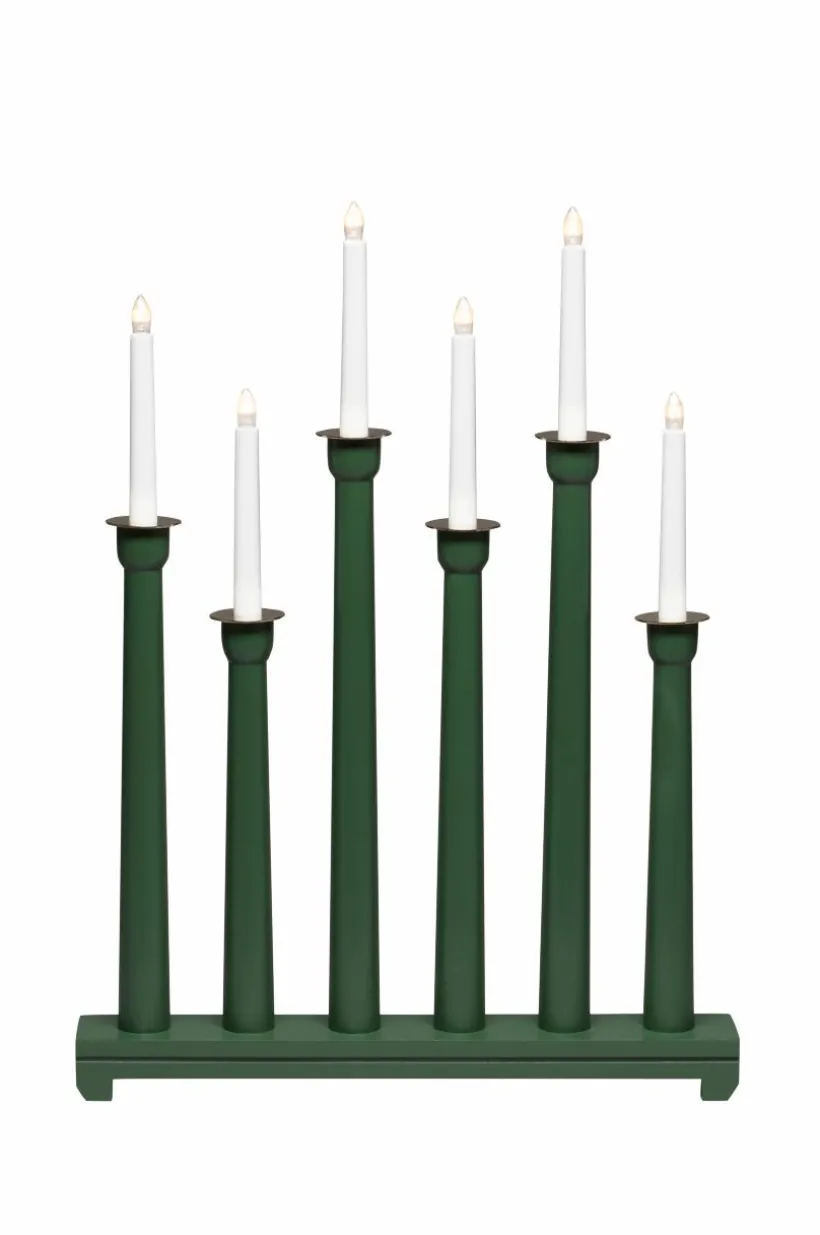 En 6 armad elljusstake i lackerat trä med dekorationsringar 230V. Varmvita lampor. Anslutningssladd på 1,7 meter med sladdströmbrytare för manuell avstängning/påslagning. Höjd 59 cm och bredd 44 cm.